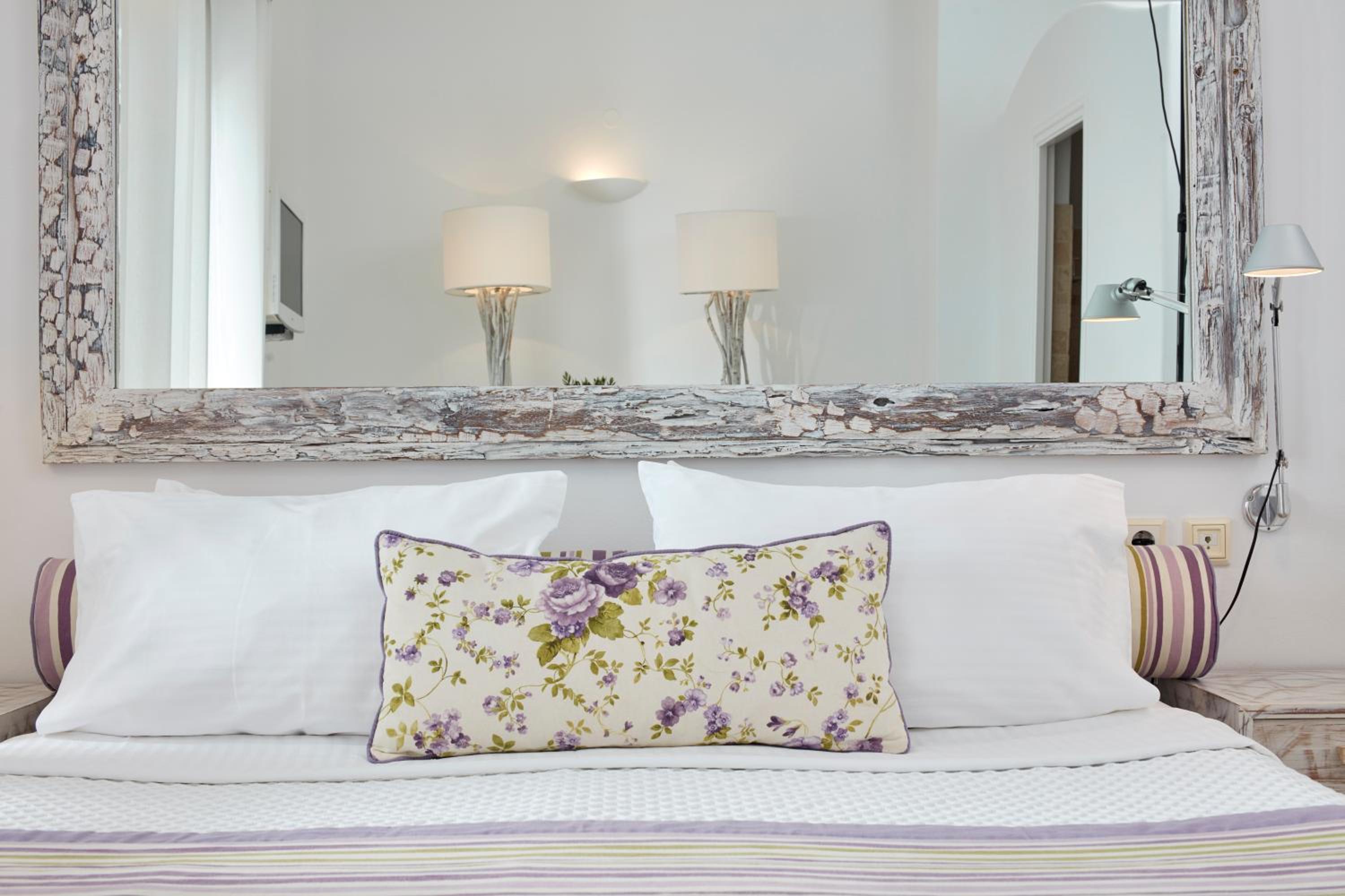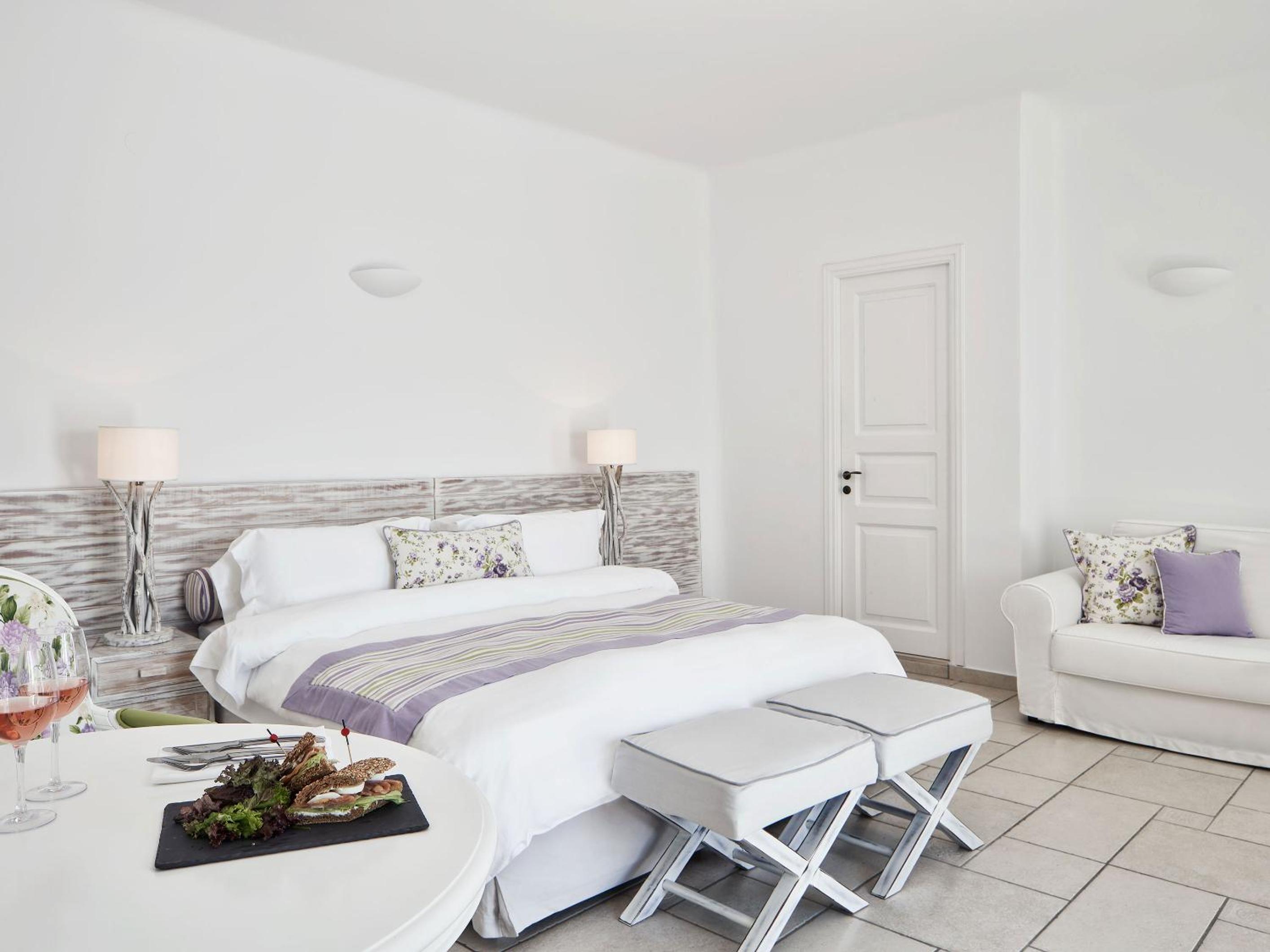 Indulge in luxury at San Antonio's romantically decorated suites that offer stunning views of the Caldera from private verandas. Each suite is equipped with modern amenities including a flat-screen TV, air conditioning, and plush bathrobes, ensuring a comfortable and memorable stay.
