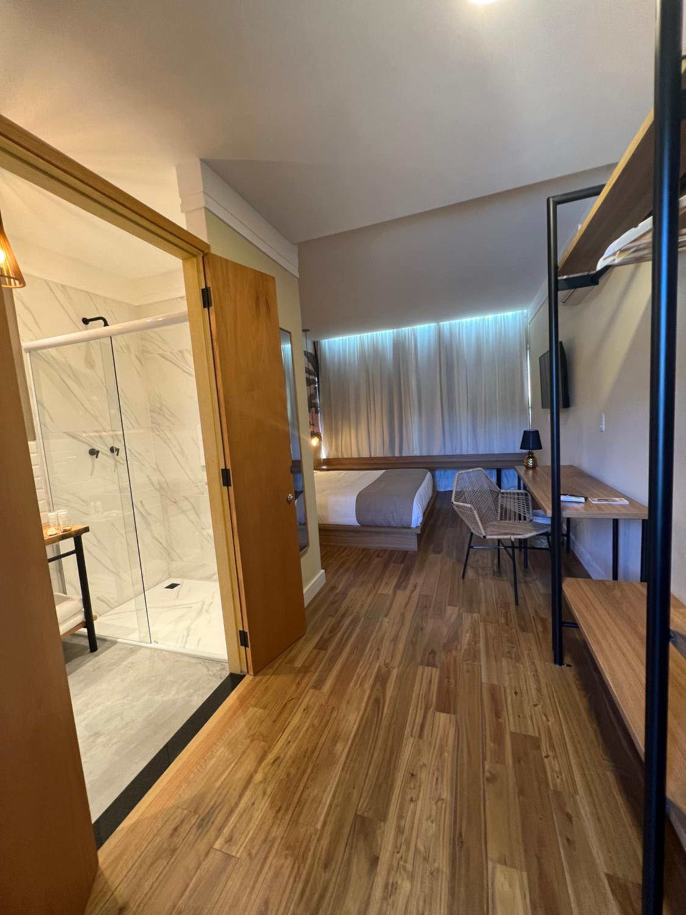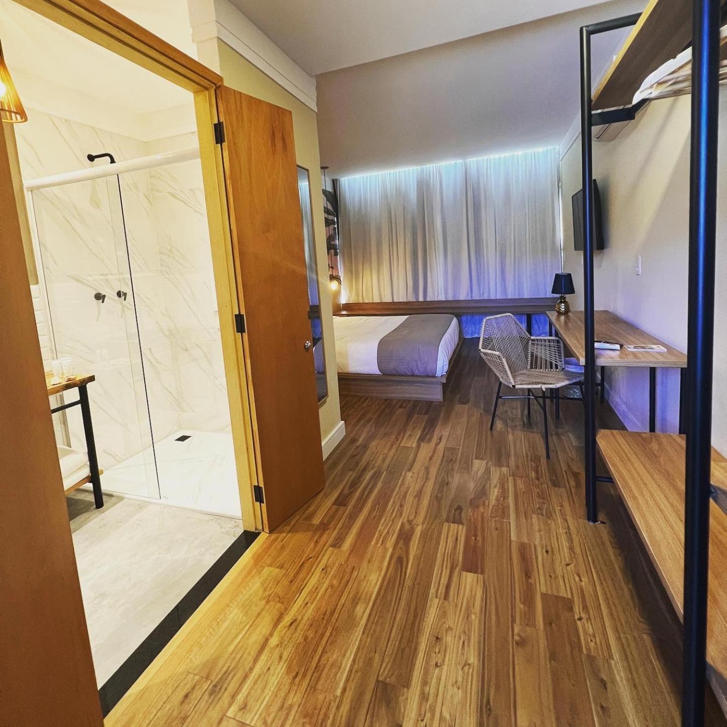 Quartos espaçosos, decoração clean, limpos, roupa de cama e de banho de excelente qualidade. Cama confortável e ducha com vazão incrível de água super quente.