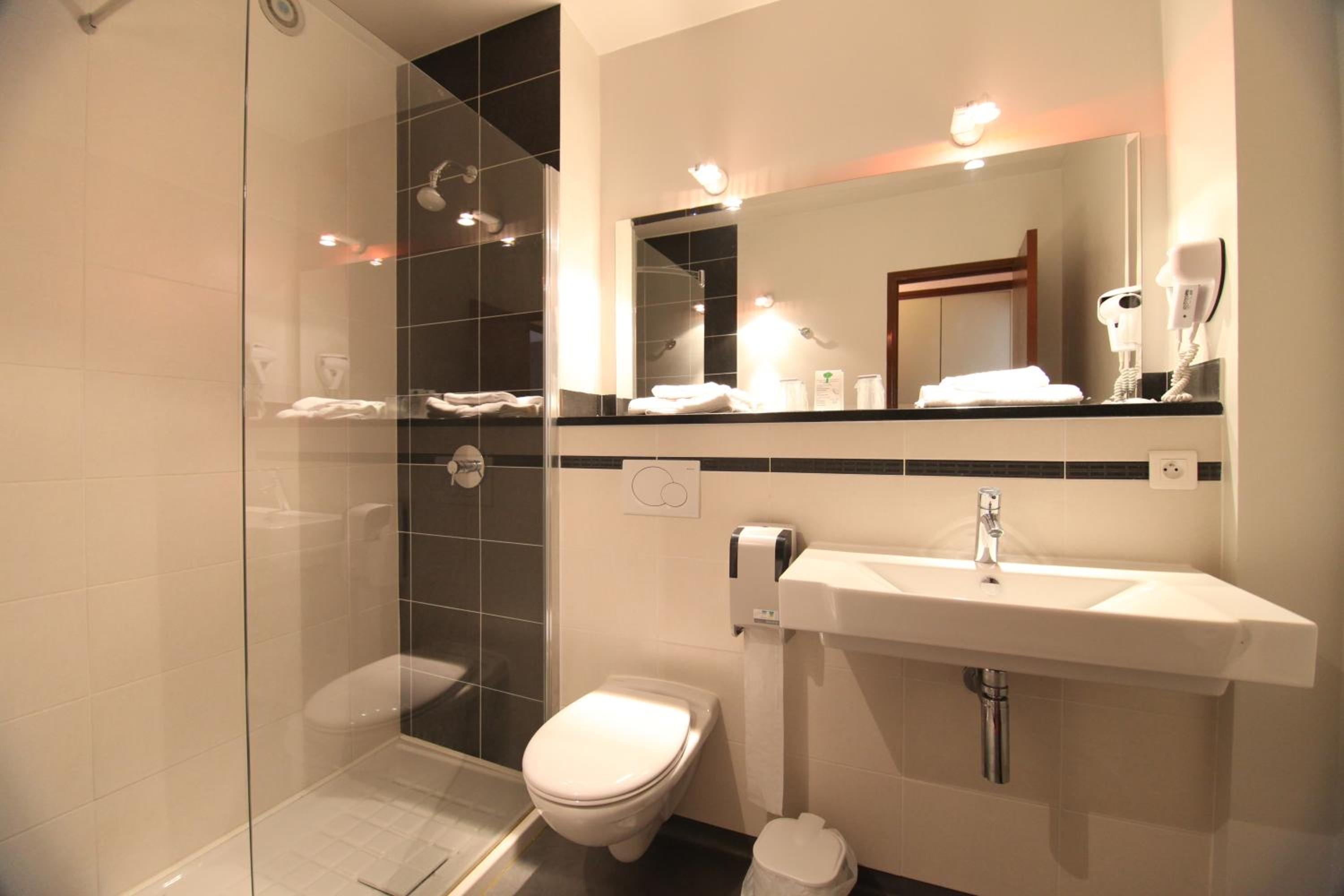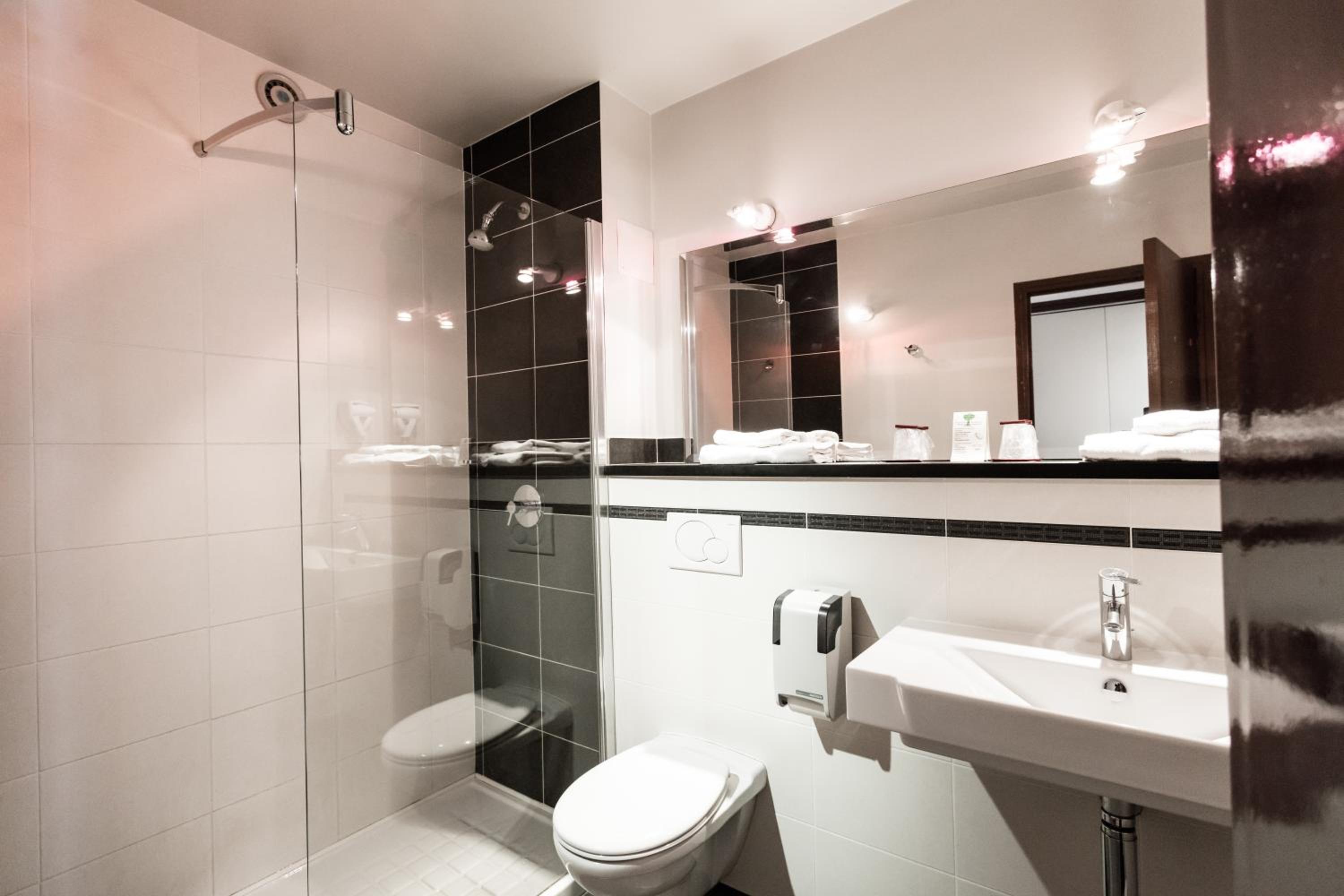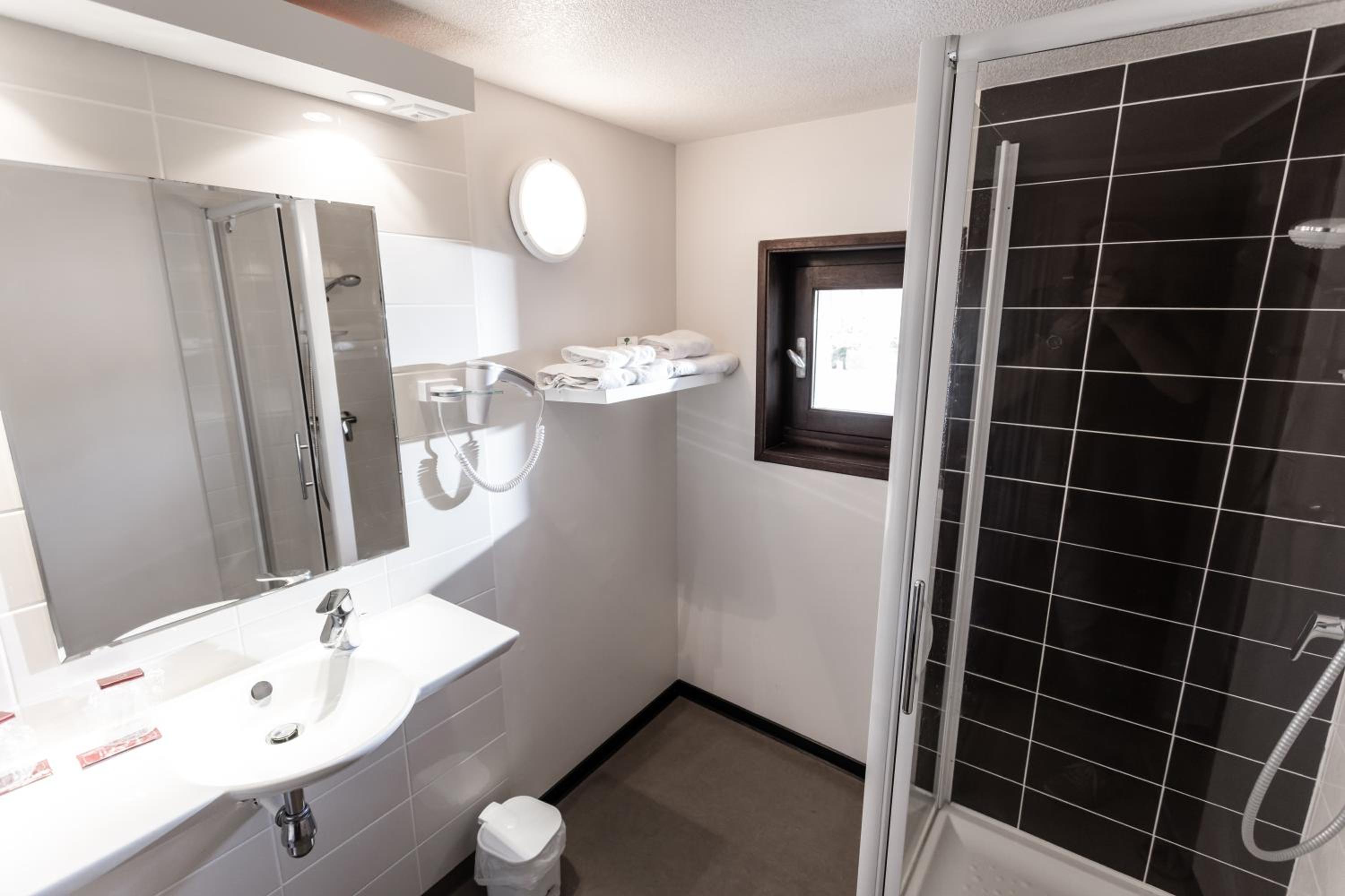 Côté hotellerie, belle salle de bain moderne propre et fonctionnelle.