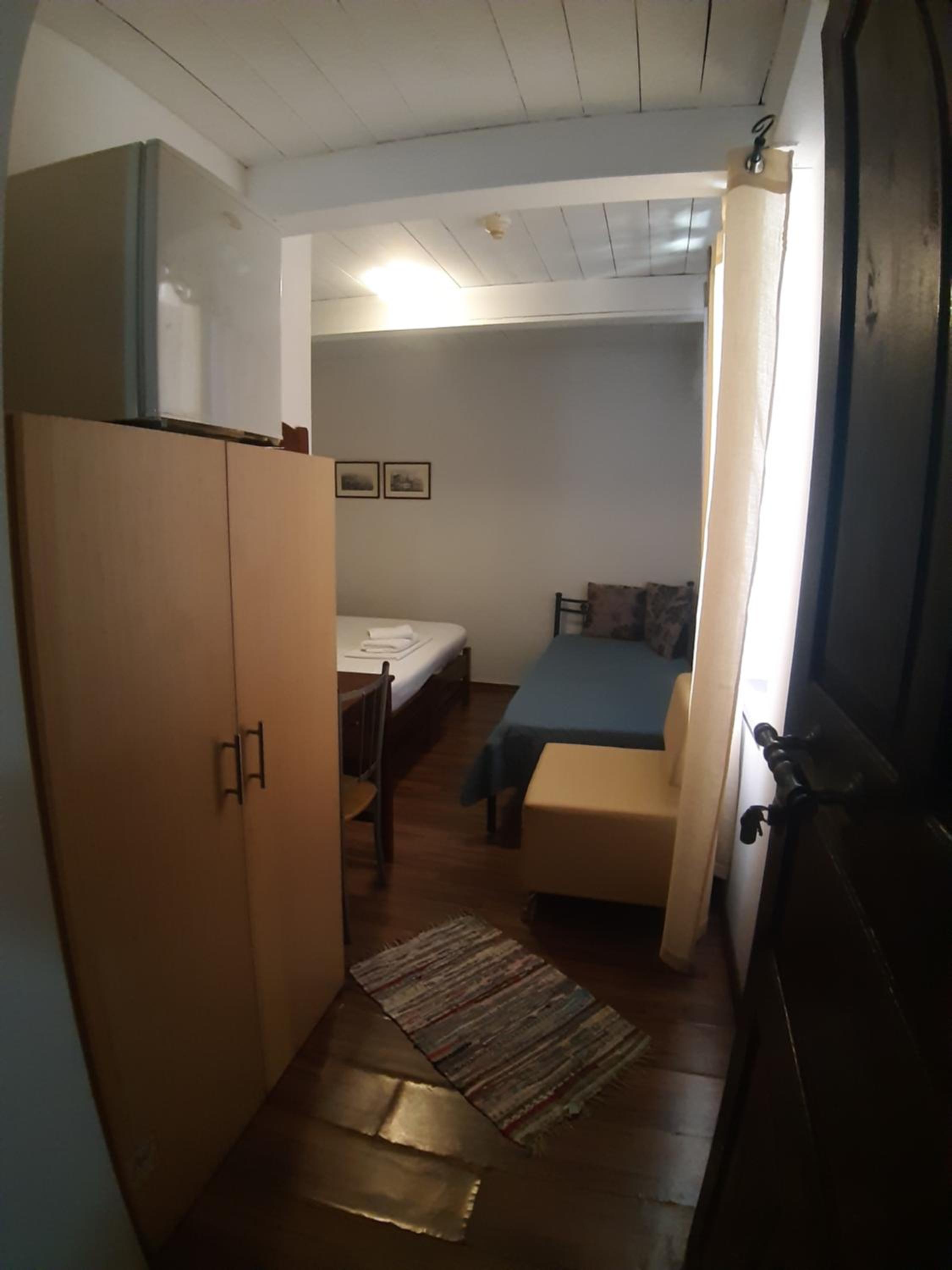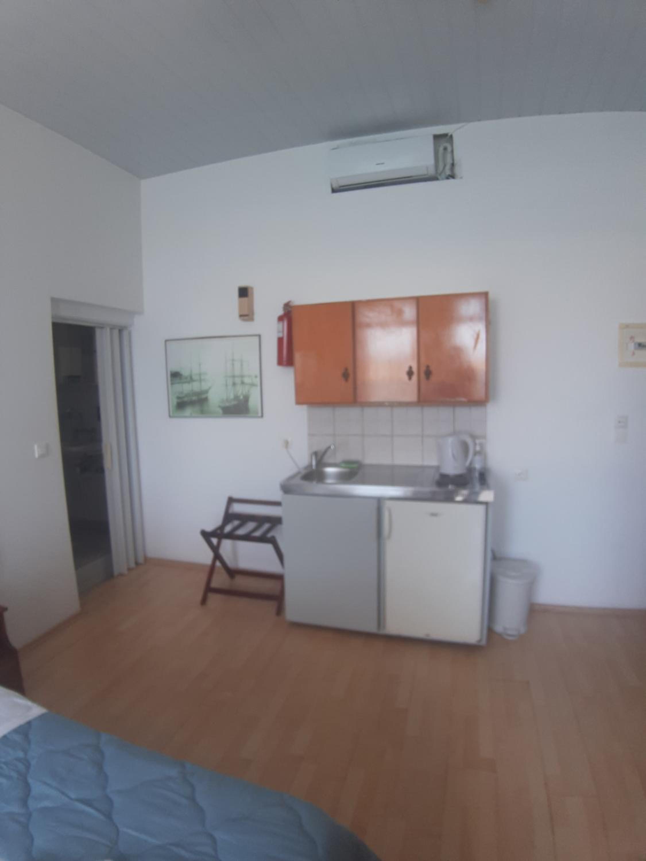 Der Kleiderschrank ist eher eine Wandablage. Unsere Kleider sind eine Woche lang im Koffer geblieben.