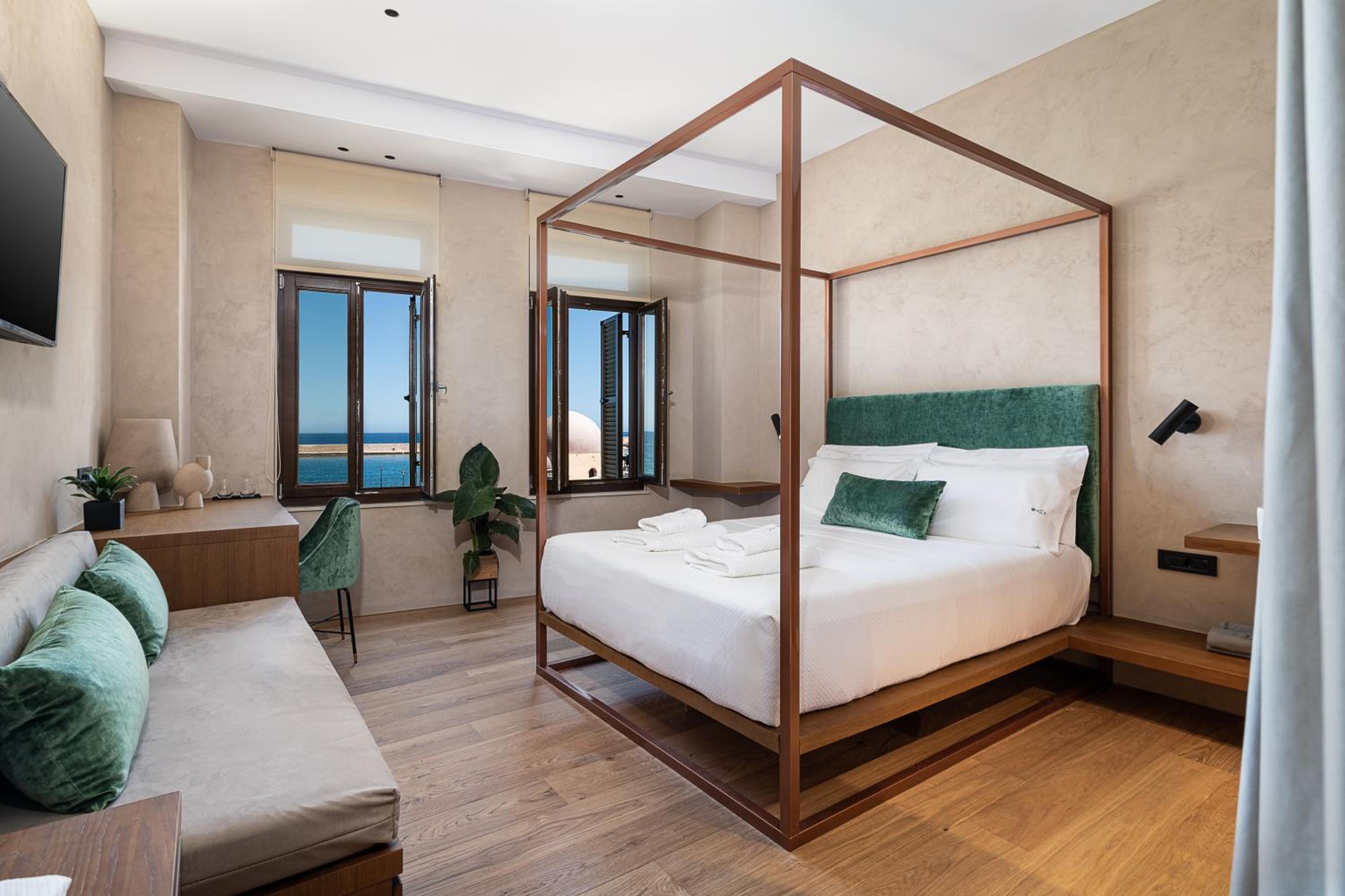 Indulge in a luxurious stay at Anassa Chania Boutique Hotel in the heart of Chania Town. Each guest room is beautifully appointed with modern amenities including air conditioning, flat-screen TV, and a private bathroom. Some rooms even offer stunning sea views from a private balcony.
