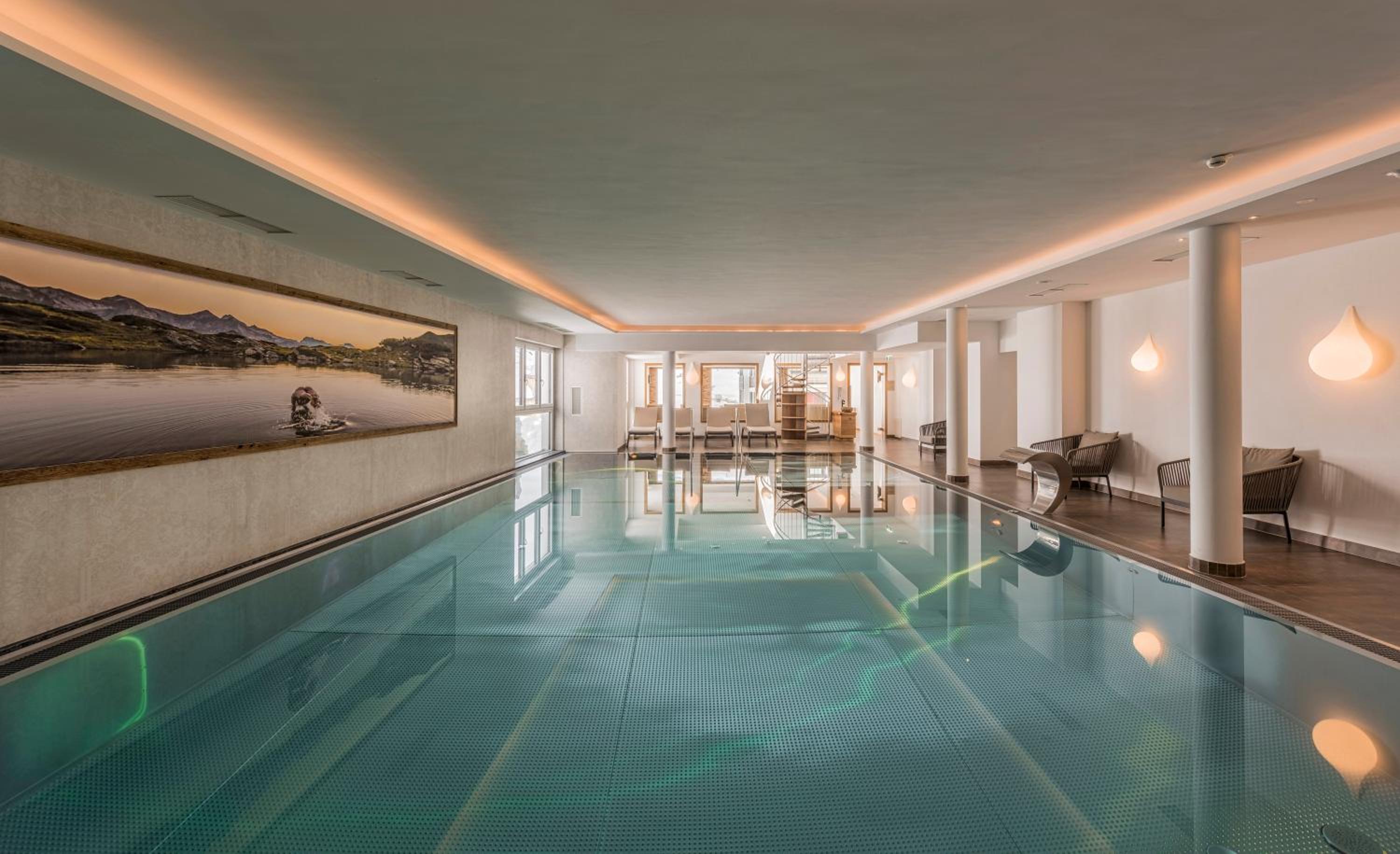 The pools and saunas are clean and well maintained. A special highlight is the outdoor whirlpool on the terrace above the pool—sitting in hot water, wearing a wool hat provided for you, enjoying the falling snow and the view of the surrounding mountains. Absolutely perfect.