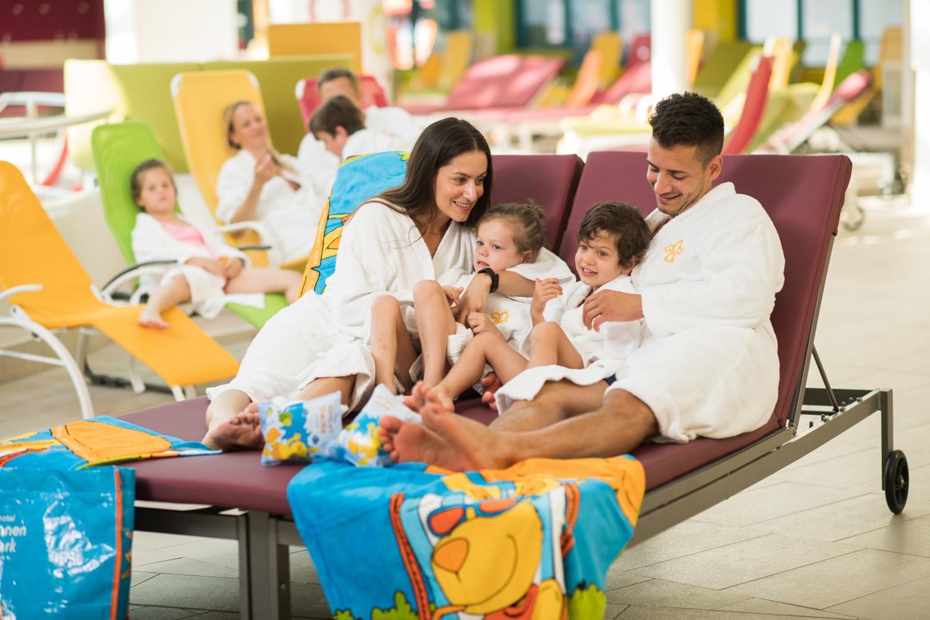 At Hotel Sonnenpark, experience a modern 4-star superior family hotel with exclusive access to the Sonnentherme and Sauna World throughout your stay. Enjoy the hotel's private bathing area with a guaranteed berth and complimentary rental of bathrobes, sauna towels, bikes, and inline skates for the whole family.