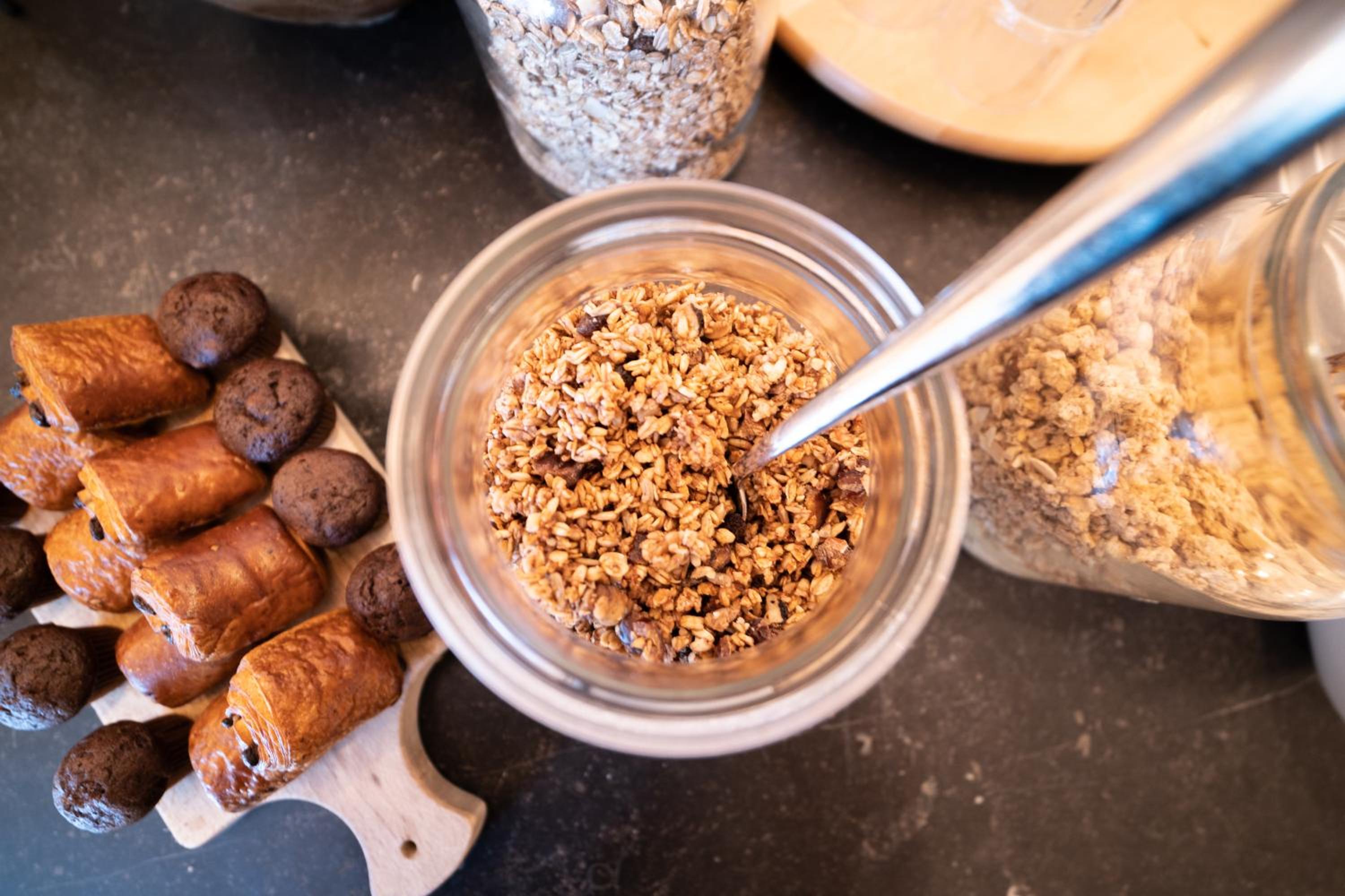 Ruime sortering bij het ontbijt. Verse producten. Koffie en thee onbeperkt beschikbaar.