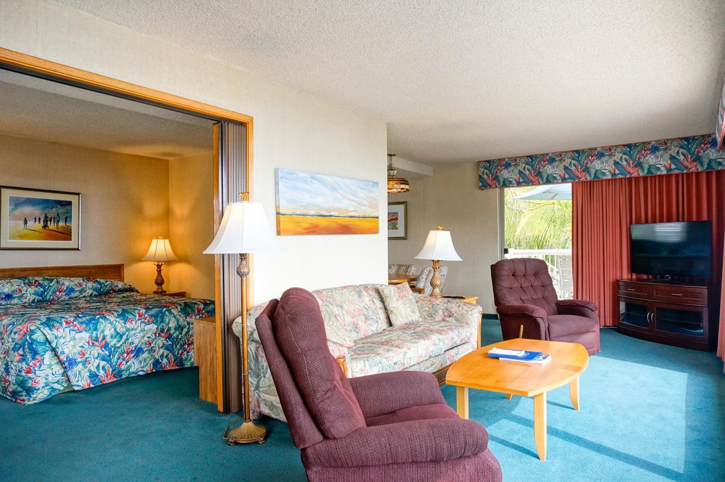 Enjoy cable TV, a fridge, and a cozy seating area in each room designed with a tropical flair.
