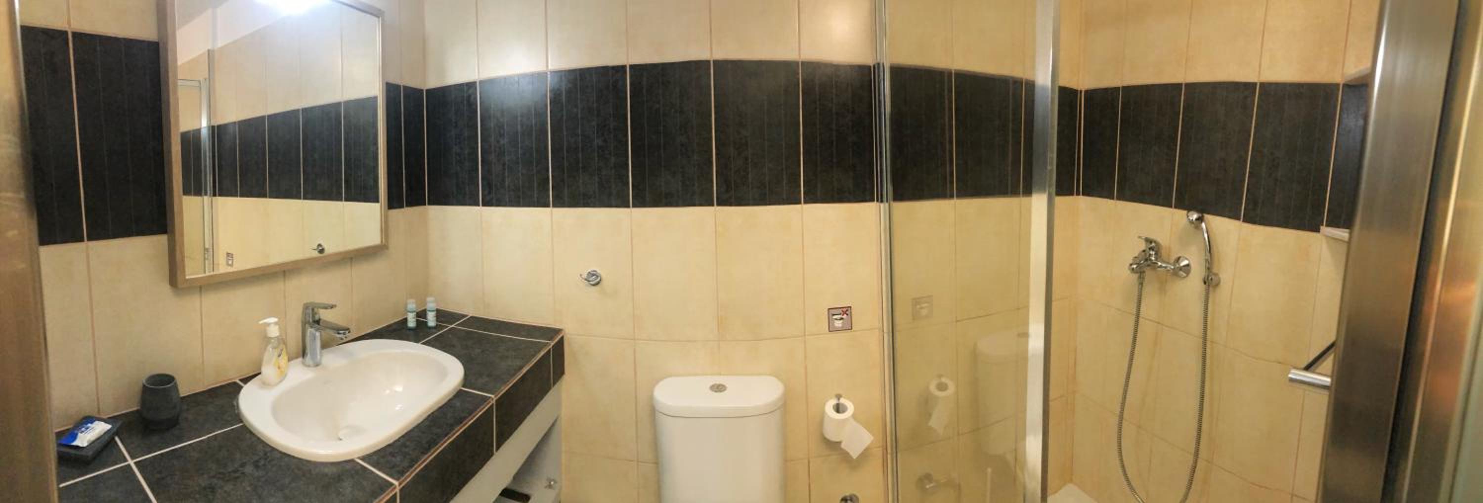 Con i prezzi non di certo economici non puoi far si che ci siano camere seminterrate nella tua struttura.Non devi avere perforza 1 o 2 camere in piu' se queste sono inagibili per i tuoi clienti! Fai dei depositi per gli attrezzi della tua piscina o una camera lavanderia che puo' tornare utilissima per la clientela! Se poi vuoi che sia una camera per i tuoi clienti allora questa non puo' costare solo 25% in meno ( pagato 112 euro a notte per fine agosto..per fortuna solo due notti!) rispetto alle altre che costavano 150 ma deve costare il 50% in meno e dunque 75 euro o,meglio ancora far si che non ci sia!C'era un fortissimo maleodore di scarico wc e la prima mattina,a farci compagnia appena svegli, abbiamo trovato un millepiedi da scarico di 10 cm circa!!!Anche la stanza era sporca: cassetti,armadio,sotto al letto.La doccia, seppur ampia come altezza e come cabina, mancava di un soffione classico sopra la testa e il doccino era vecchio e malfunzionante nonché con buina dose di calcare! Ripeto: non devi offrire l'upgrade al cliente ma devi offrire un alloggio sano,pulito in ottemperenza ai decreti sanitari non solo della Grecia ma internazionali.Dunque un consiglio al gestore: fai diventare quella camera un deposito e non offrirla ai tuoi clienti!Ps:trai vantaggio ed esperienza tu da recensioni giustamente negative! La camera non è economica perchè è costata 112€ a notte e soltanto 40 € in meno rispetto alle altre.Mi parli di pulizia ma un millepiedi da scarico è salito da uno sfiatatoio della fogna posizionato è tra i letti e l'armadio mica l'abbiamo messo noi!!Questa camera che hai devi farla diventare un deposito e non offrirla ai clienti perchè non risponde ai parametri igienico sanitari.Ti è chiaro? A questo punto manderò una mail alla direzione del ministro greco della sanità.