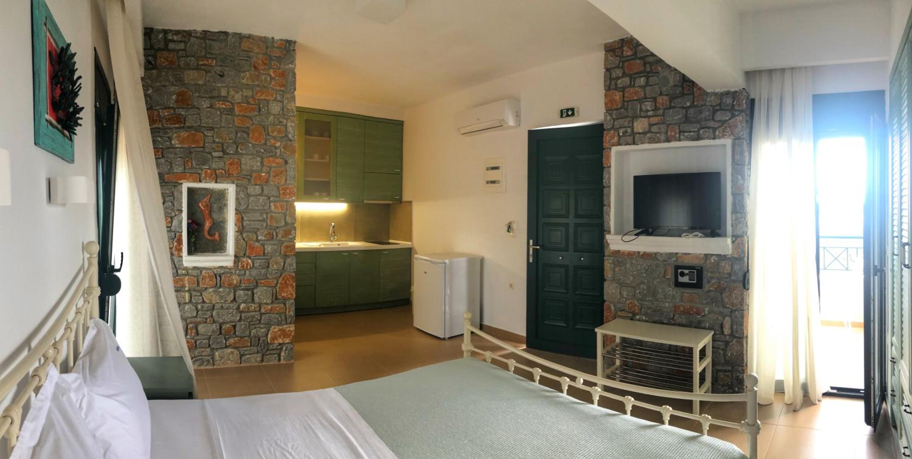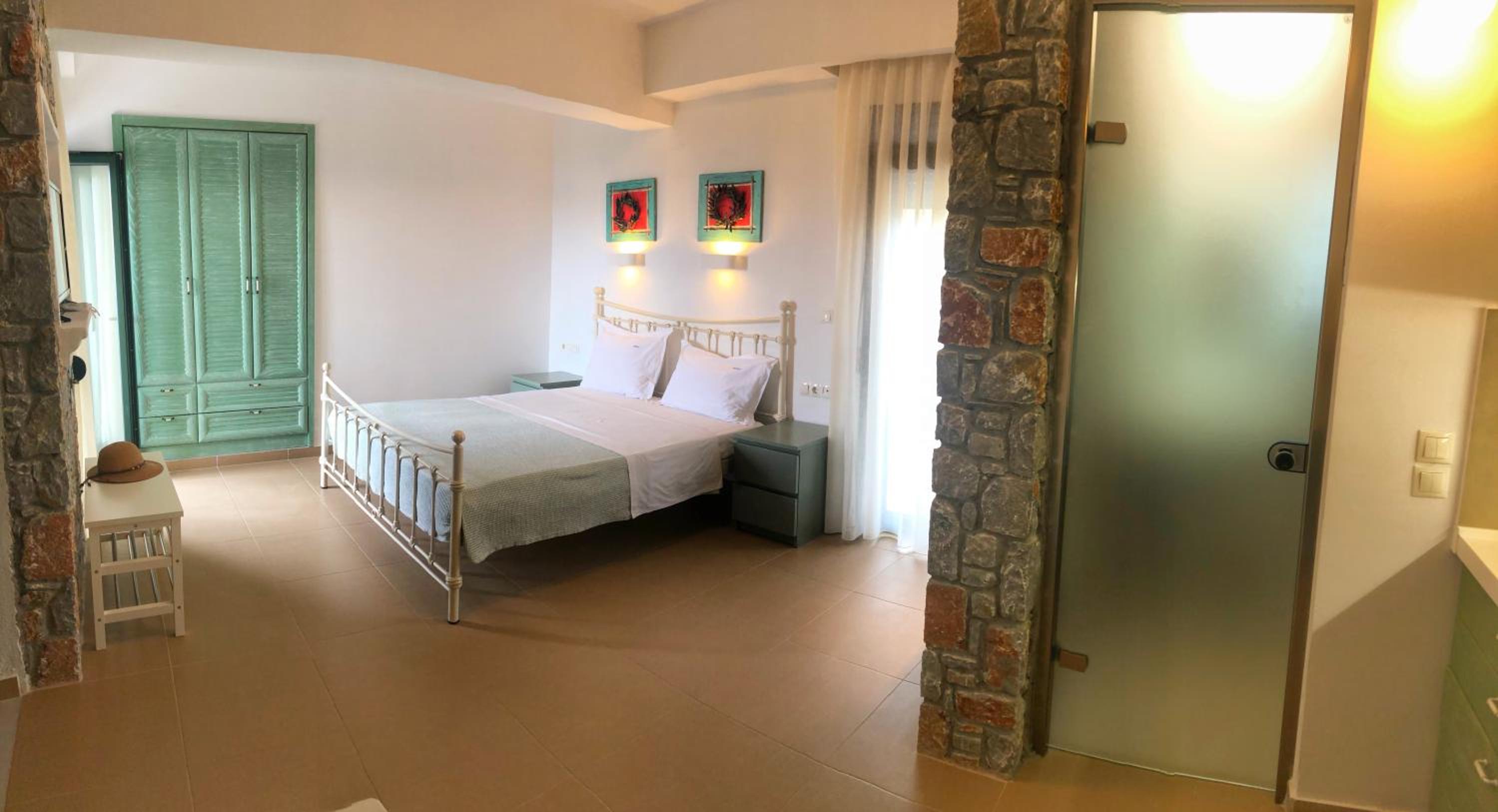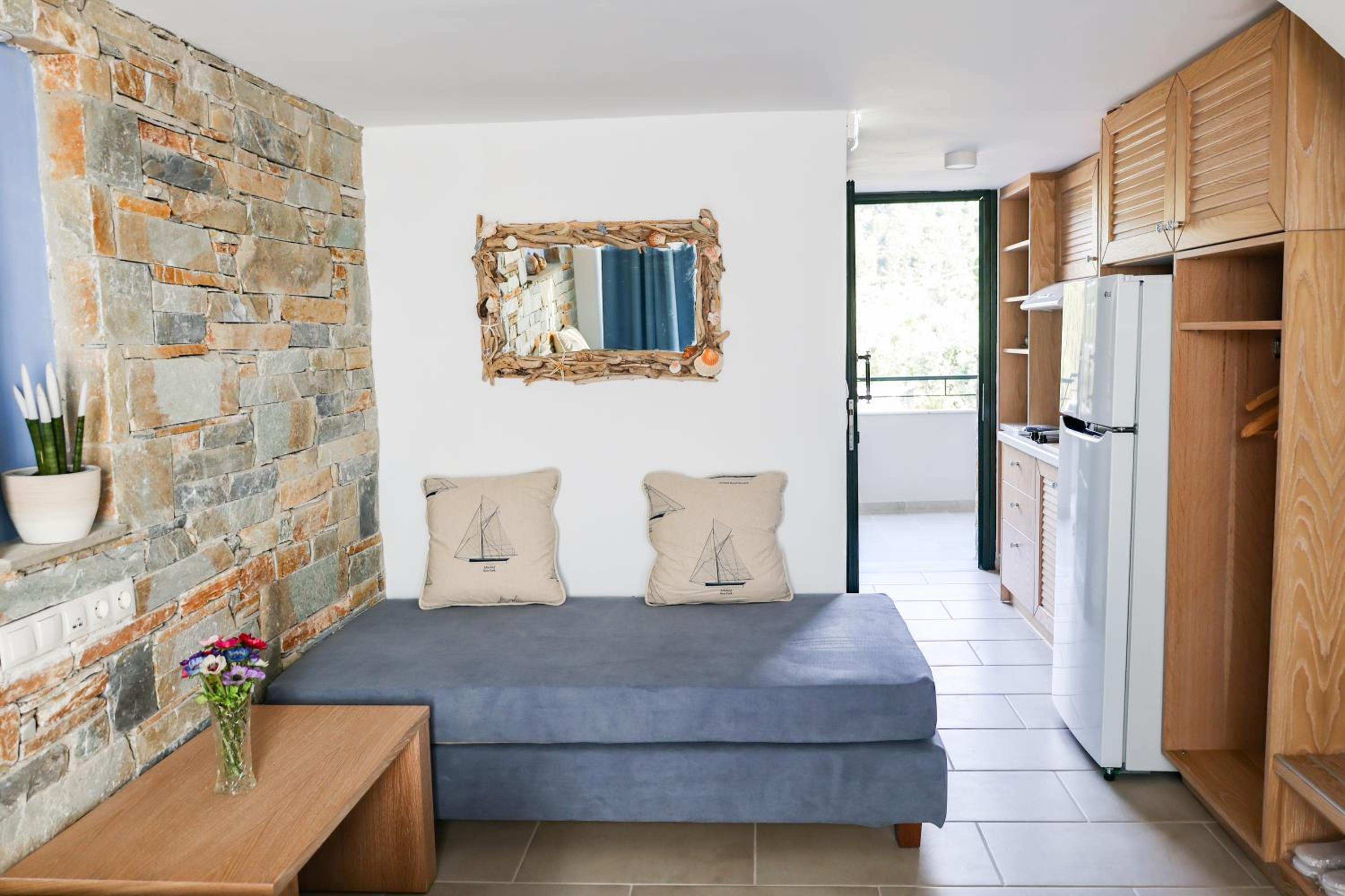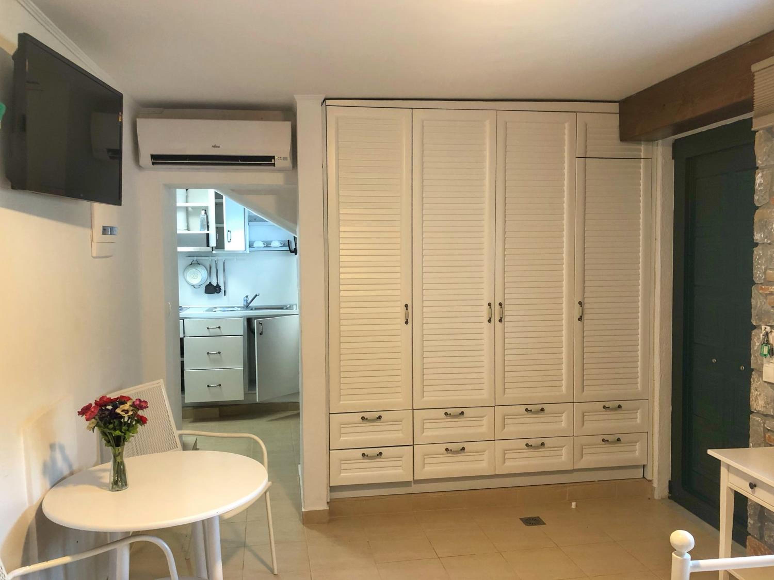 Overall, good accommodation, close to bus stop 9 and the beautiful Achladies beach. The apartments are about a 5-minute walk uphill from the bus stop. The room is well equipped with a kitchenette, which we used for breakfast but it’s also fine for simple lunches. Just note there’s no microwave or oven. For groceries, you can easily order through Wolt from a larger supermarket, delivery is quick, fresh, and much cheaper than the nearby mini markets.