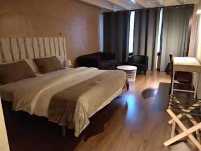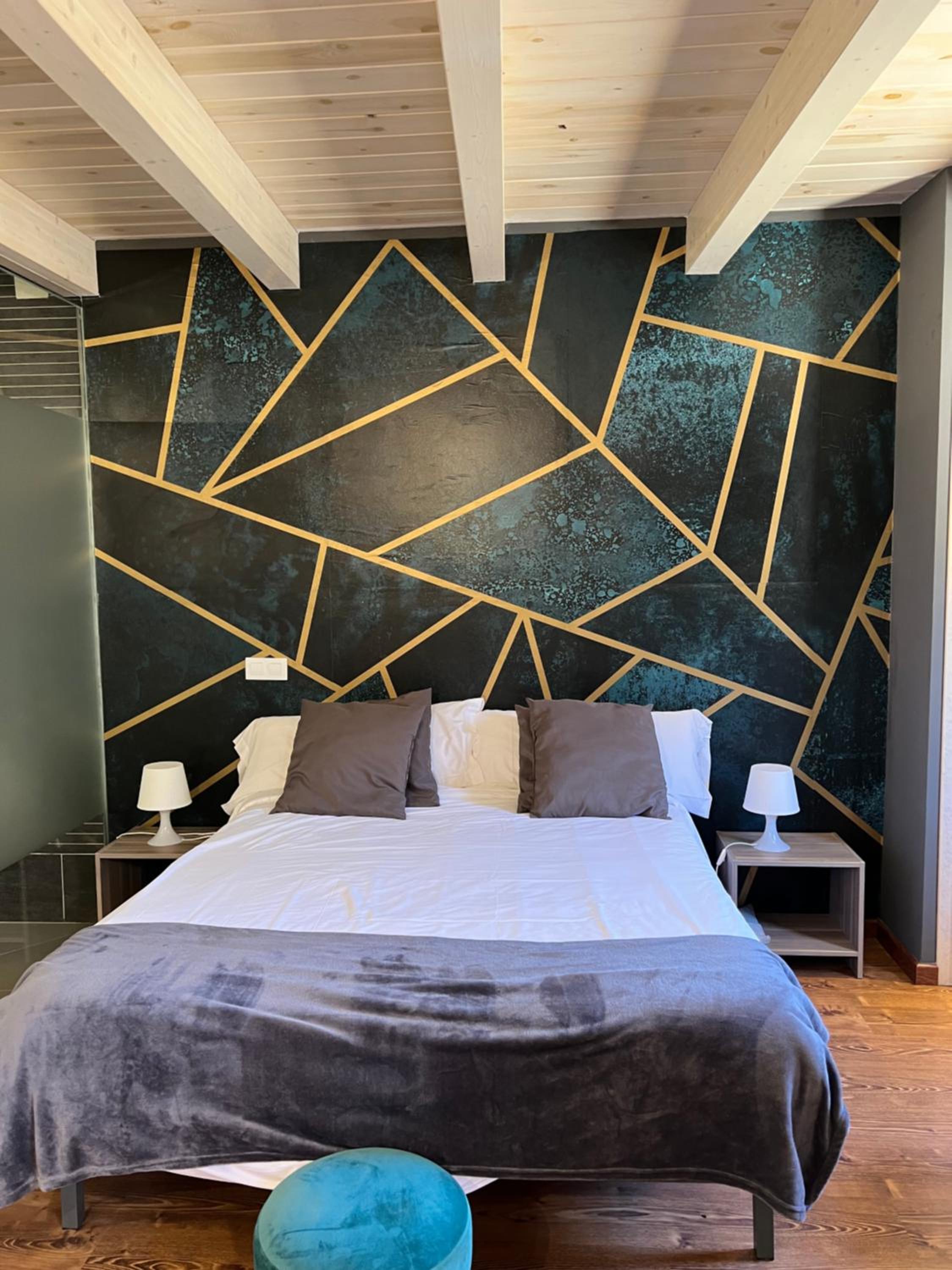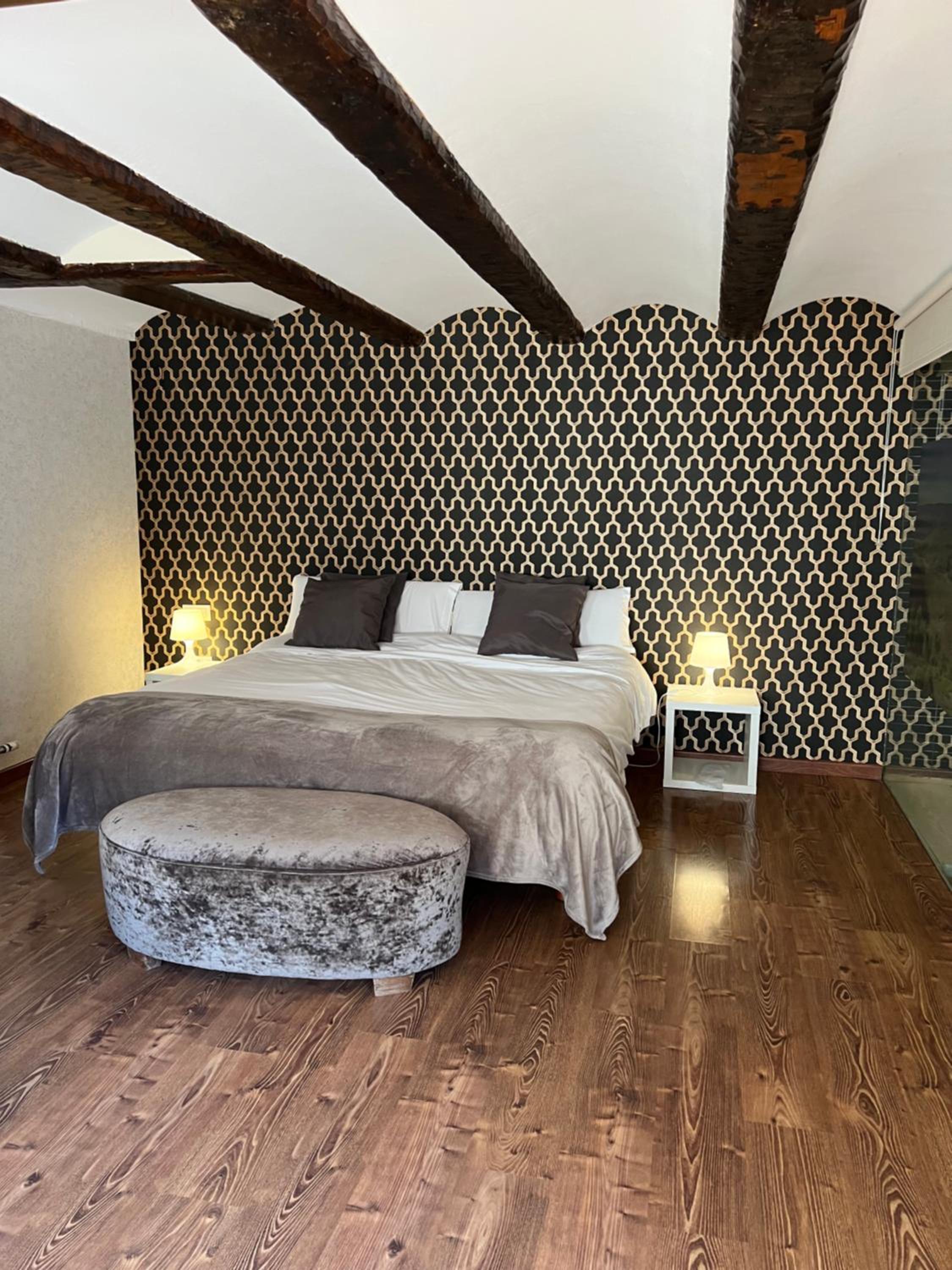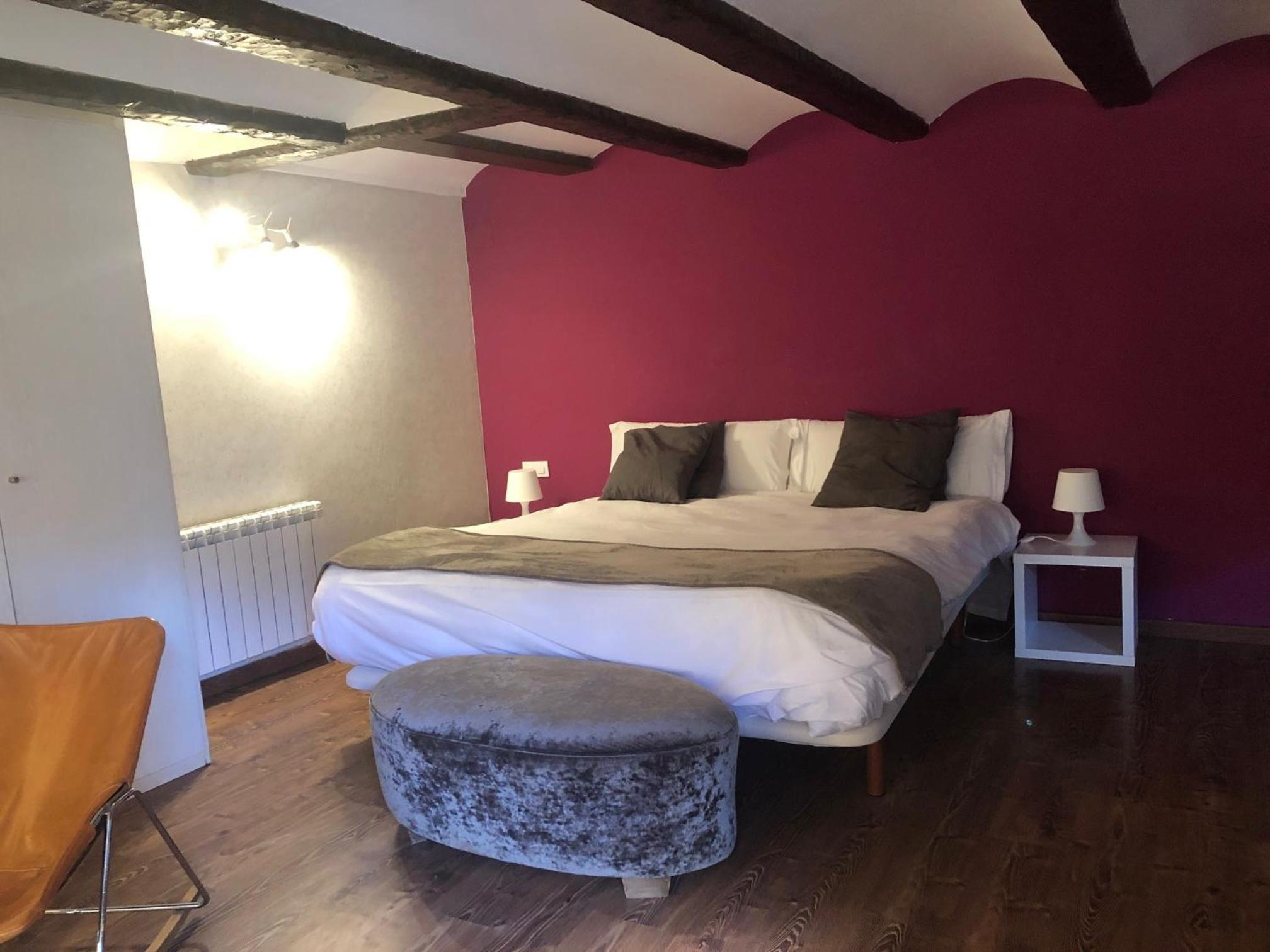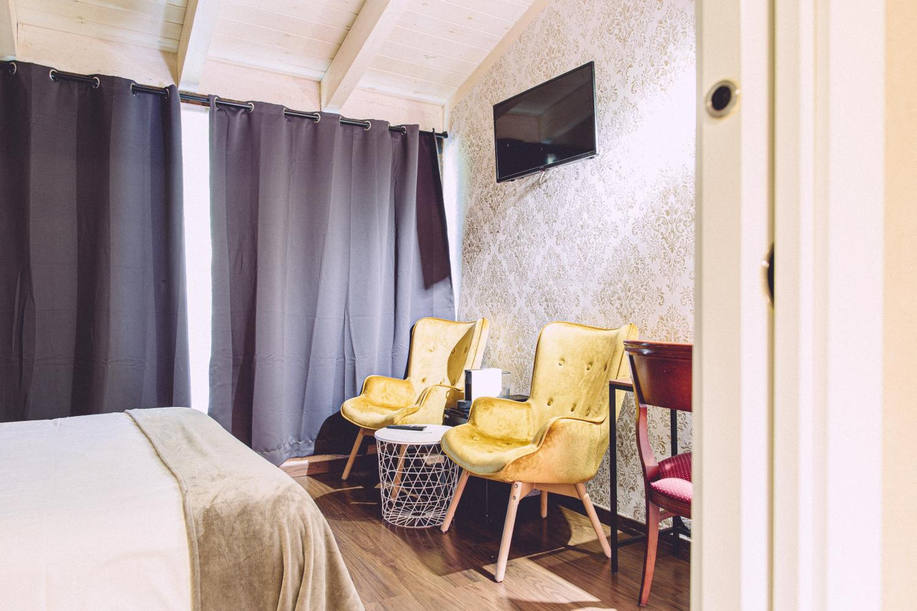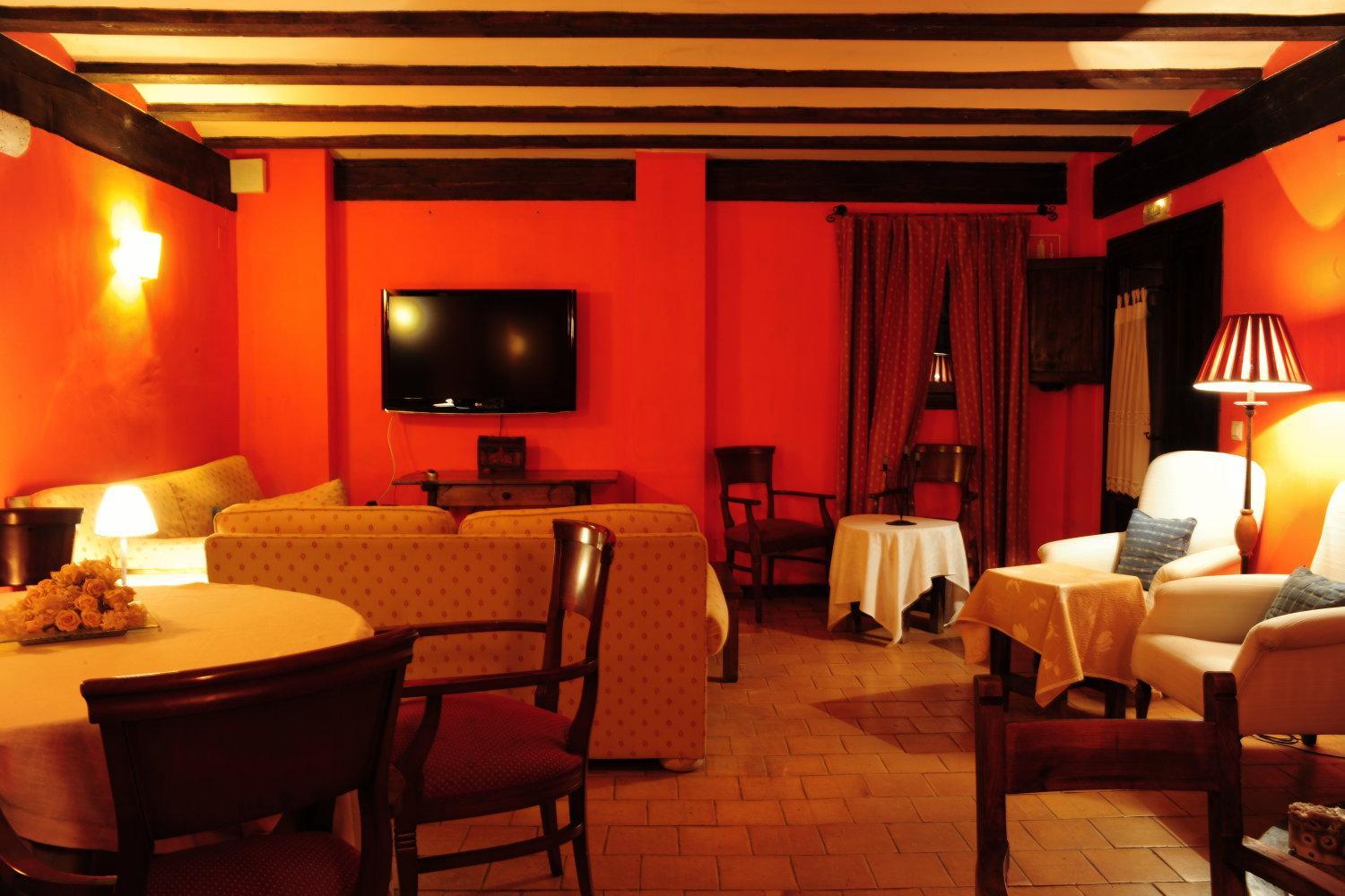 Charming Accommodation: Experience rustic charm in rooms adorned with wooden beams and warm colors, each equipped with modern amenities like free Wi-Fi and a TV.