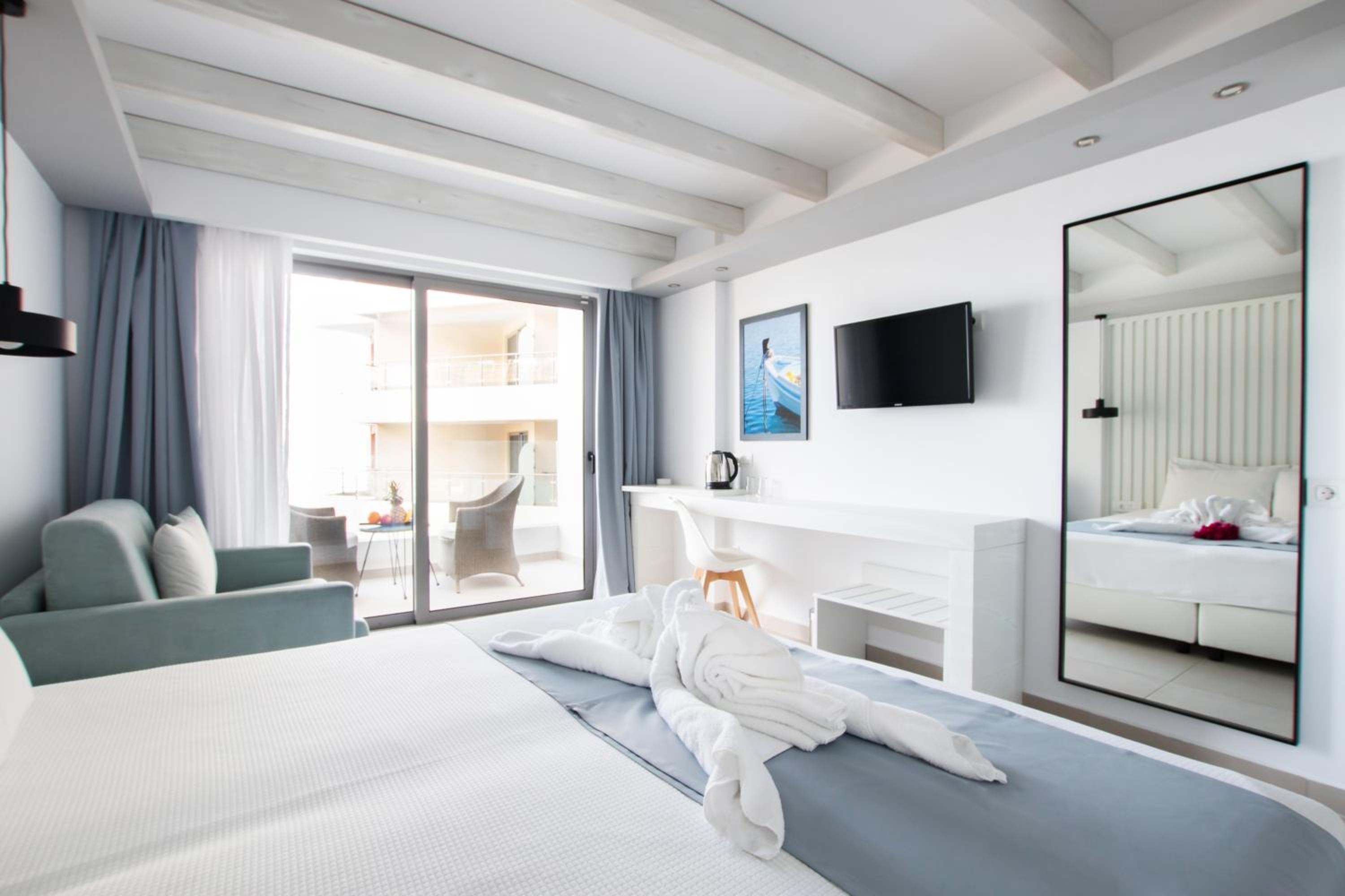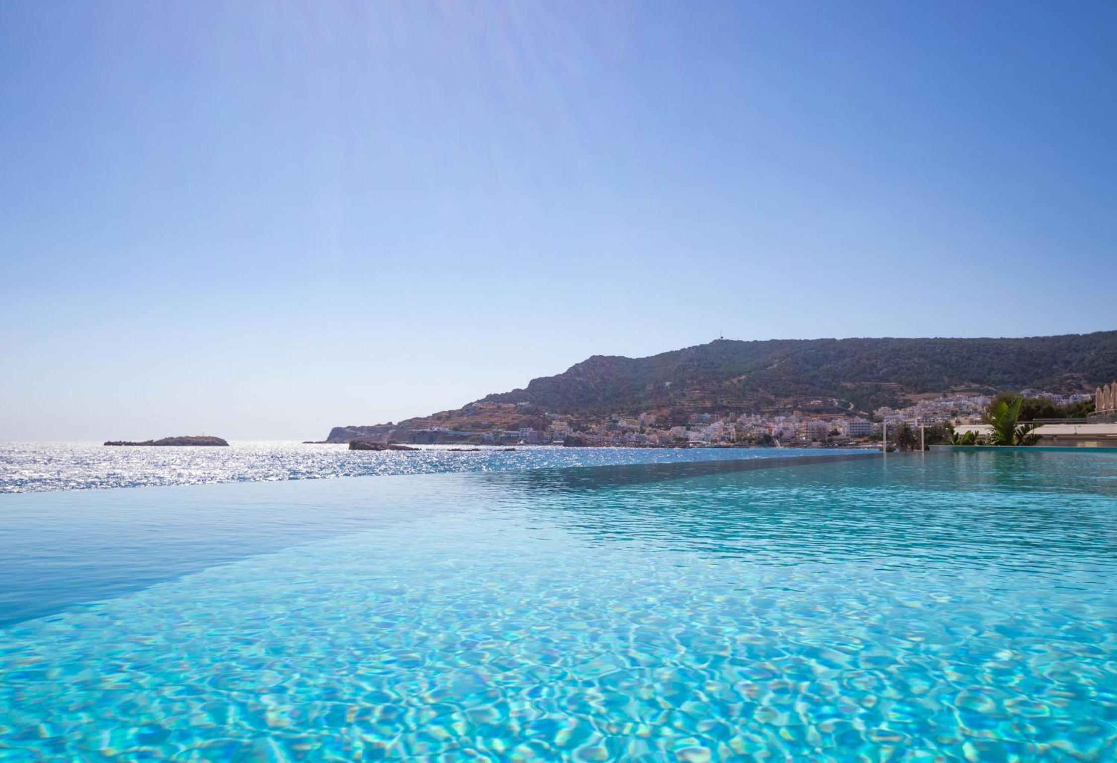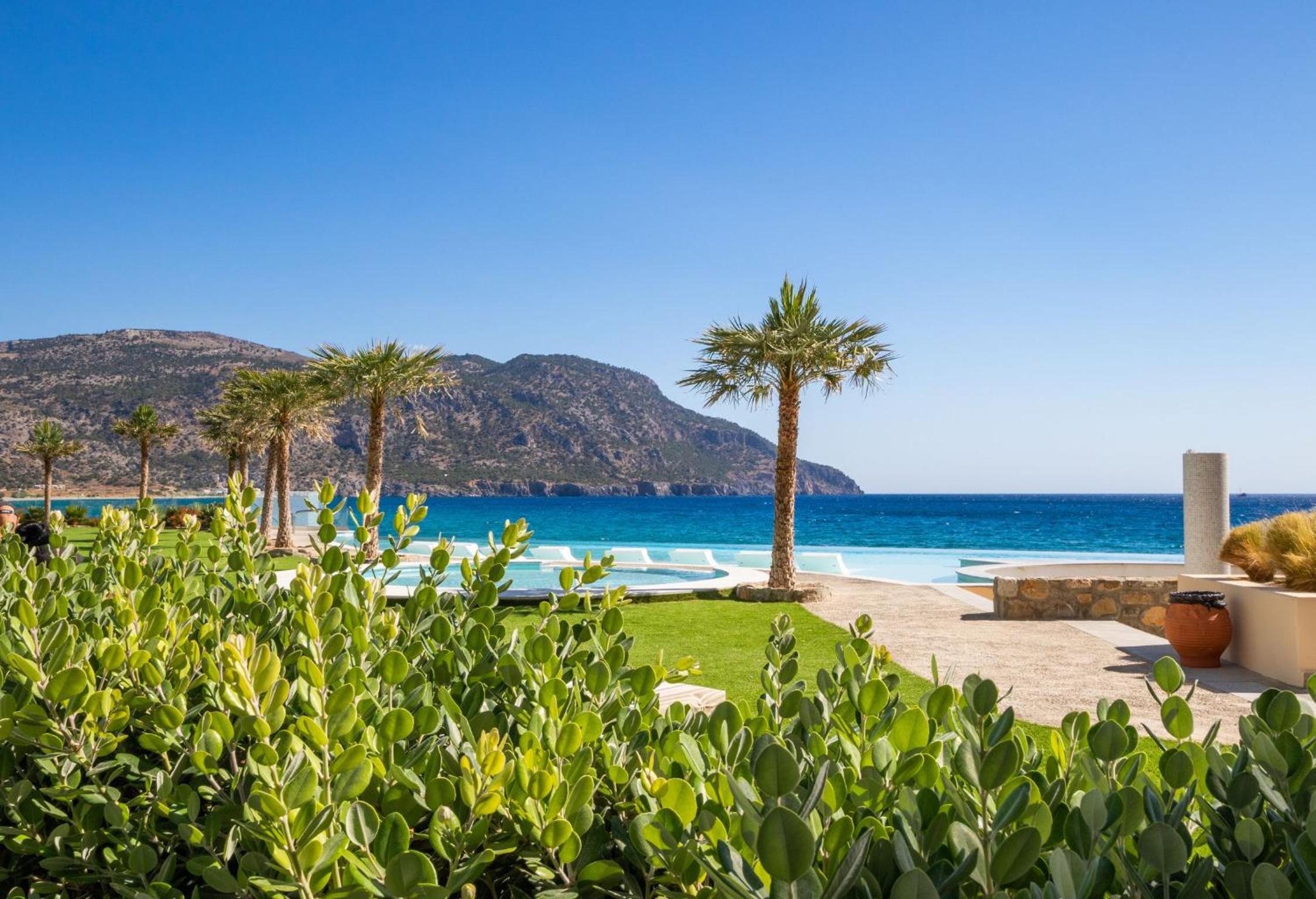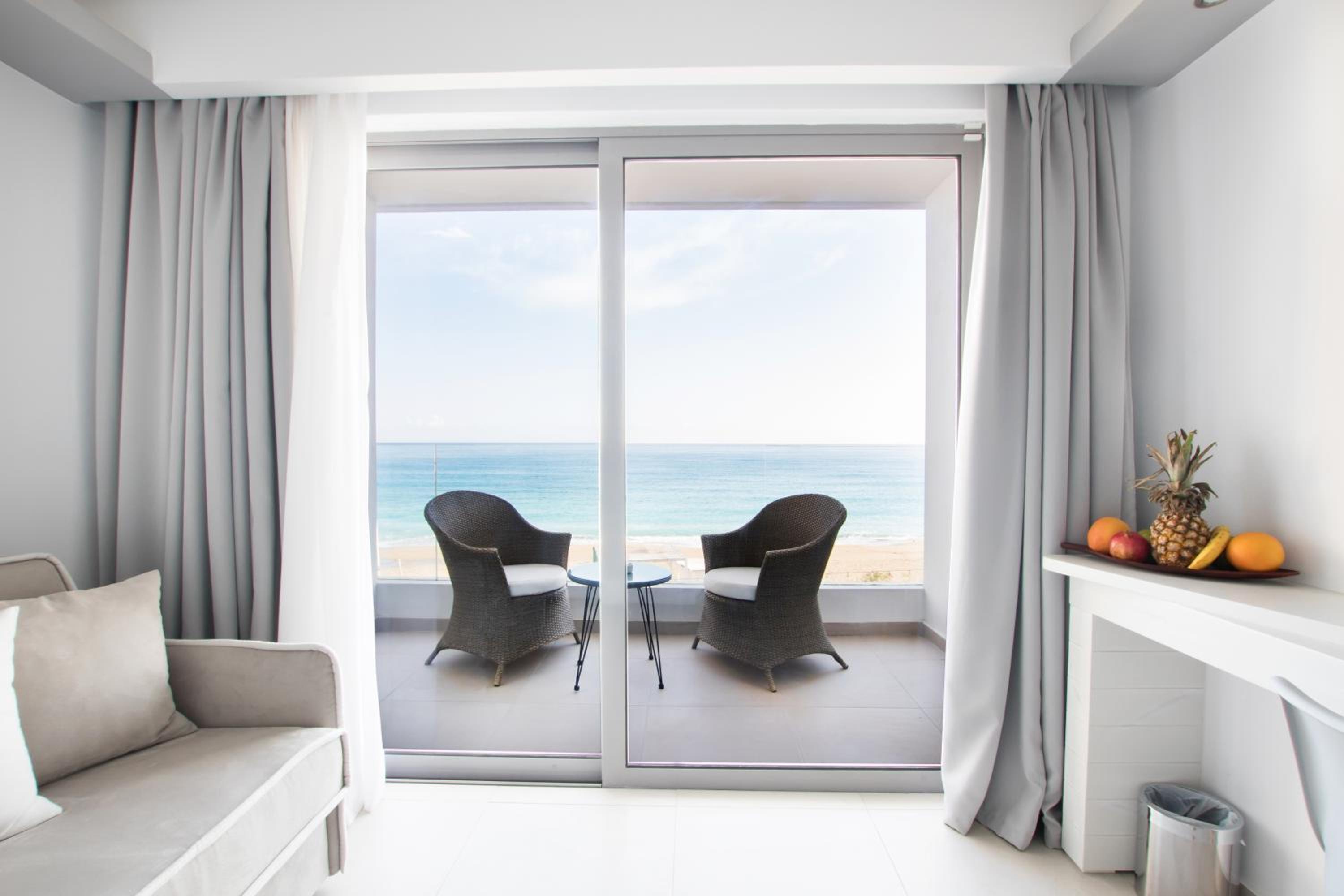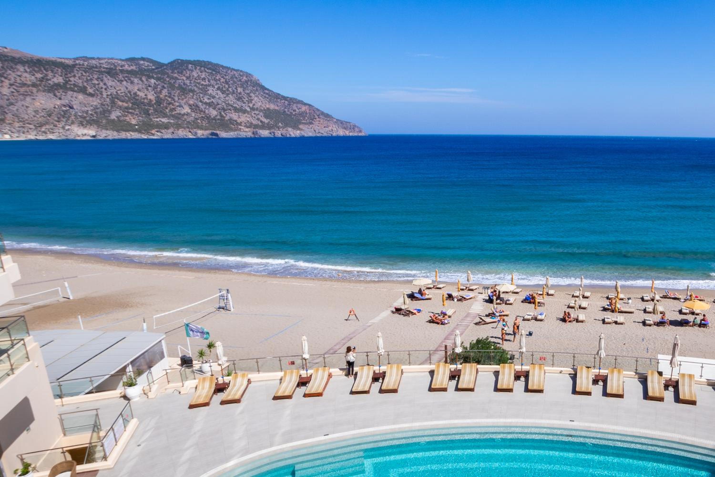 Escape to Hotel Konstantinos Palace, a luxurious beachfront property in Pigadia, Karpathos, offering stunning balcony views of the Aegean Sea and countryside from every room.