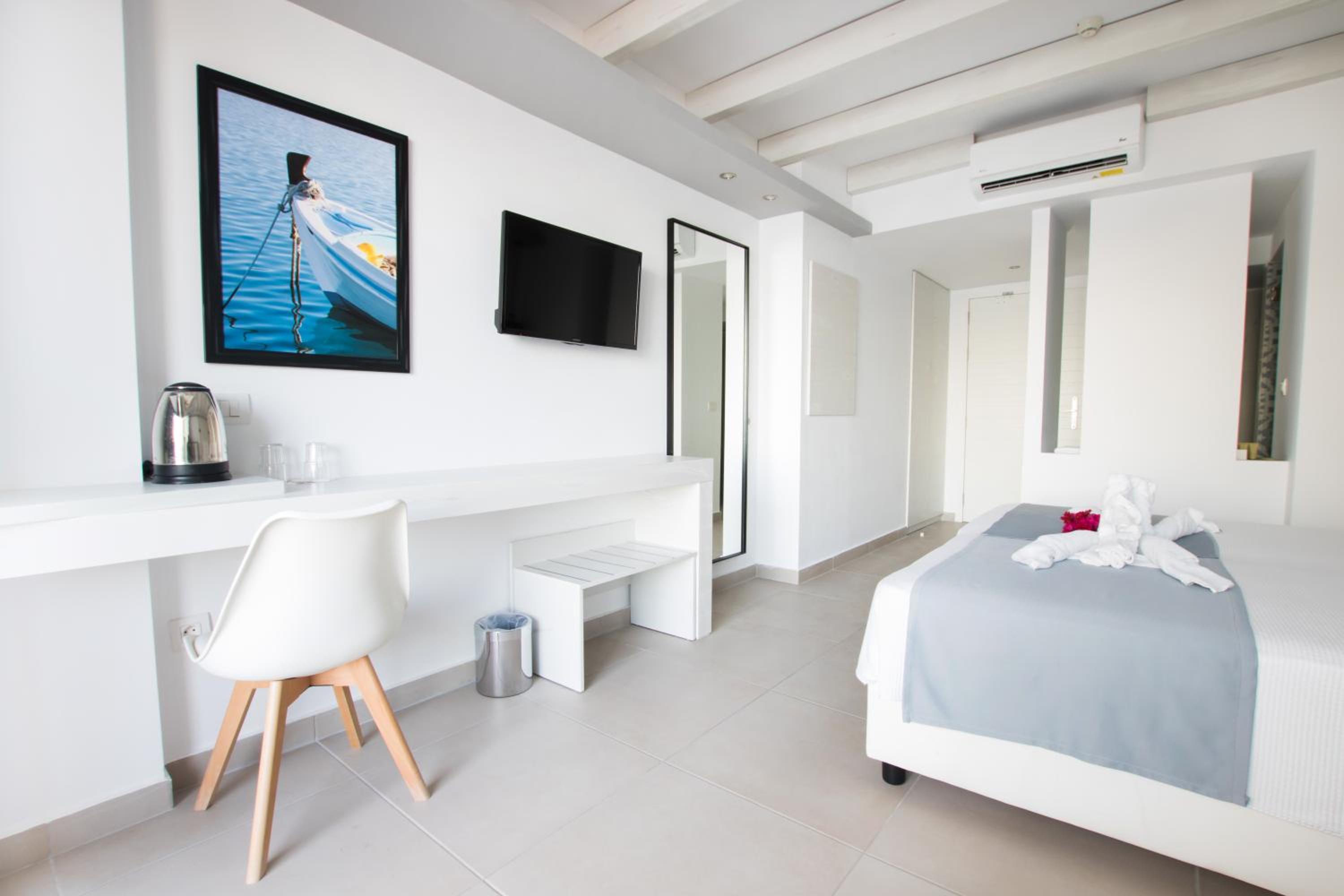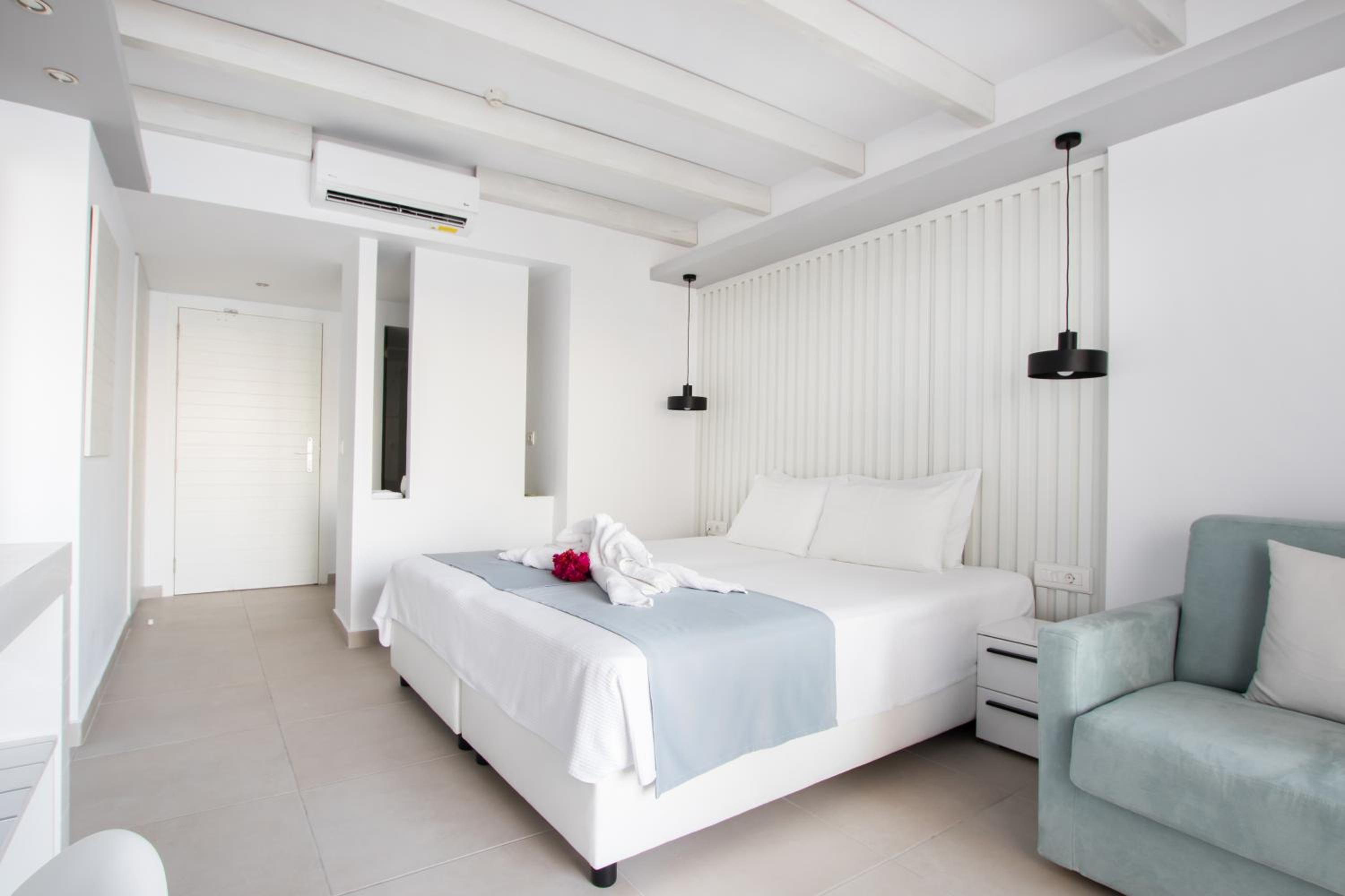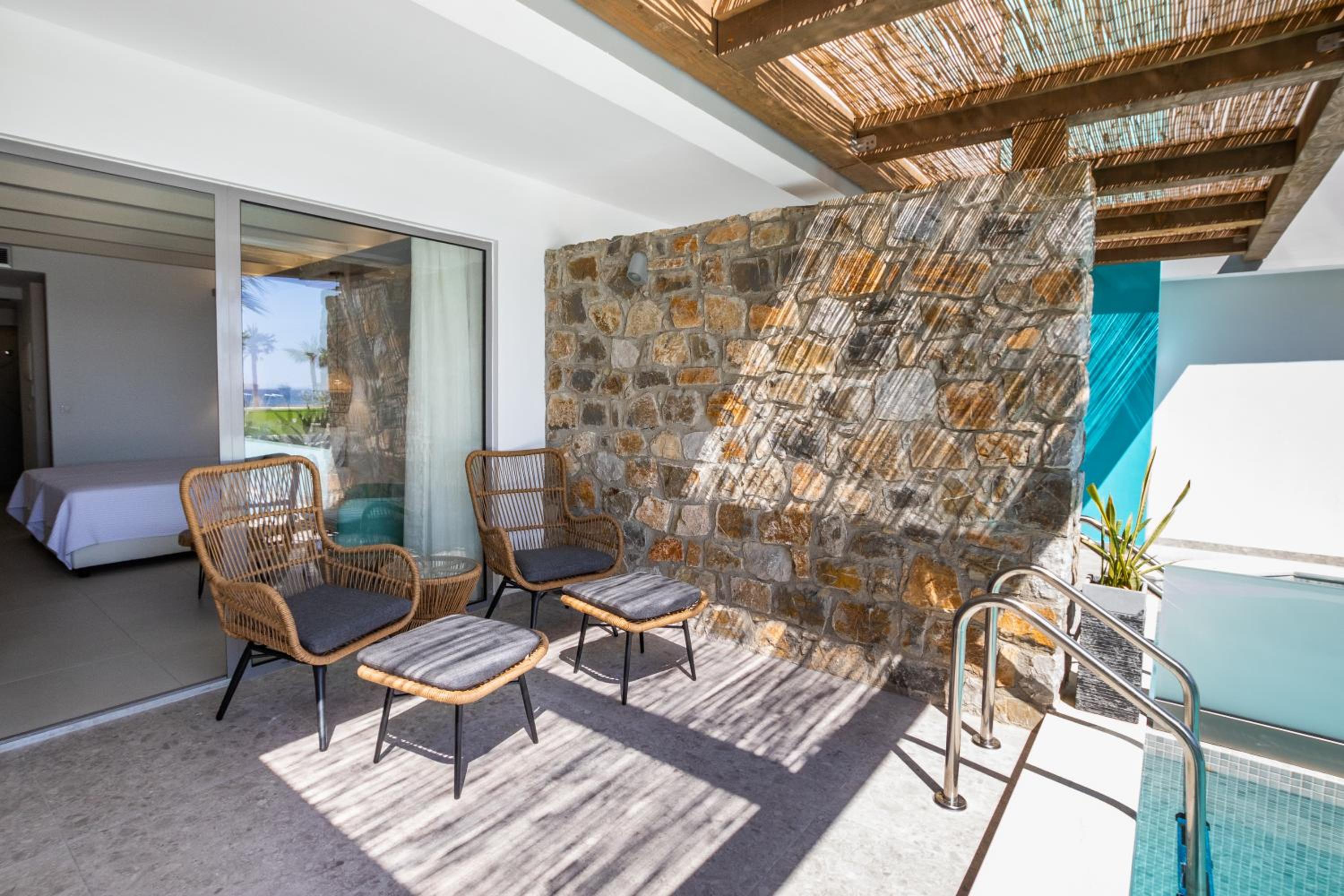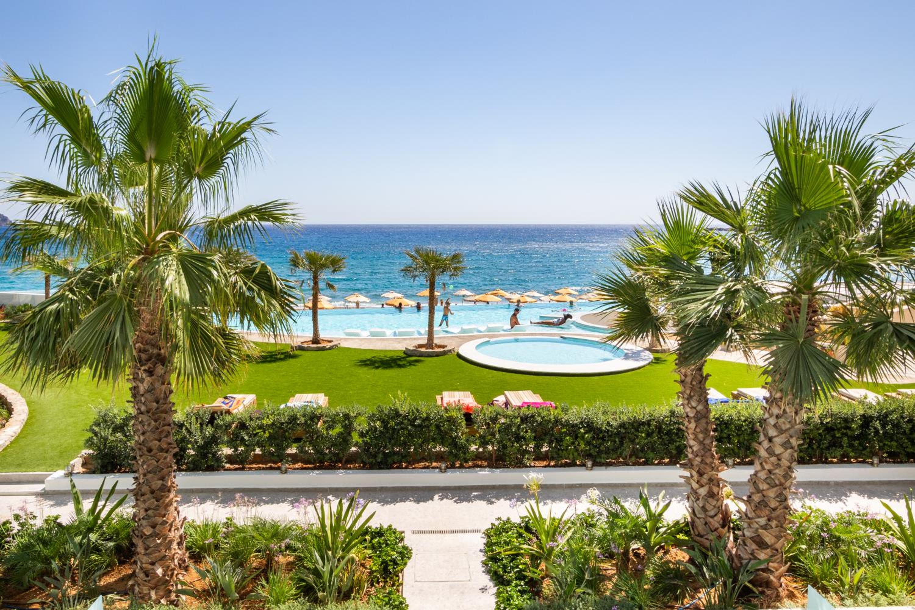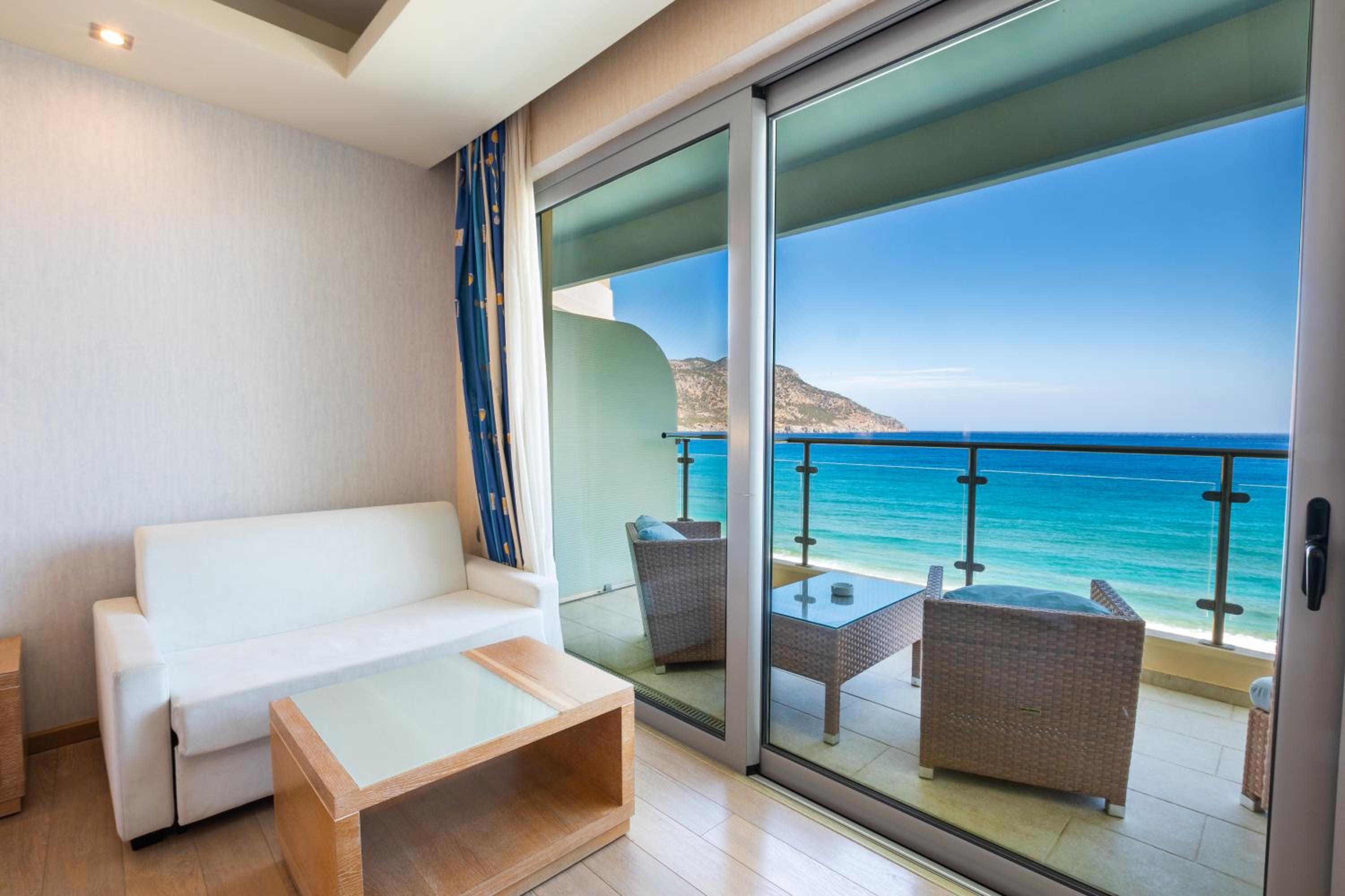 Escape to Hotel Konstantinos Palace, a luxurious beachfront property in Pigadia, Karpathos, offering stunning balcony views of the Aegean Sea and countryside from every room.