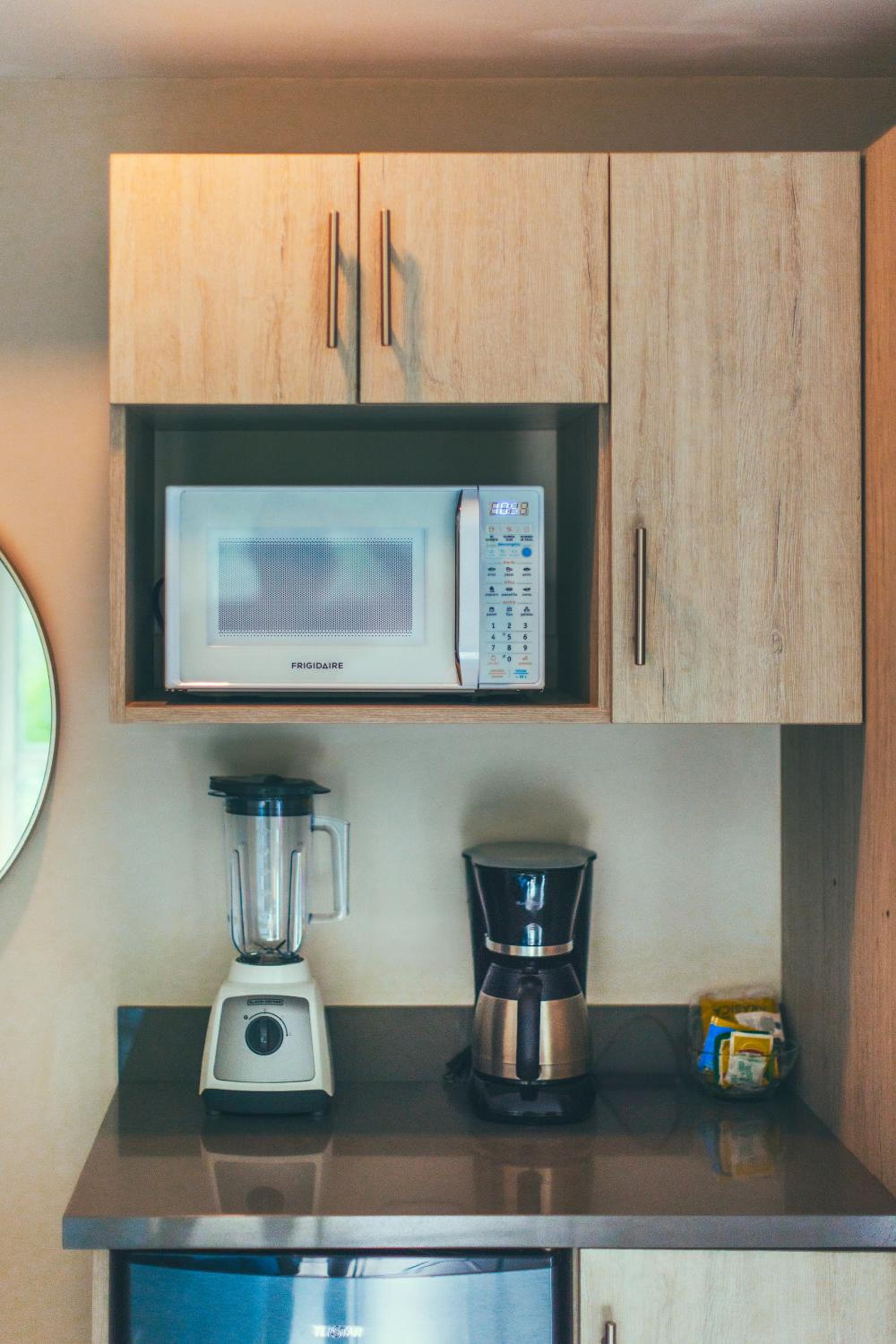 Our air-conditioned rooms offer a range of amenities including a coffee machine, fridge, and microwave. Upgrade to a room with a kitchen and oven for added convenience during your stay.