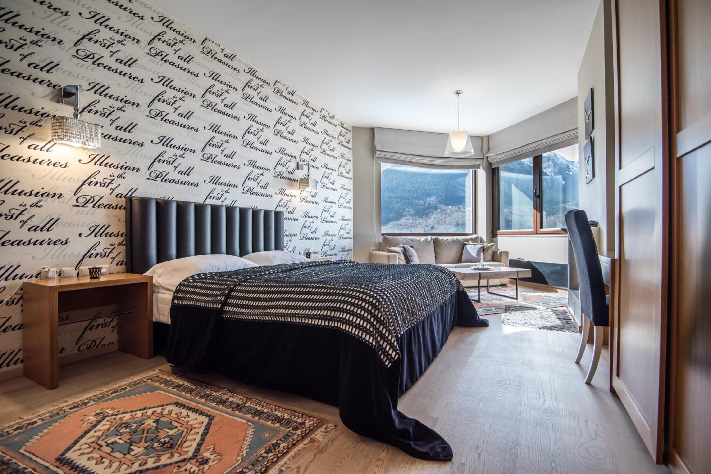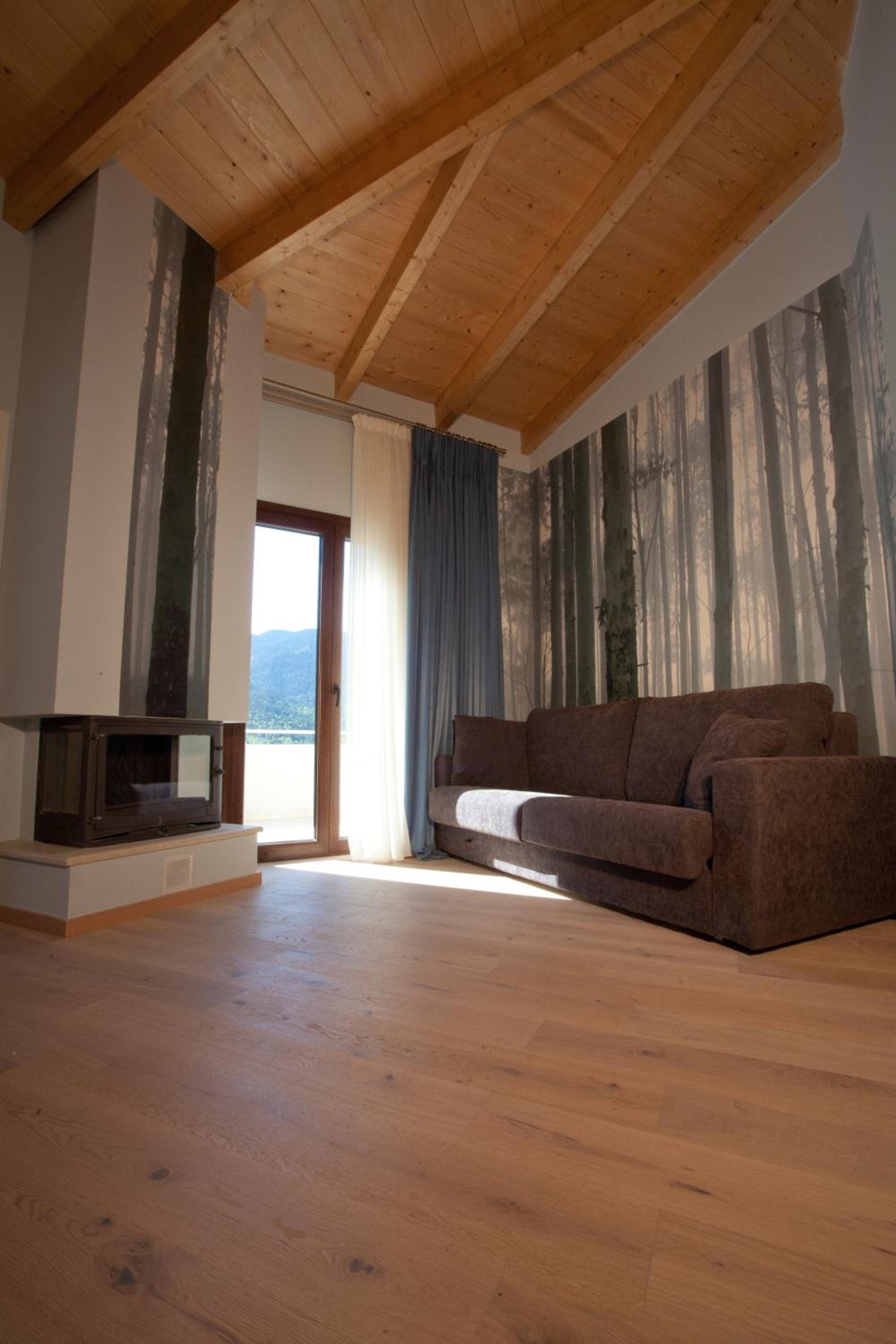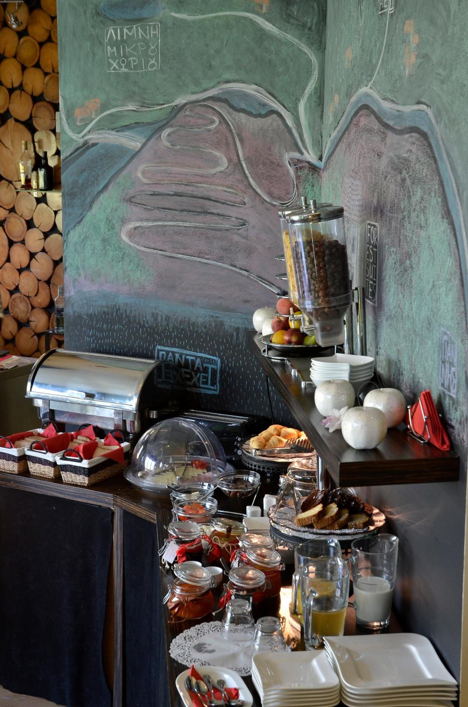 Surrounded by fir-covered Helidona Mountain, guests can savor homemade sweets, traditional pies, and seasonal salads at the stylish Forest lounge bar, all while enjoying the cozy ambiance by the fireplace.