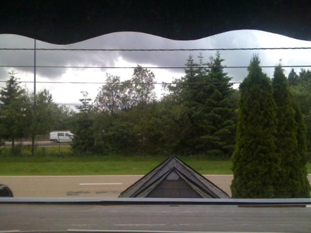 De Auberge staat op een stille weg, langs de autoroute. Voor de entree van het hotel, stonden een aantal vrachtwagens voor de nacht geparkeerd. De chauffeurs komen daar heel graag om te eten, praten en te kaarten.