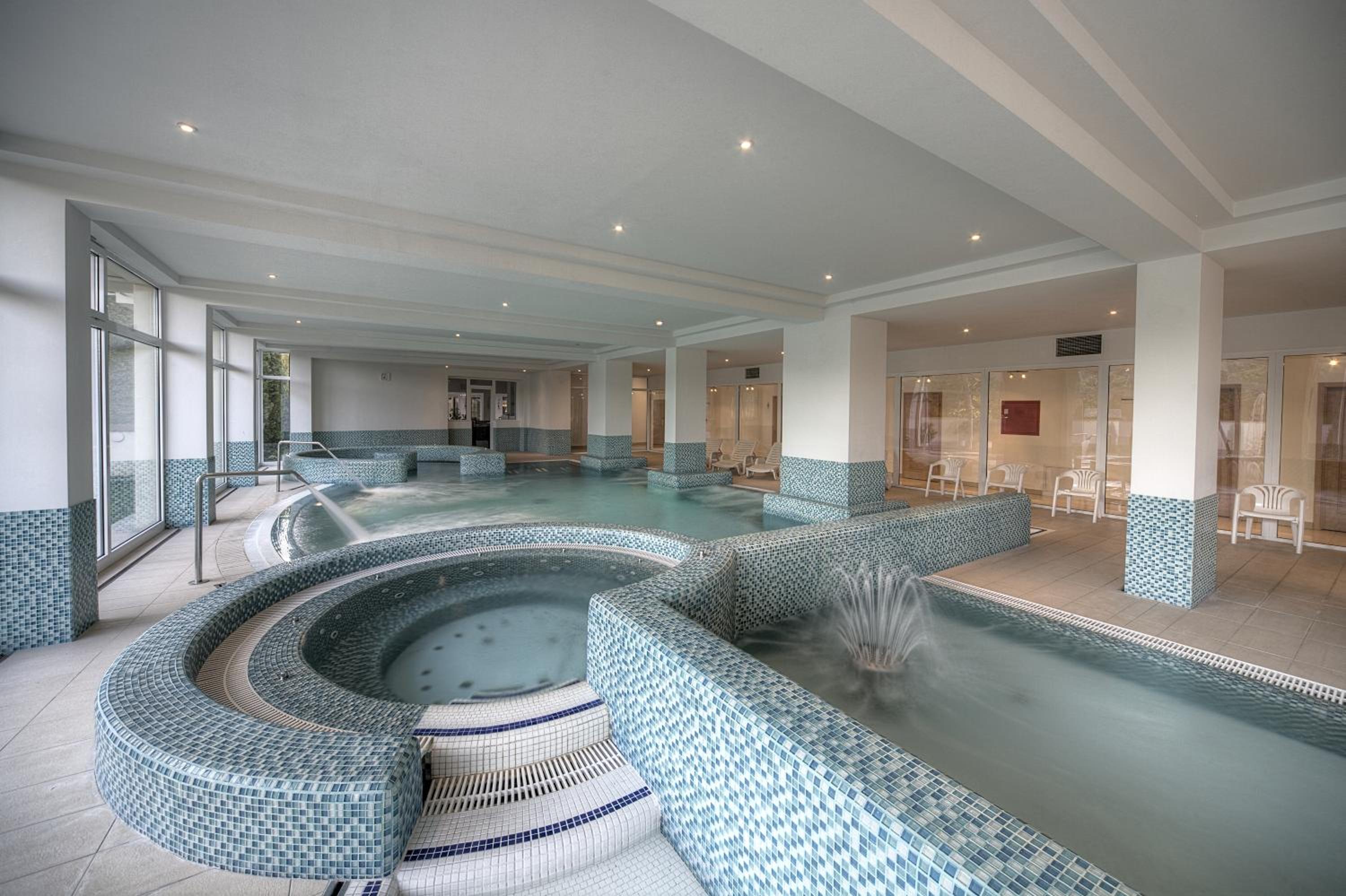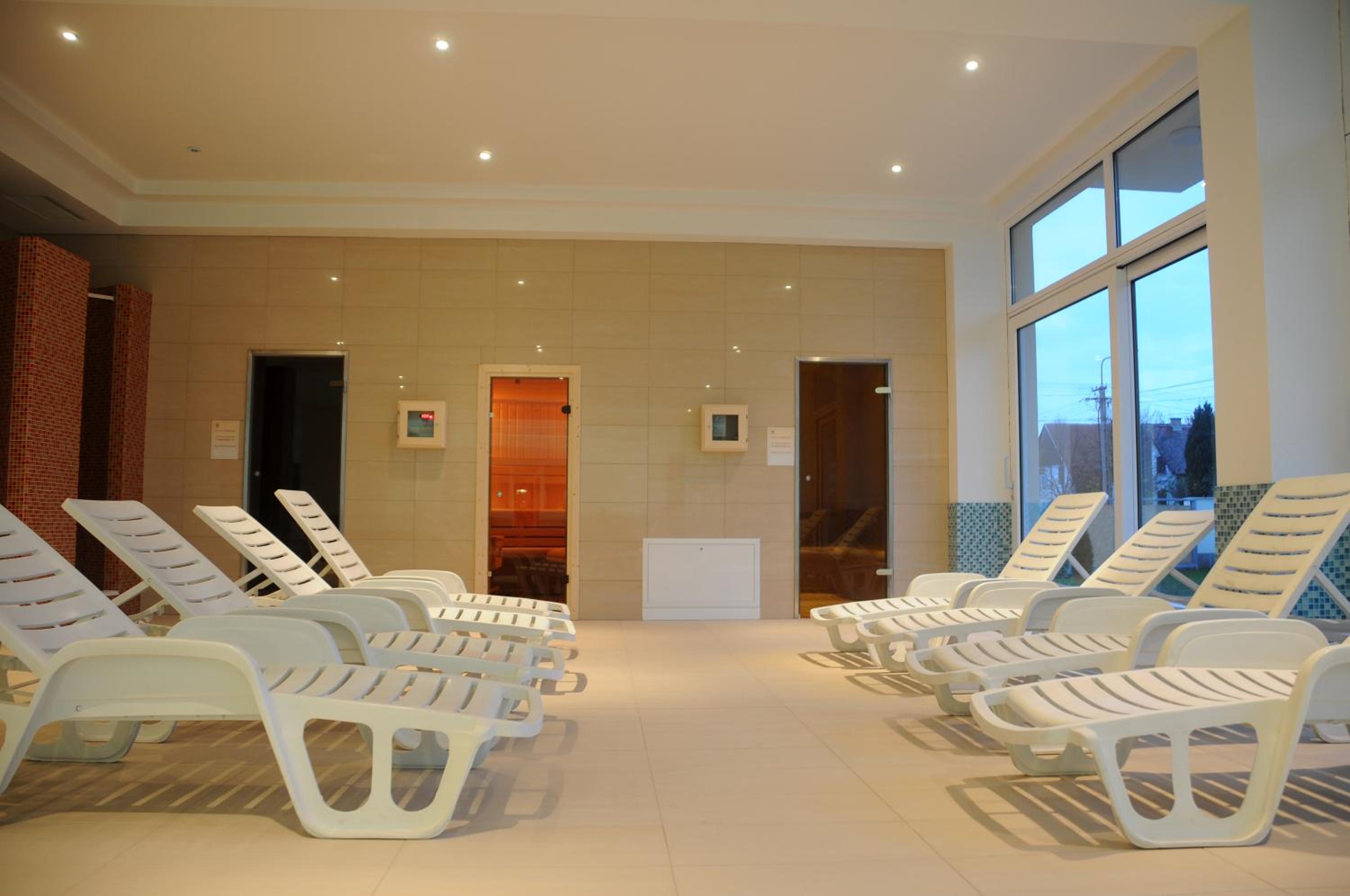 The Két Korona Hotel offers a luxurious spa area with both indoor and outdoor pools, hot tub, steam baths, and saunas. Guests can enjoy complimentary access to these facilities, as well as request relaxing massages upon preference.