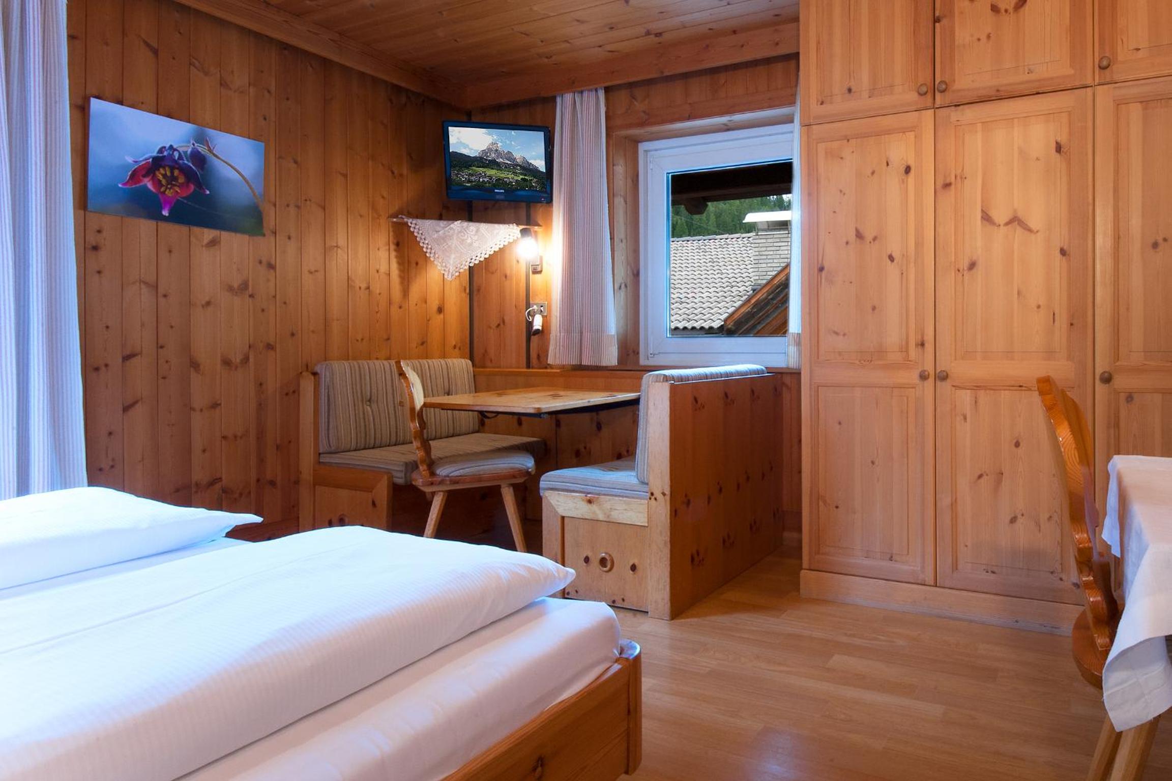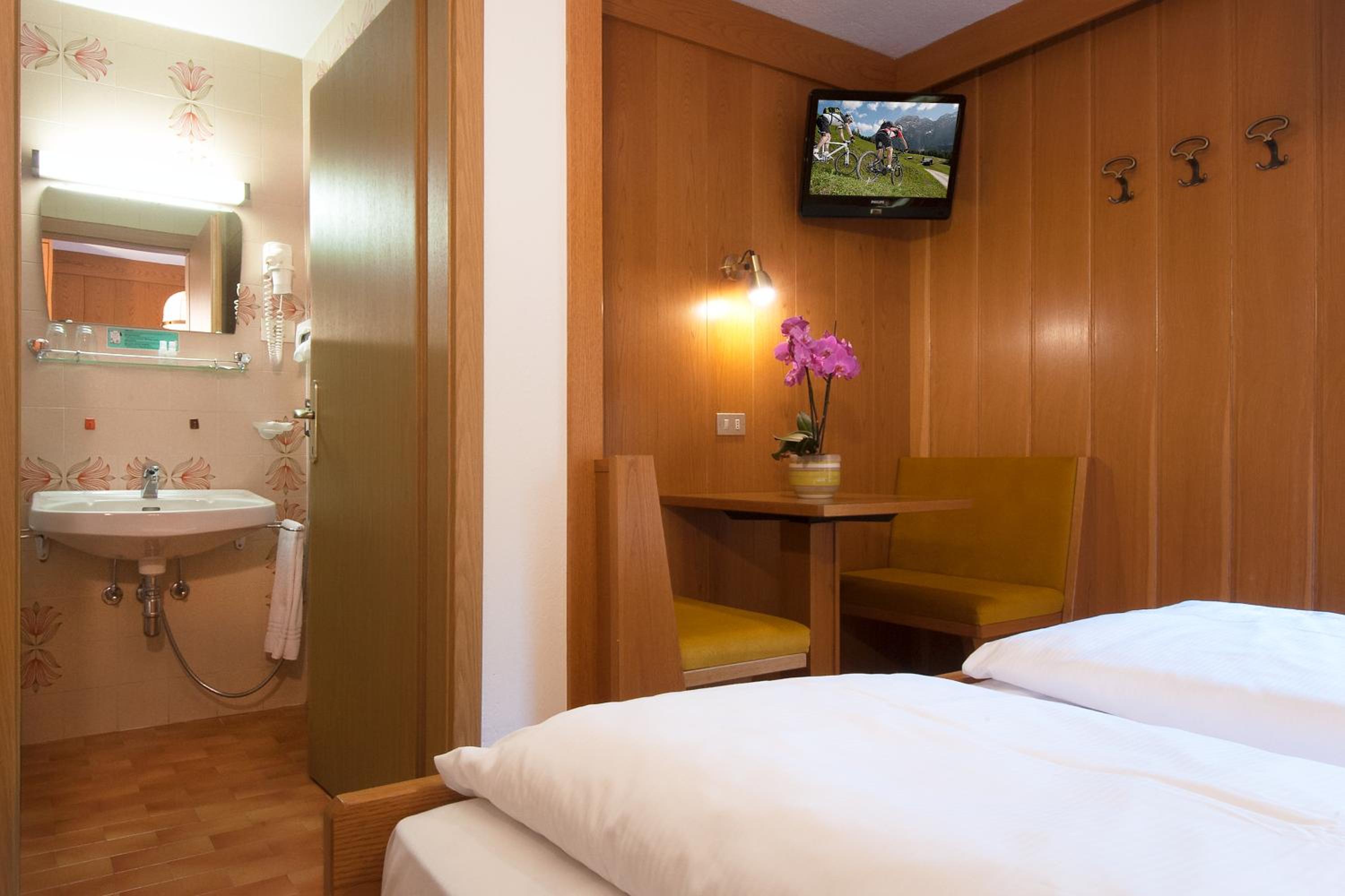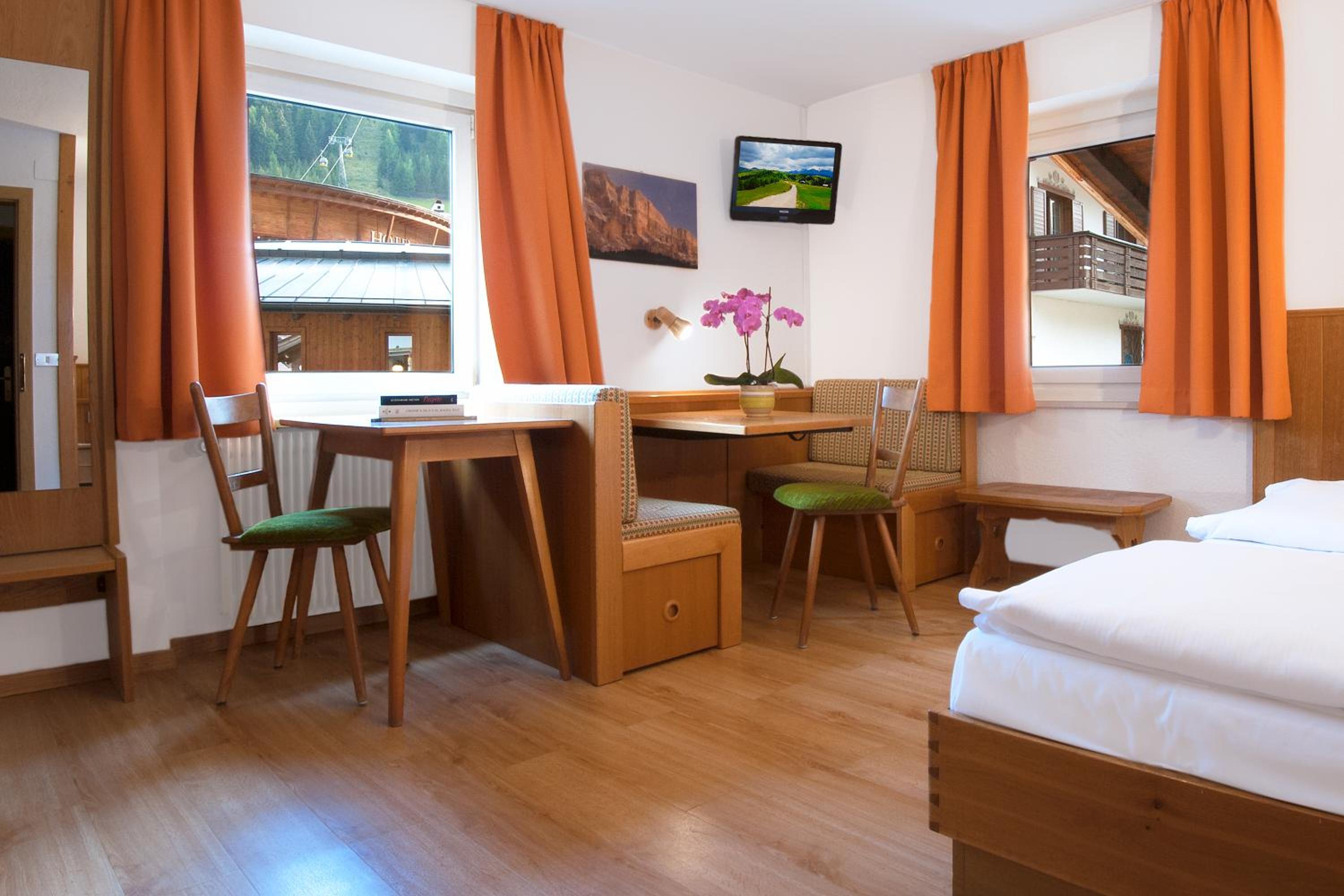 Each room at Ostaria La Fontana is designed for comfort, featuring a private balcony with stunning garden or Dolomites views. With wooden furnishings, plush carpeted floors, and modern amenities like a flat-screen TV, your stay is sure to be relaxing.