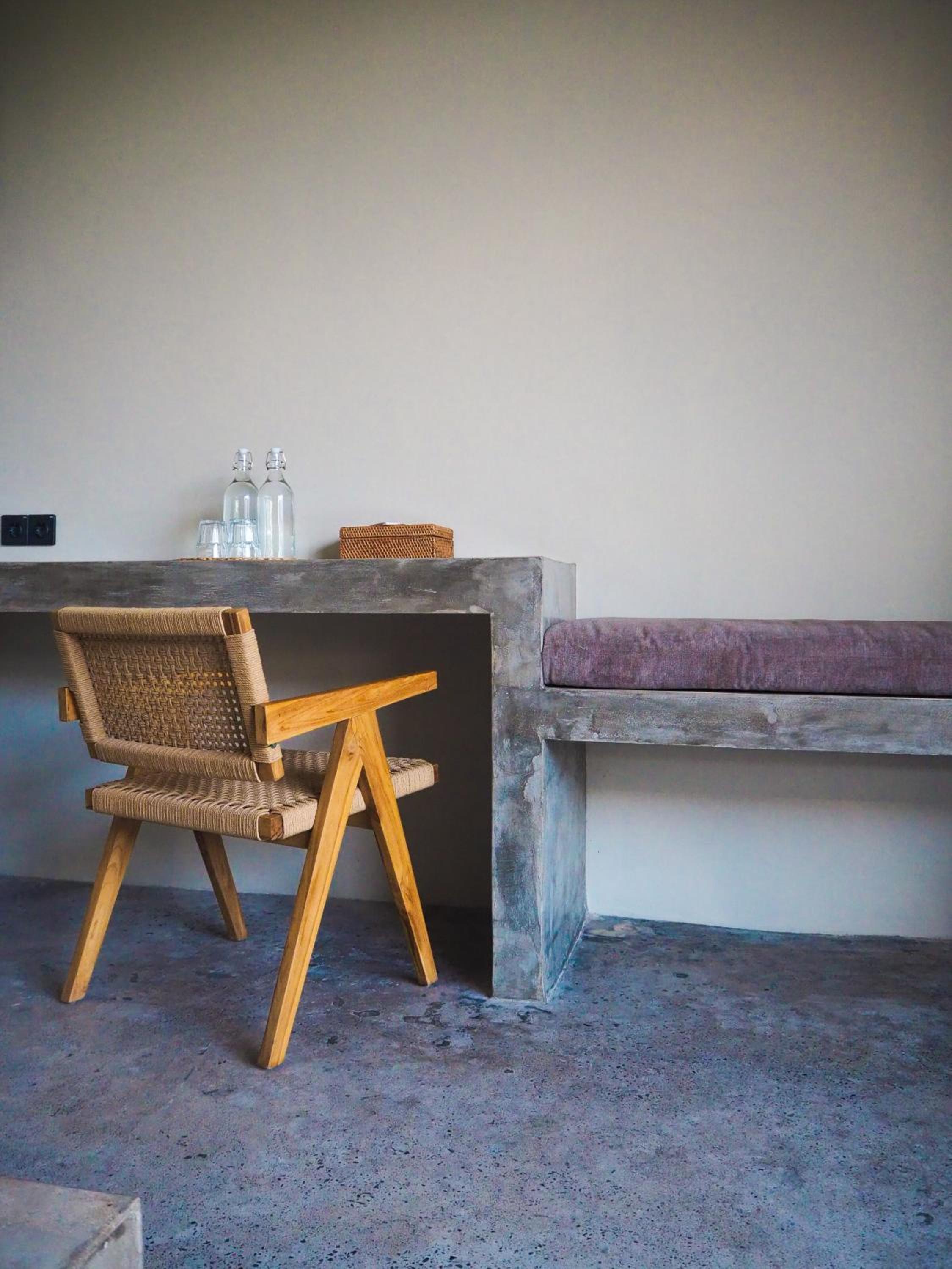 Manque de rangement dans la chambre .Un coffre petit et simplement posé sur une étagère, mauvaise odeur dans la salle de bain. Sur la terrasse un banc en ciment pas très confortable.