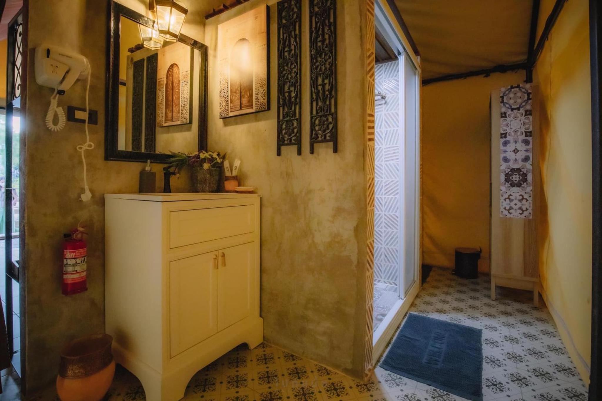 When you book the tent don't think that you can use the pool as shown on the pictures. The 4 tents are located next to the parking lot and next to a road where quite some cars pass by. There is no shadow and it's super hot during the day which makes it really uncomfortable. The ''pool'' you can use is 2x2 and 80 cm deep and located next to the parking lot. Breakfast is fixed, some sausages, fried rice and bread. Nothing special and not an option to pick something from the menu.