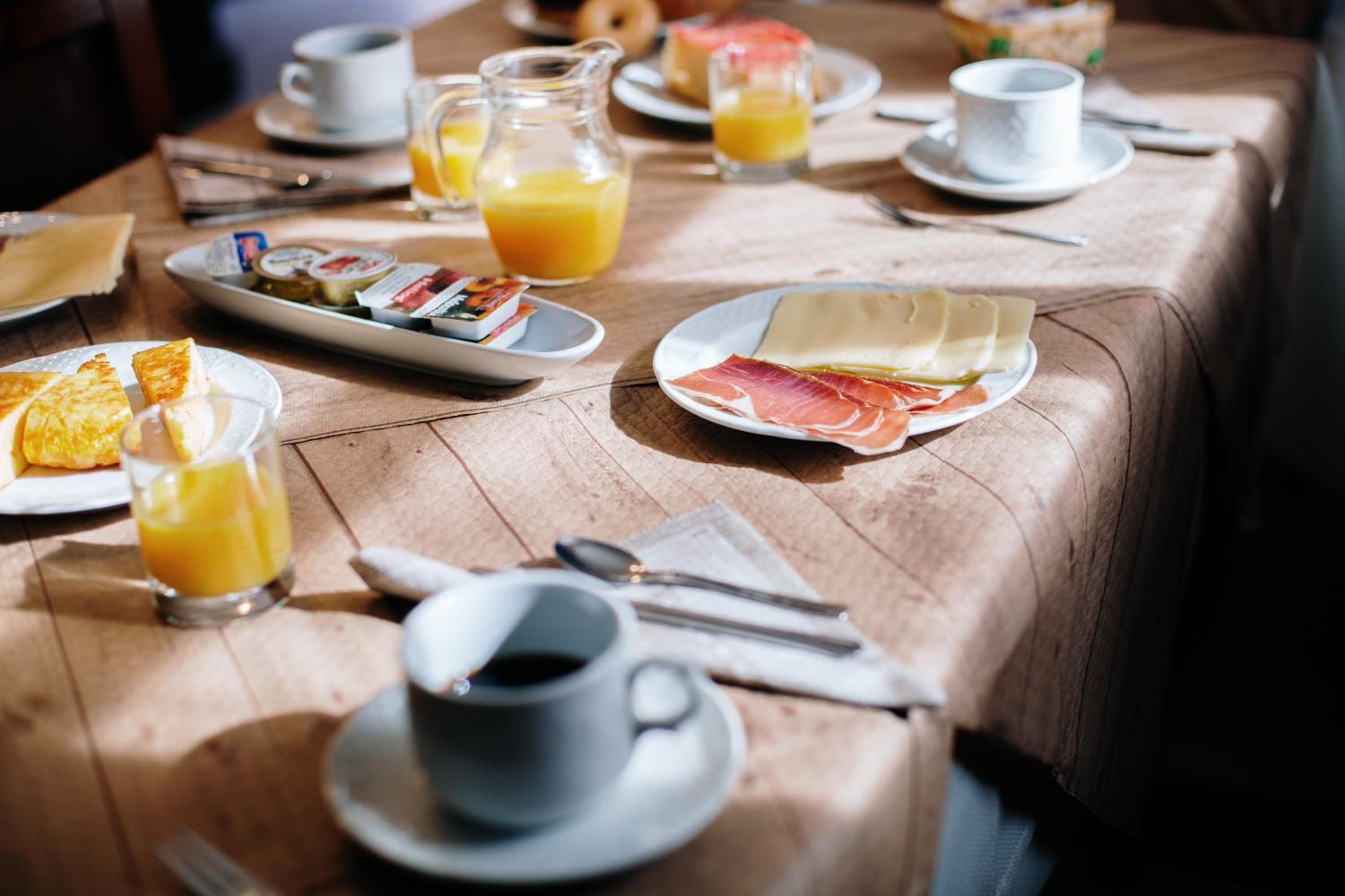el desayuno muy bien, cafe con leche, panes, muchas mermeladas en paquete, budin dulce, tortilla de patatas, jamon, queso, cereales, yogur, frutas, agua jugo de naranja, buenisimo