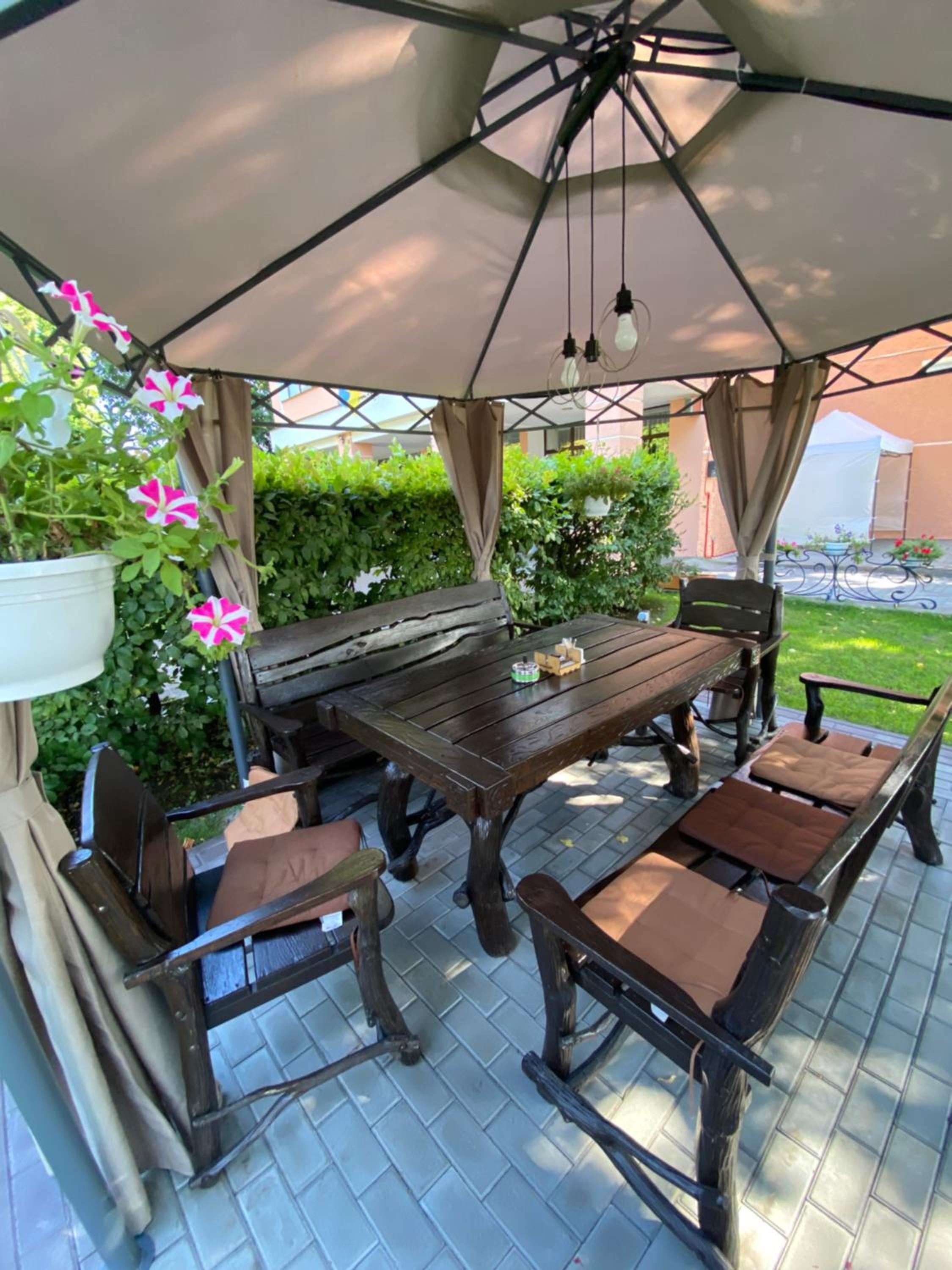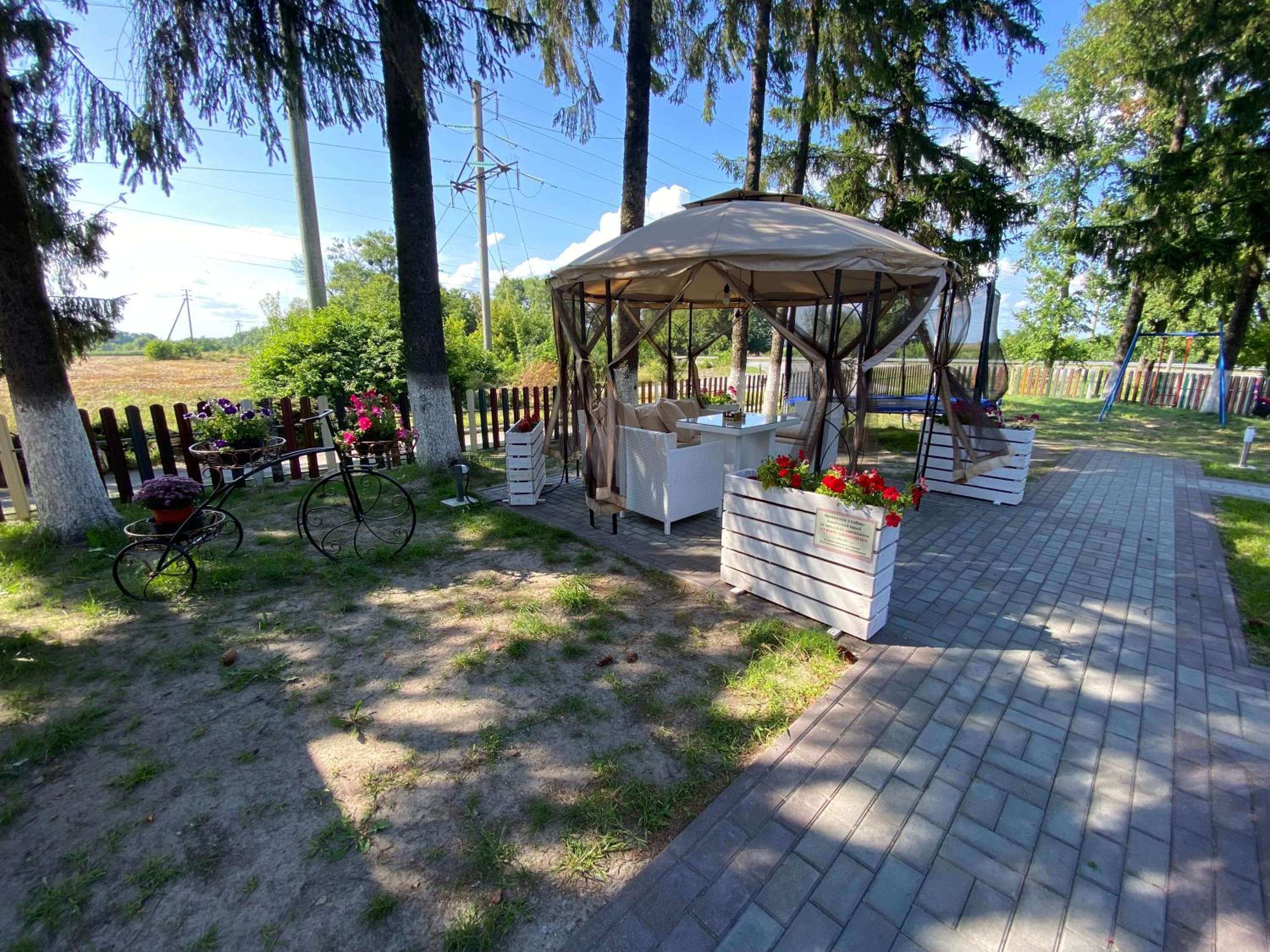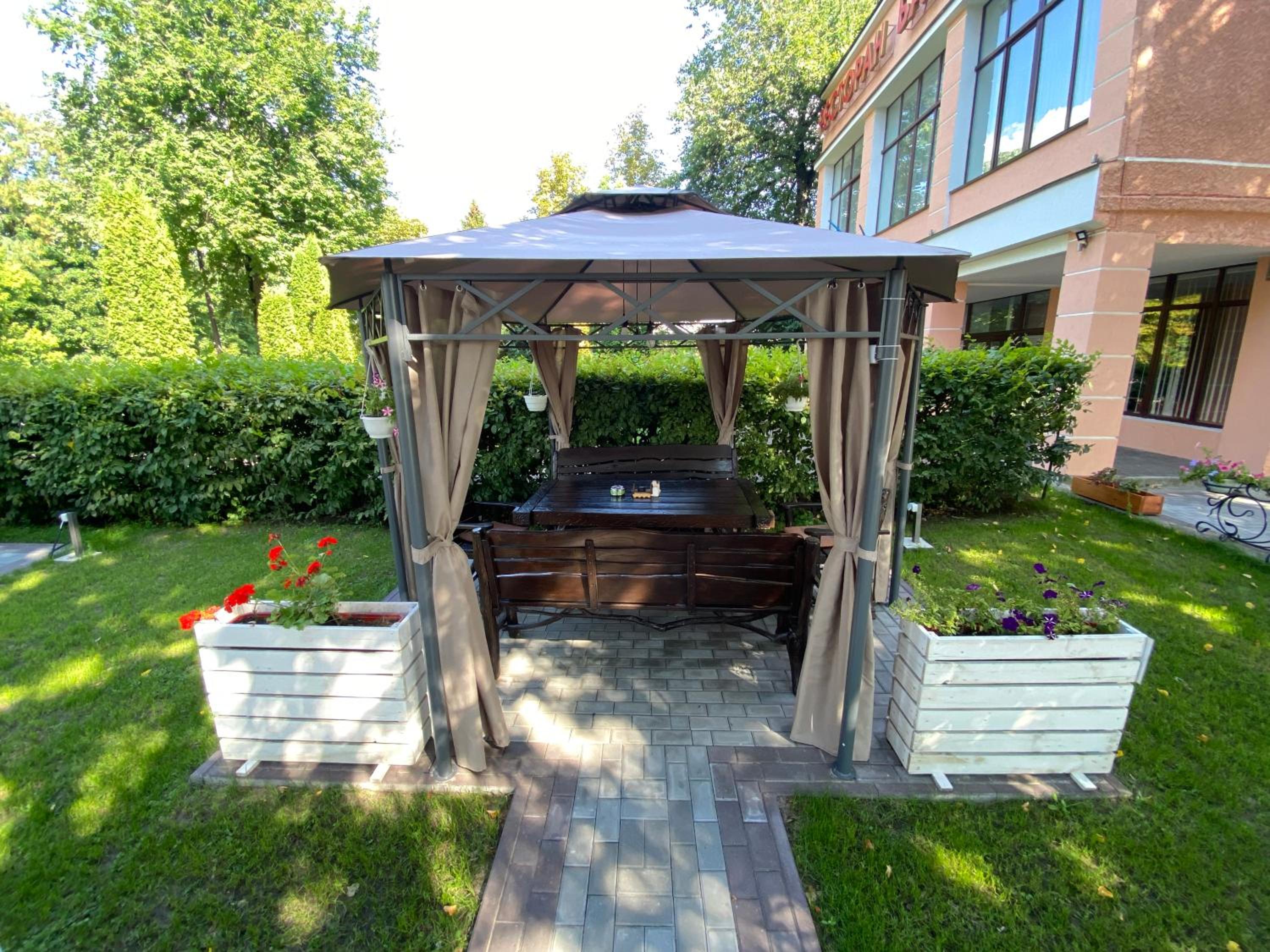 Готельно-ресторанний комплекс «Тополя» offers a serene garden and a cozy shared lounge where guests can unwind and enjoy the peaceful surroundings.