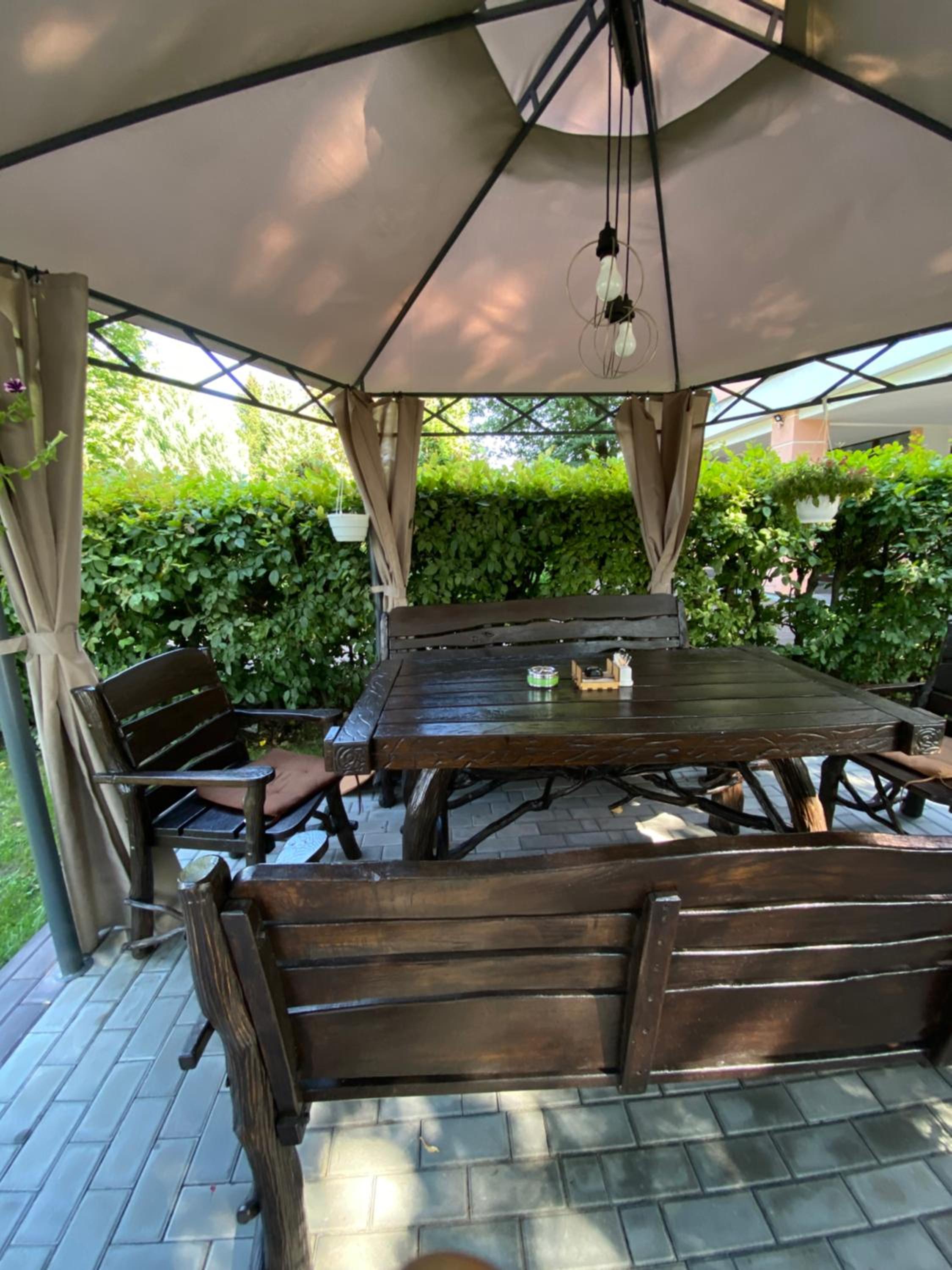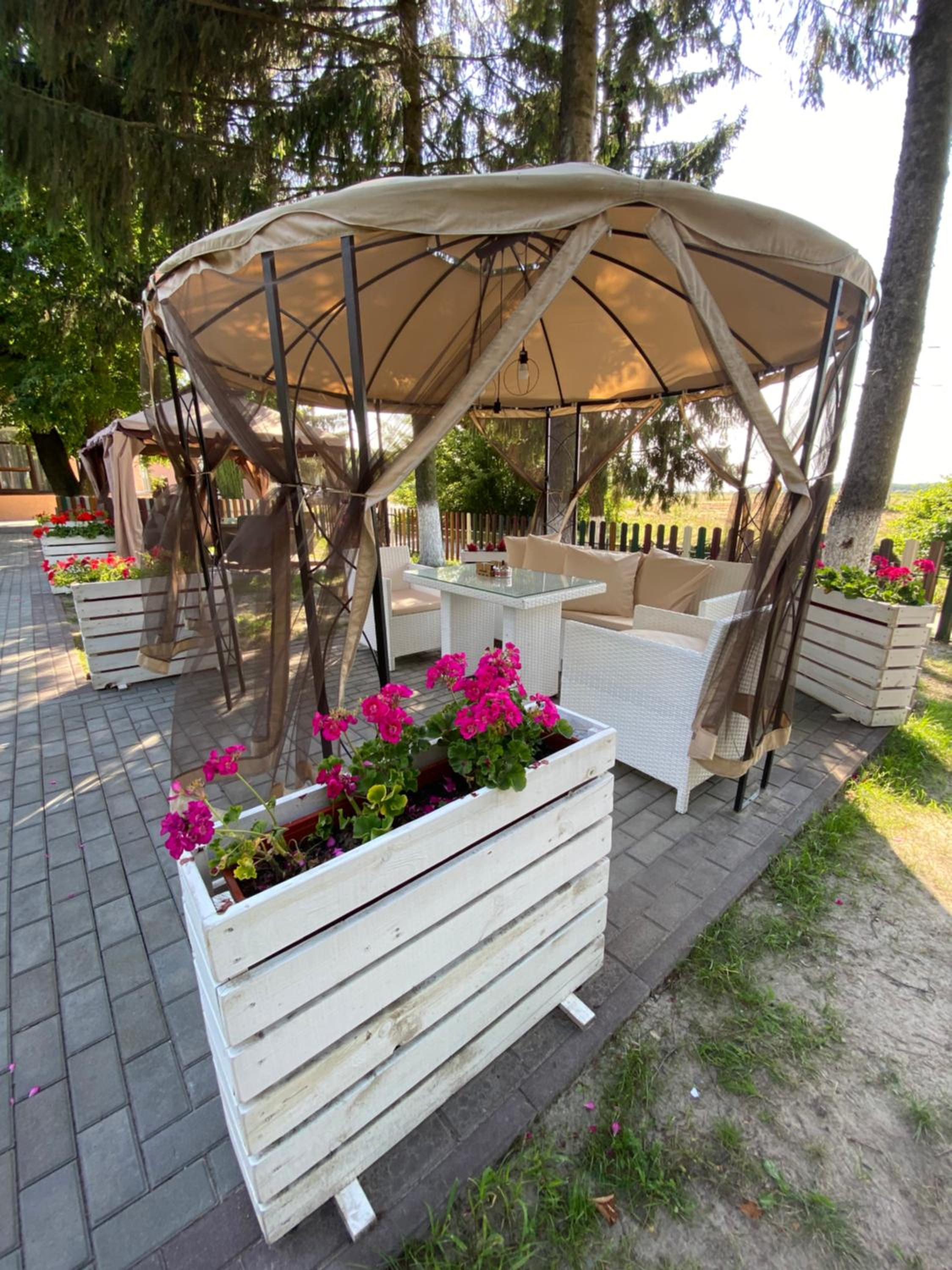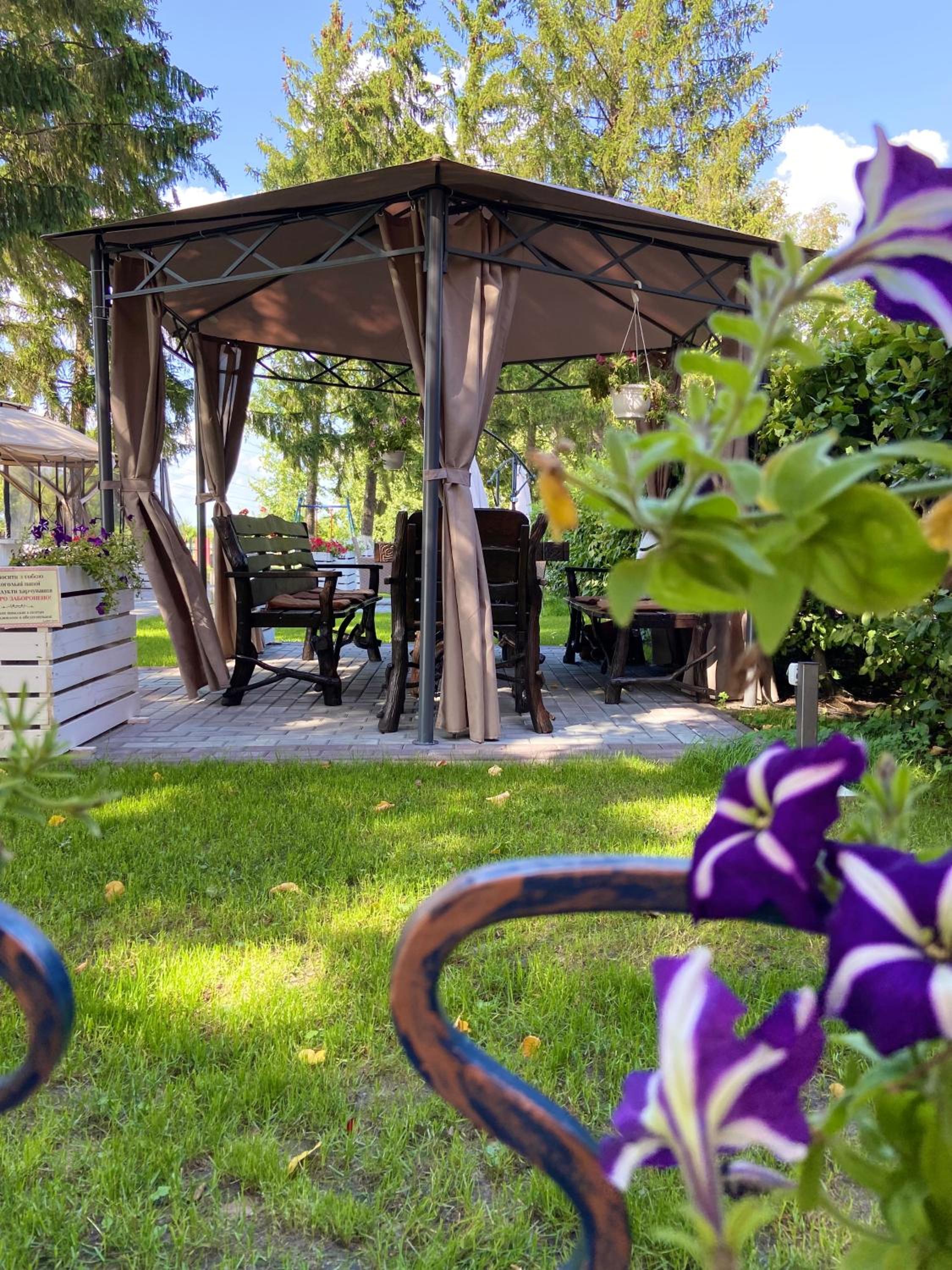 Готельно-ресторанний комплекс «Тополя» offers a serene garden and a cozy shared lounge where guests can unwind and enjoy the peaceful surroundings.