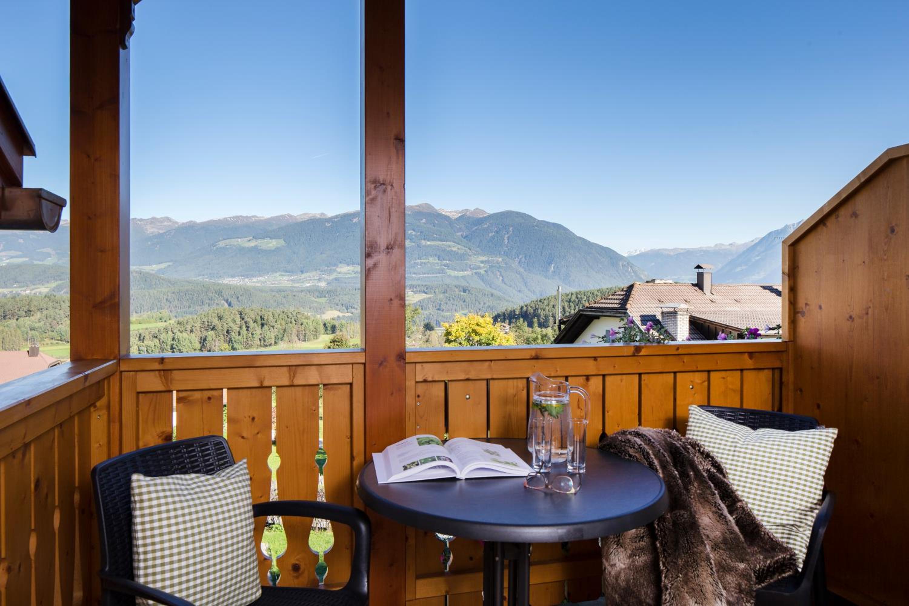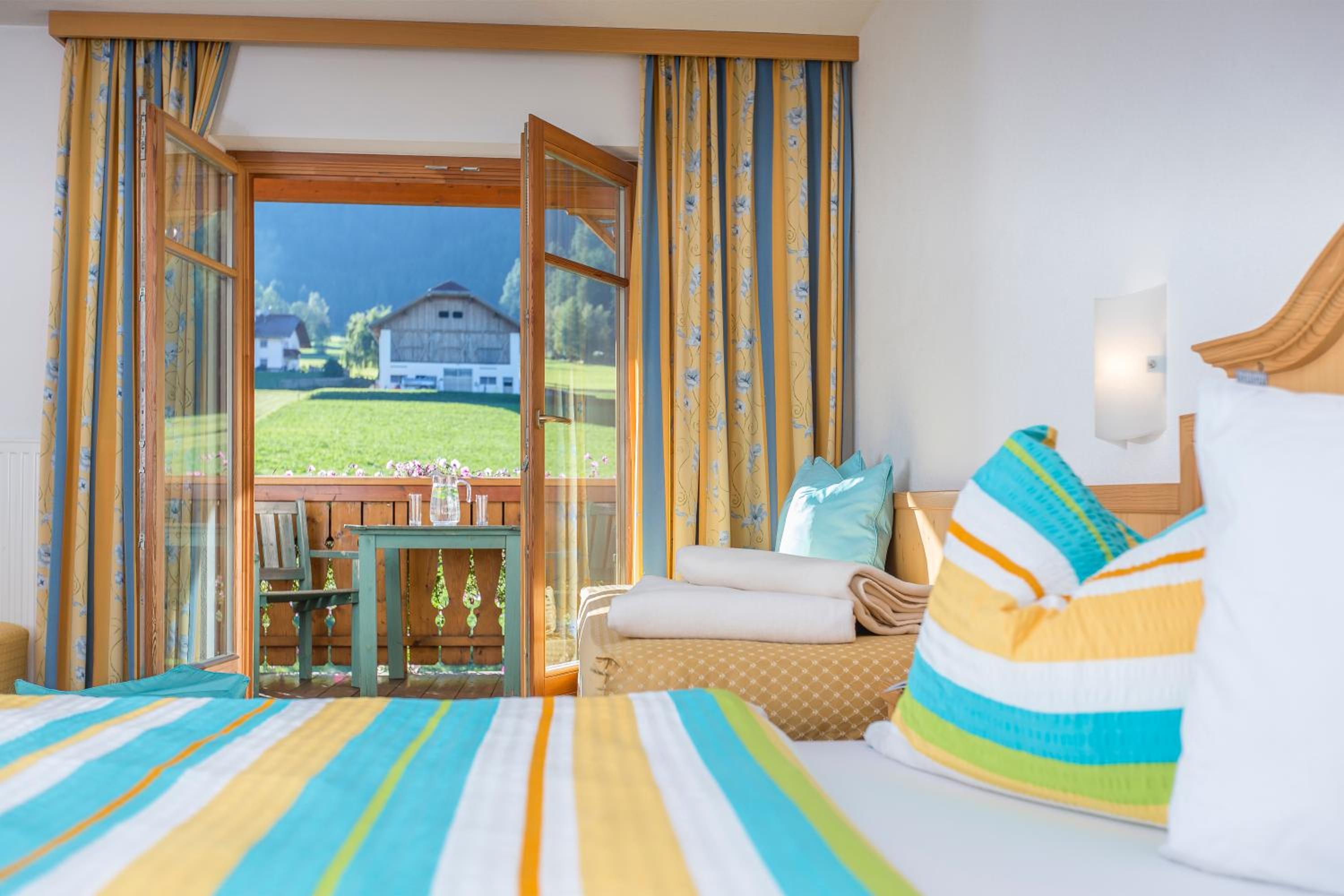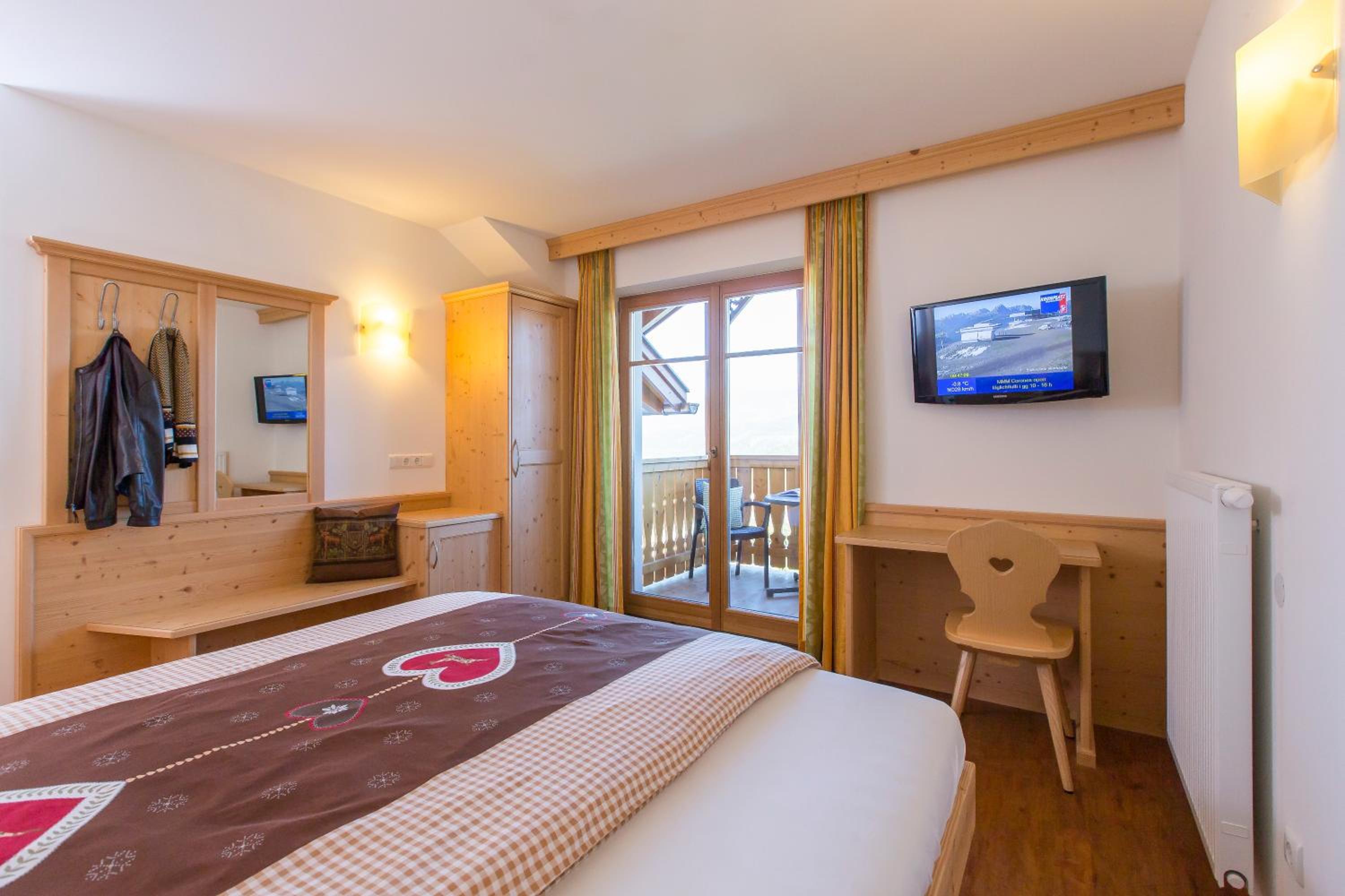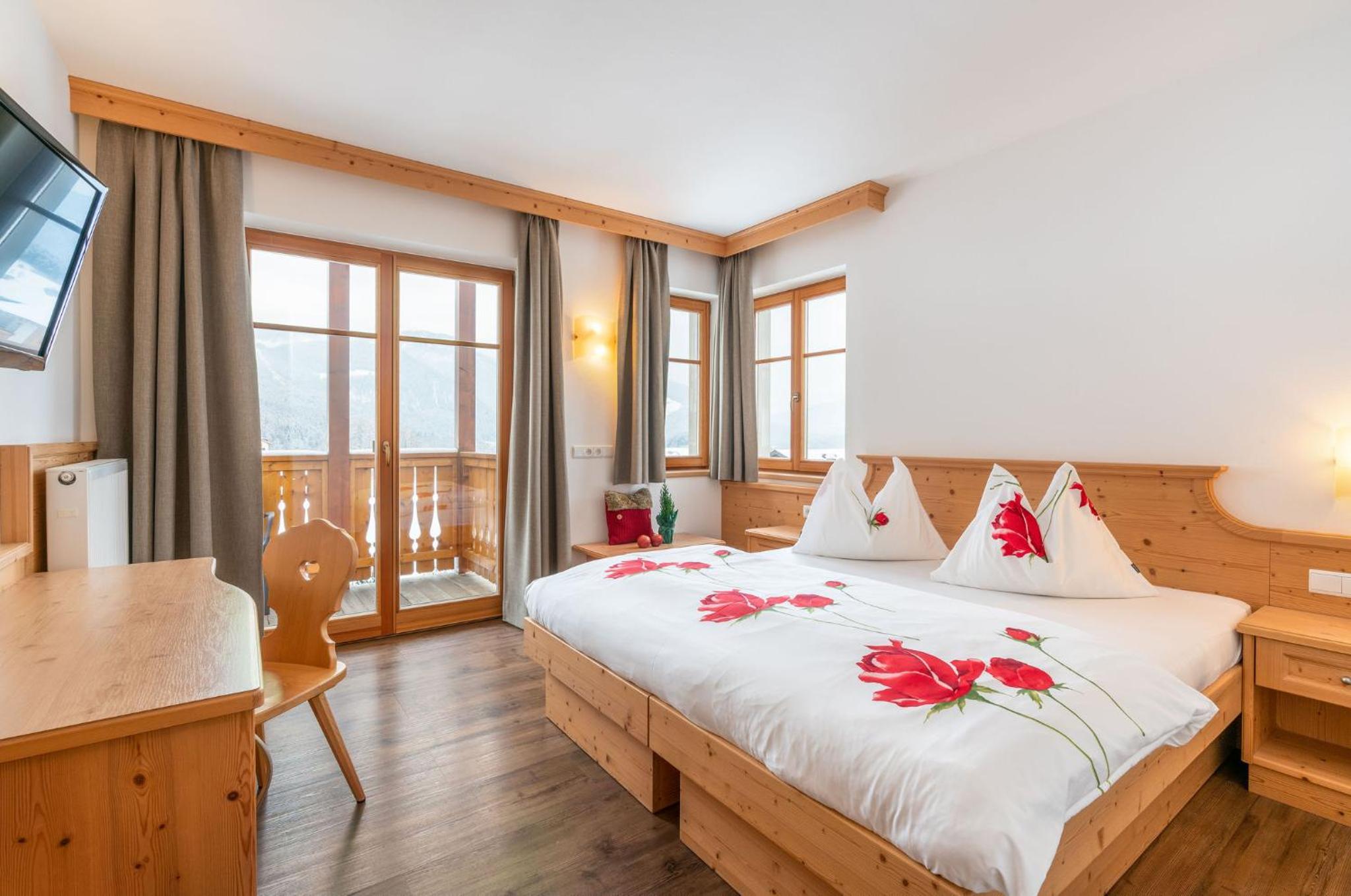 Experience breathtaking views of the mountains, forest, or town from your own furnished balcony at Hotel Lindnerhof. The traditional decor and warm colors create a cozy atmosphere for your stay.