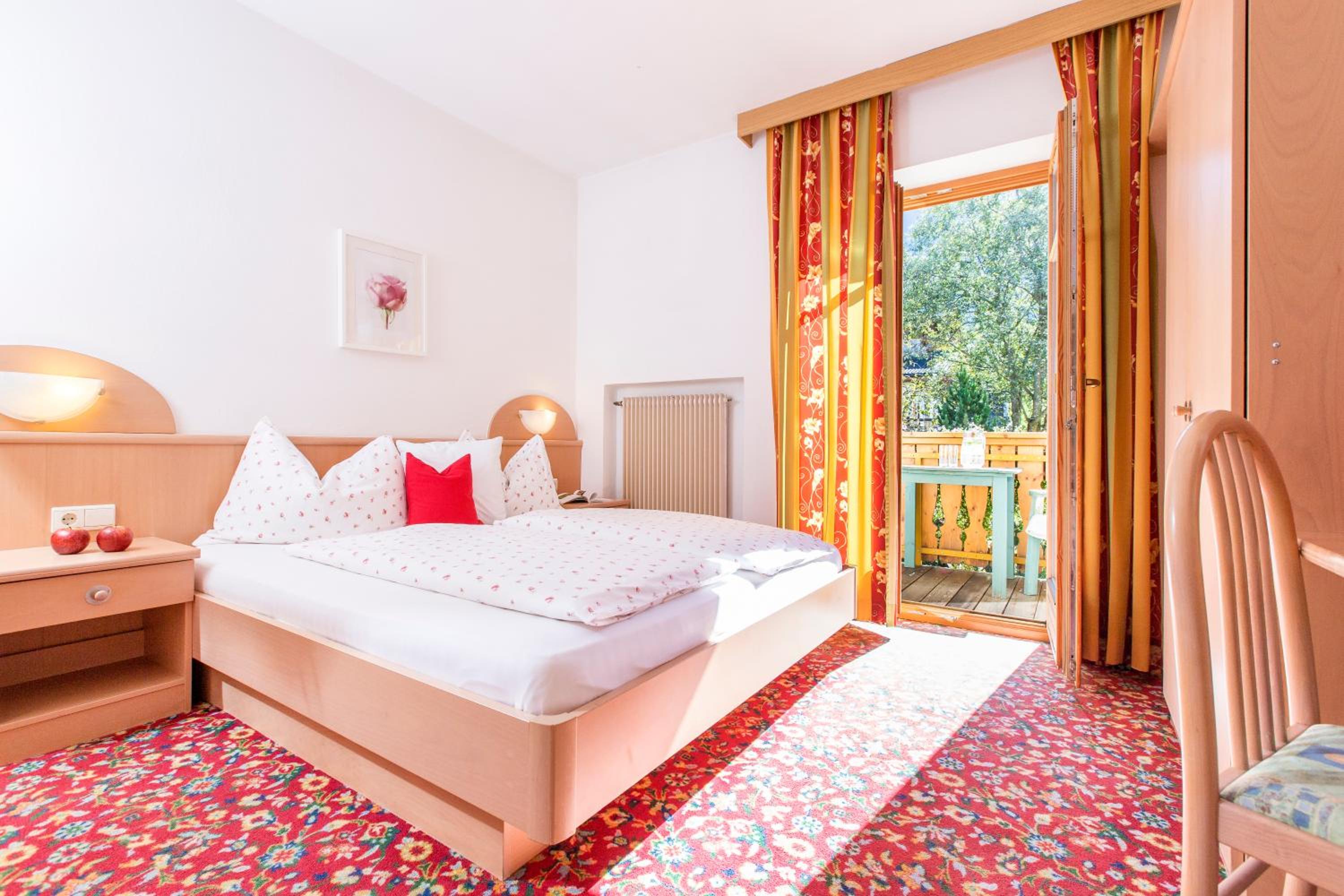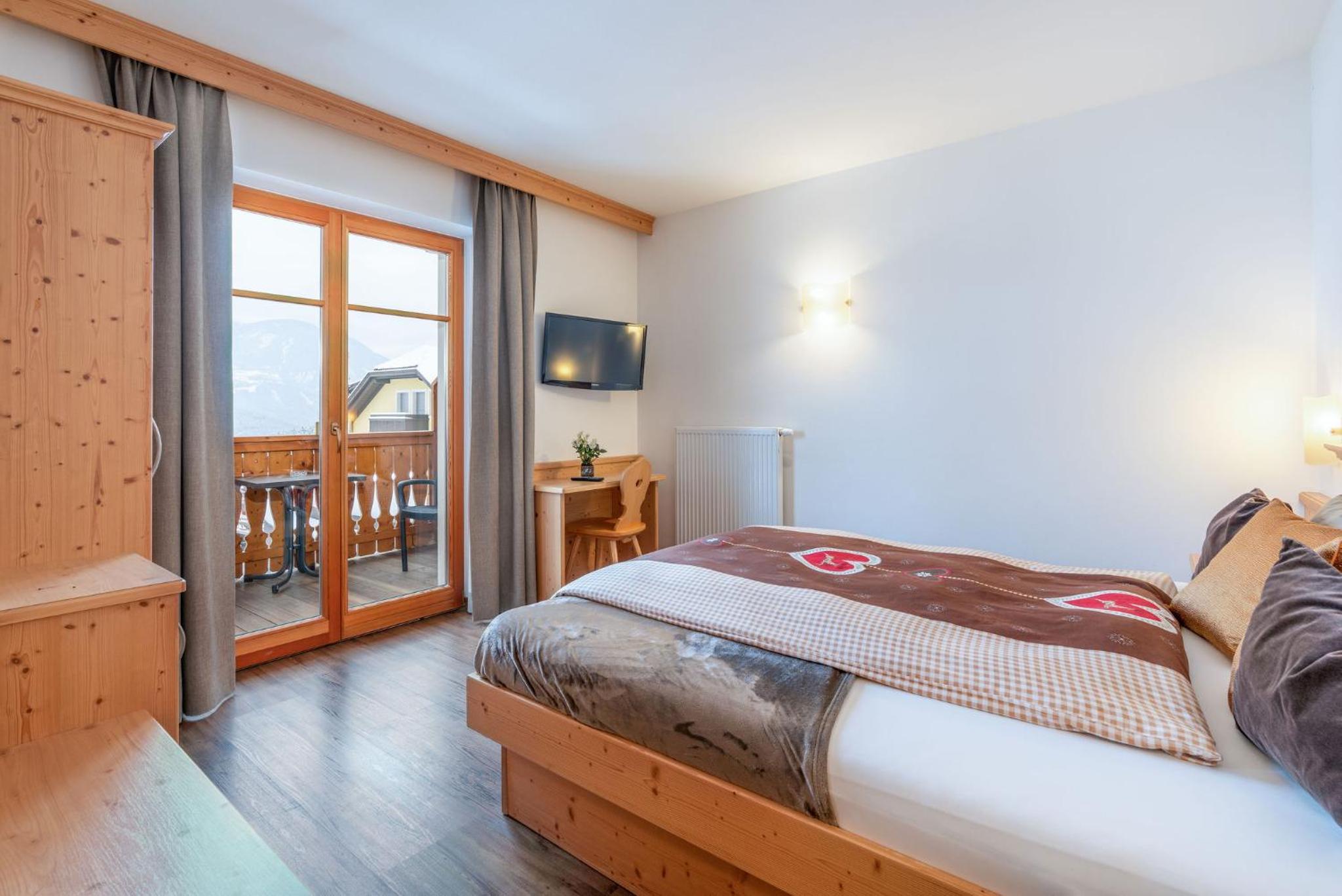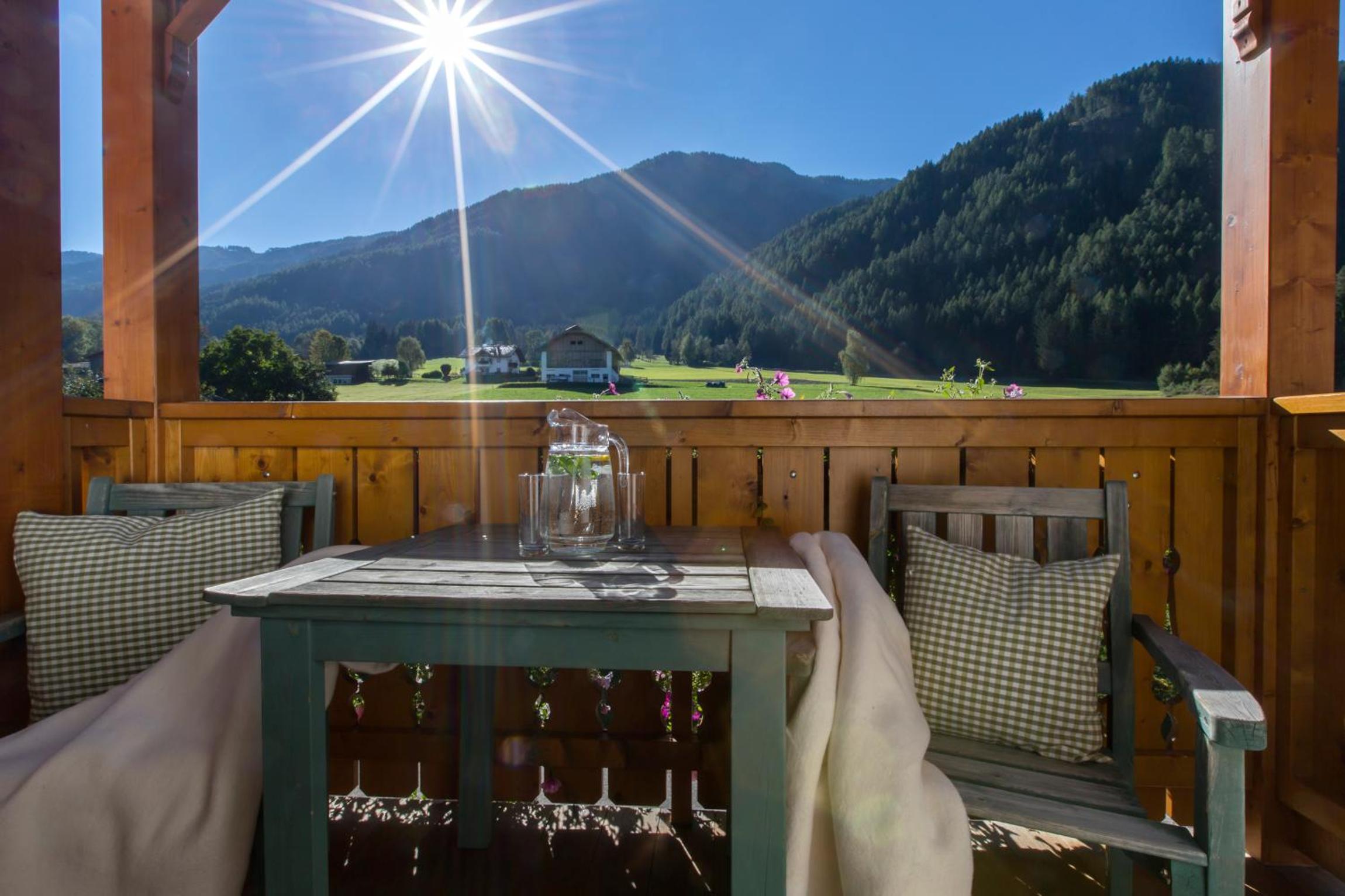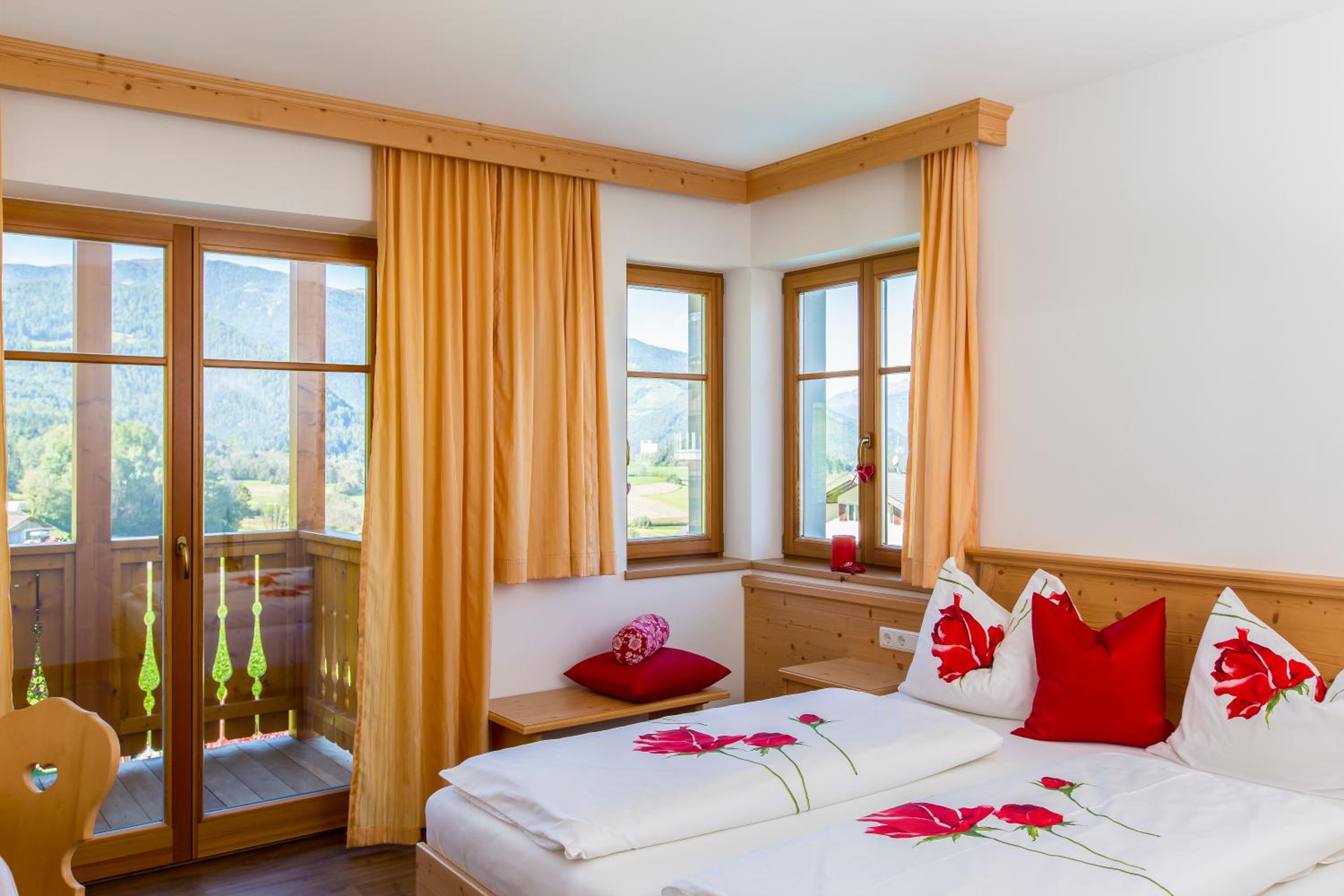 Experience breathtaking views of the mountains, forest, or town from your own furnished balcony at Hotel Lindnerhof. The traditional decor and warm colors create a cozy atmosphere for your stay.