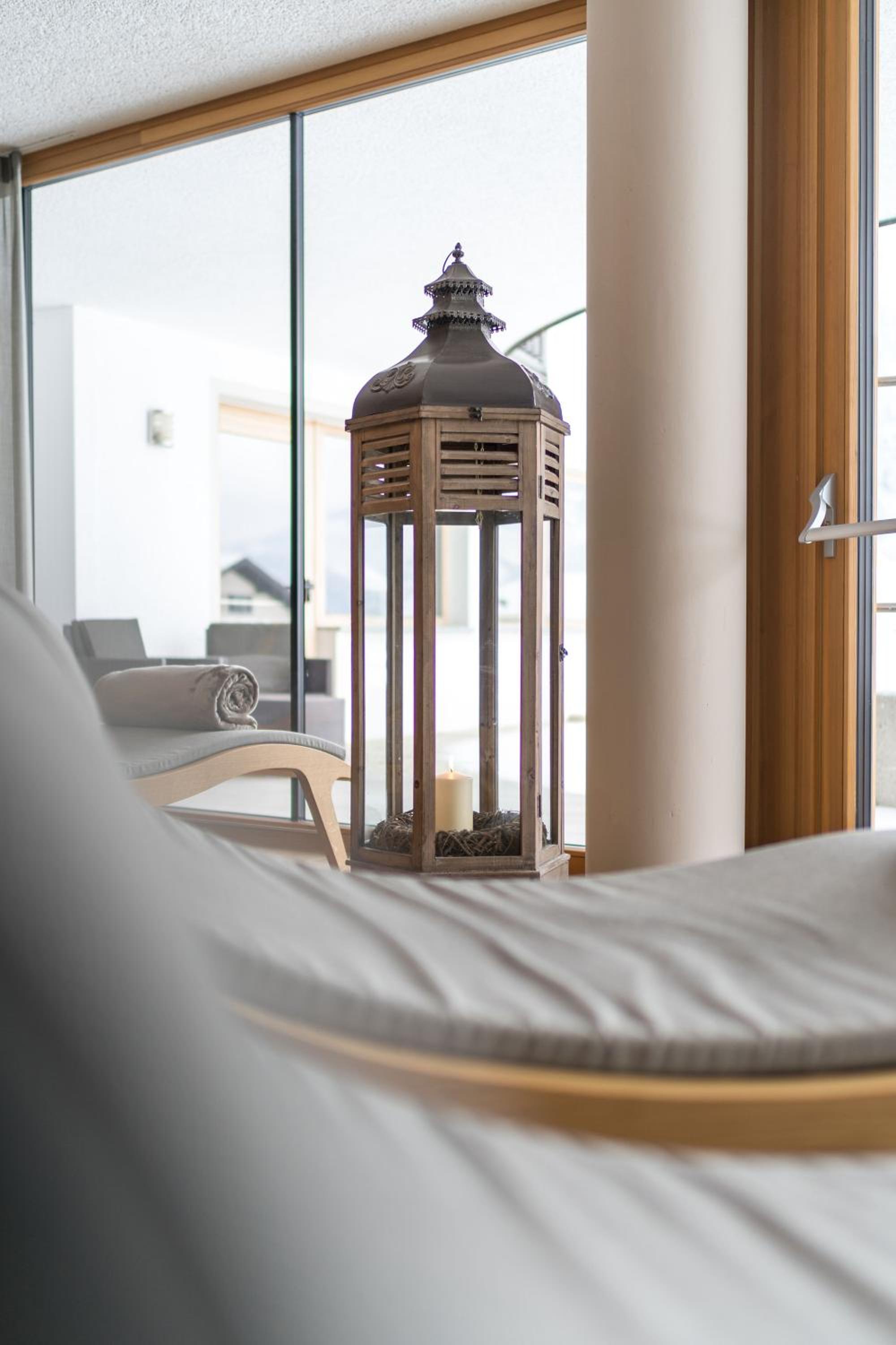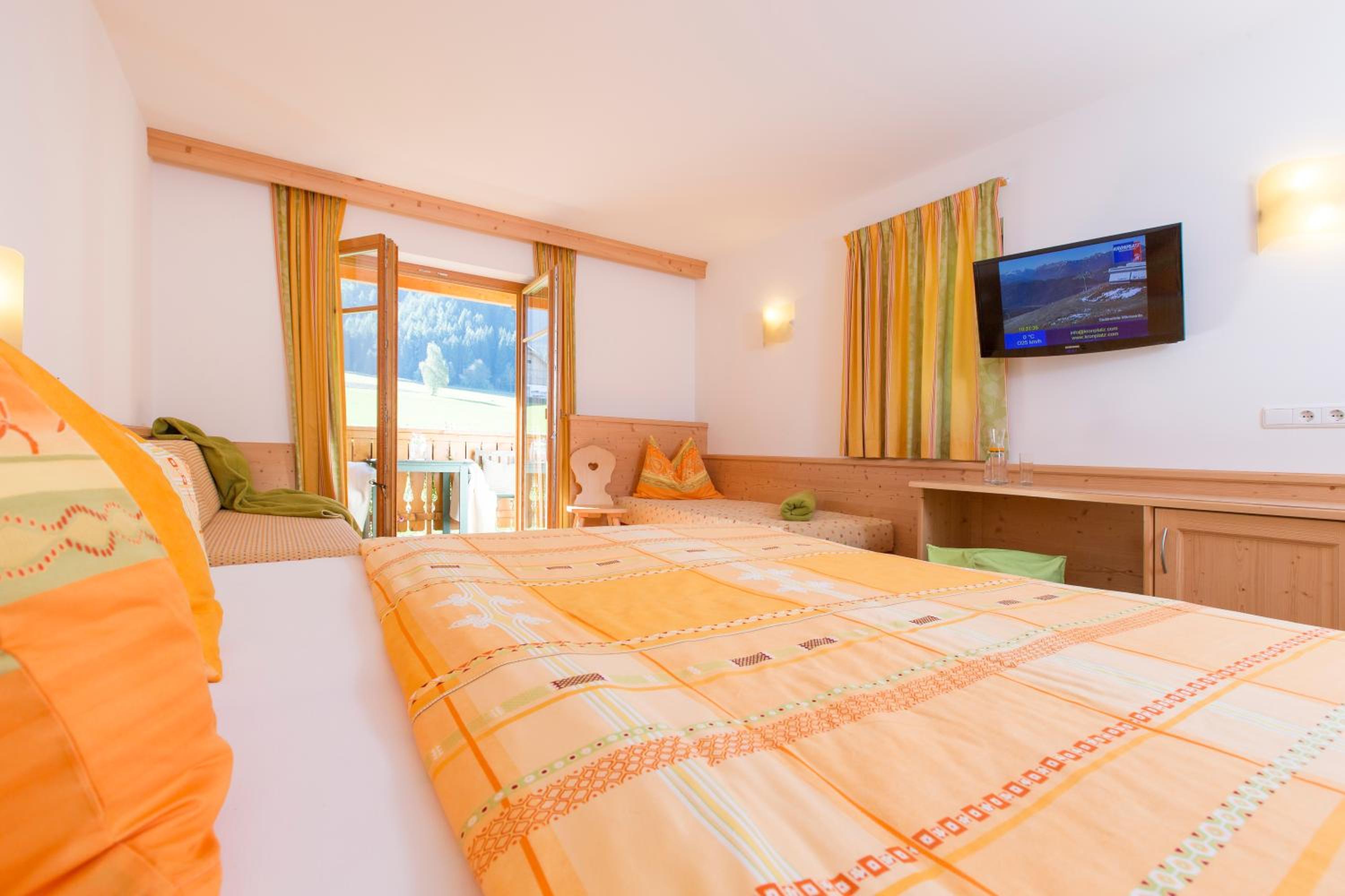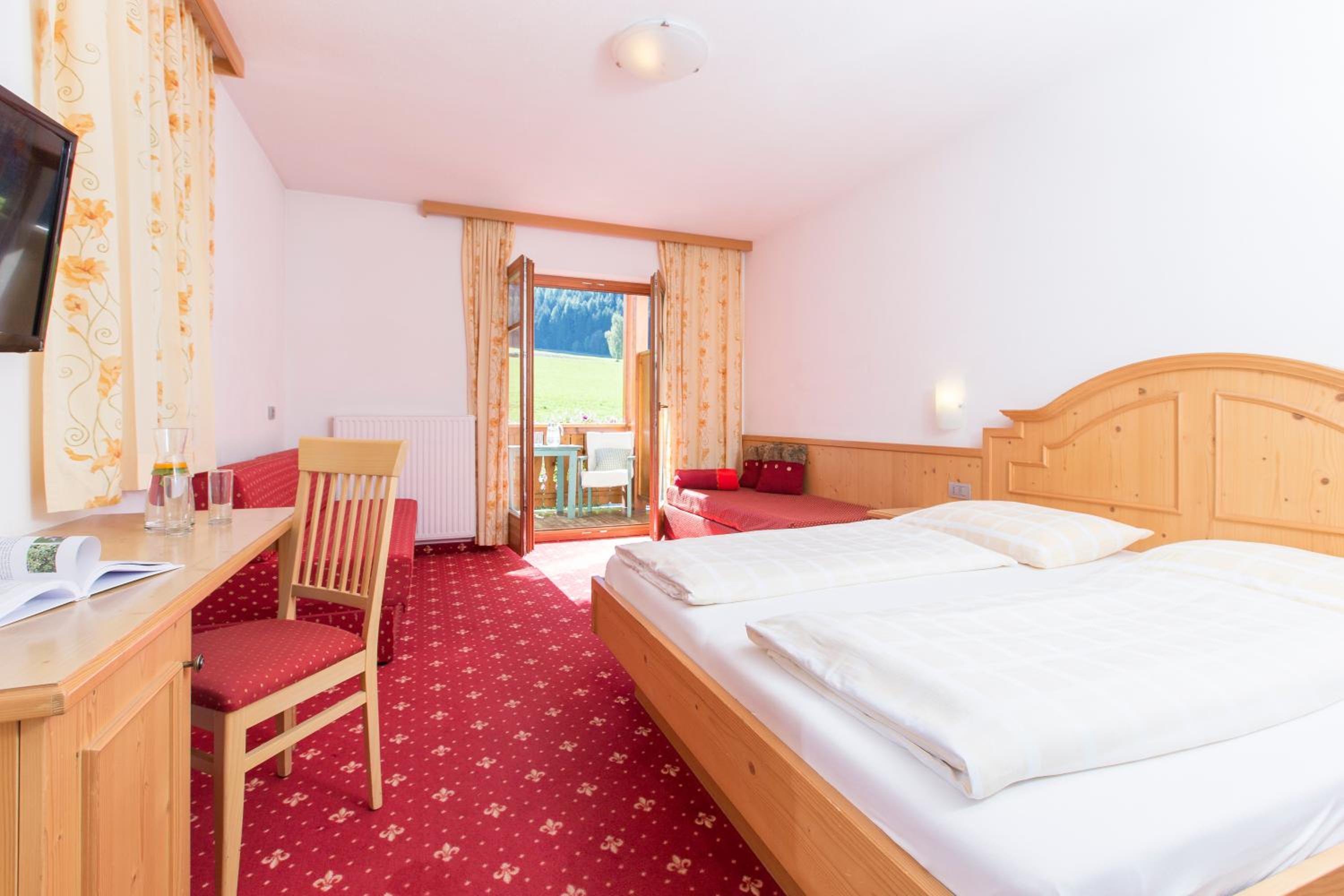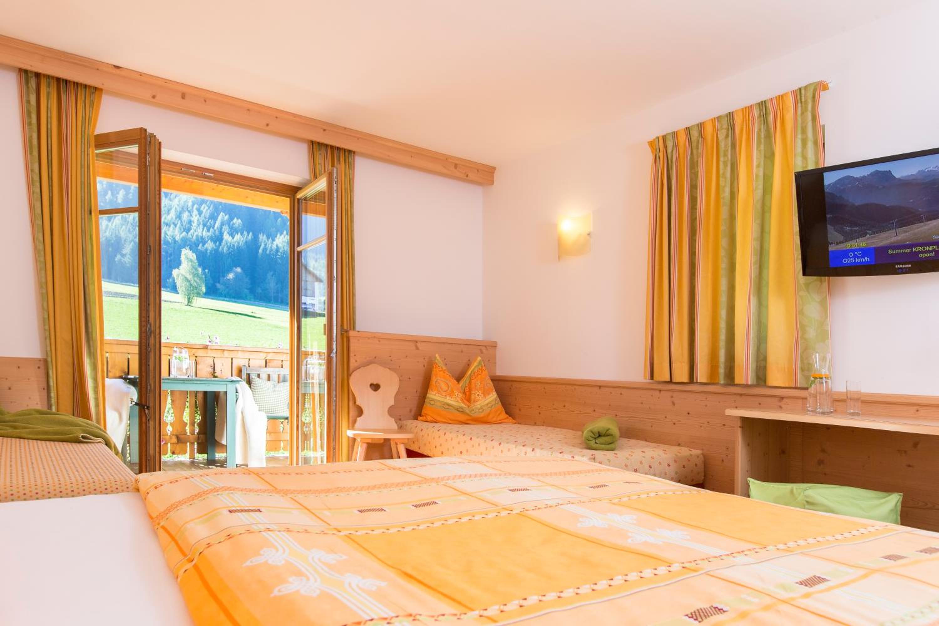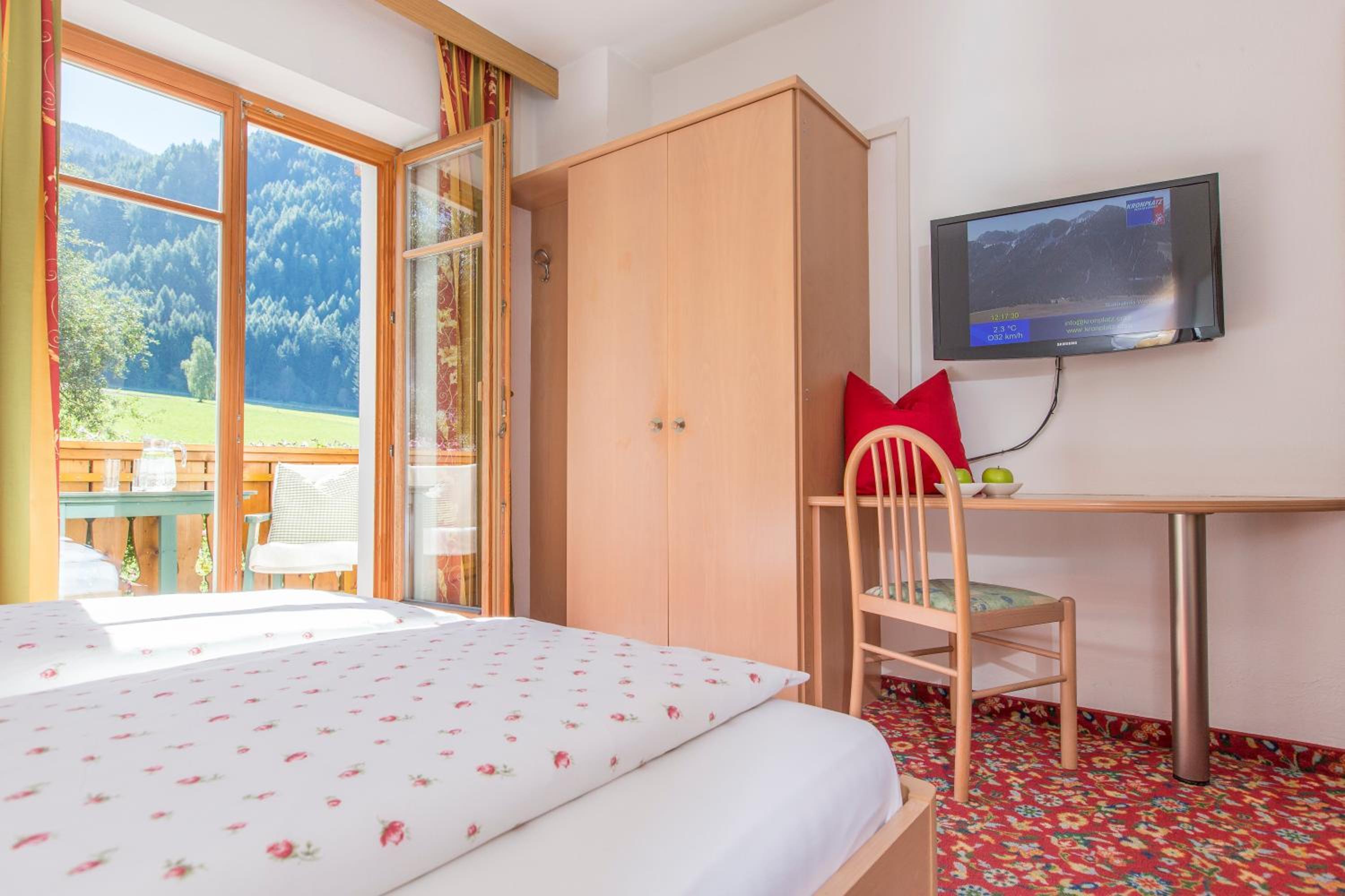 Experience breathtaking views of the mountains, forest, or town from your own furnished balcony at Hotel Lindnerhof. The traditional decor and warm colors create a cozy atmosphere for your stay.