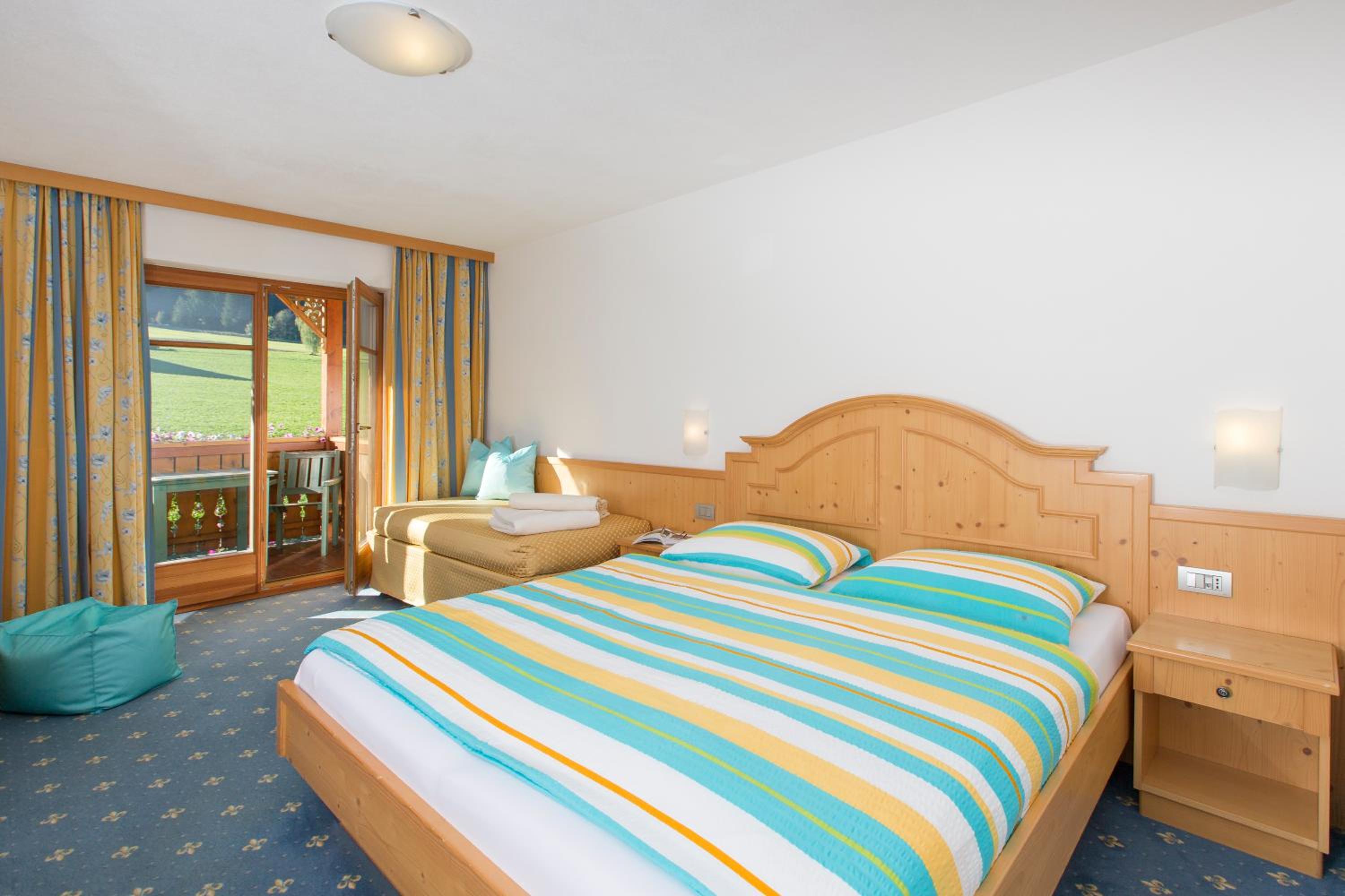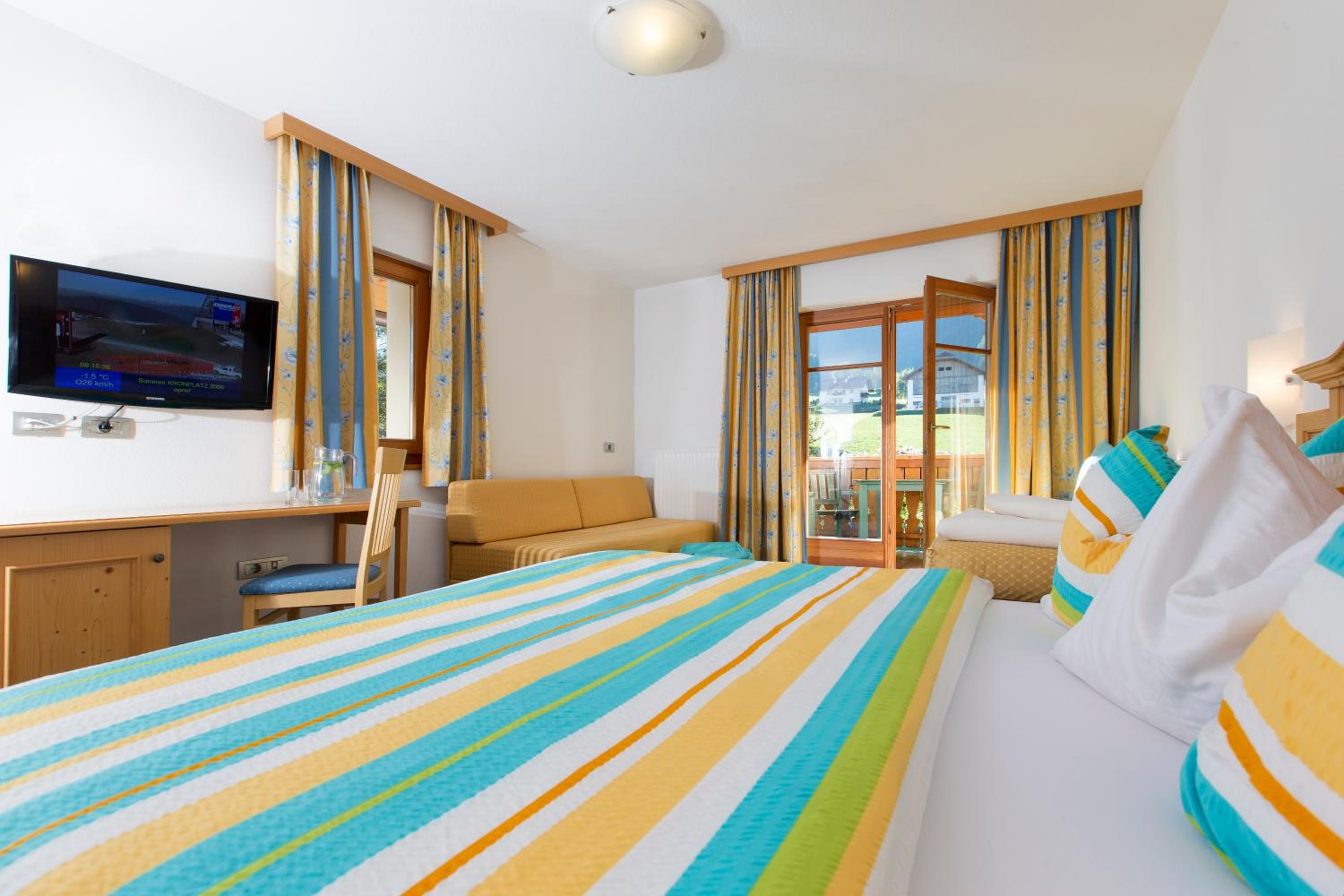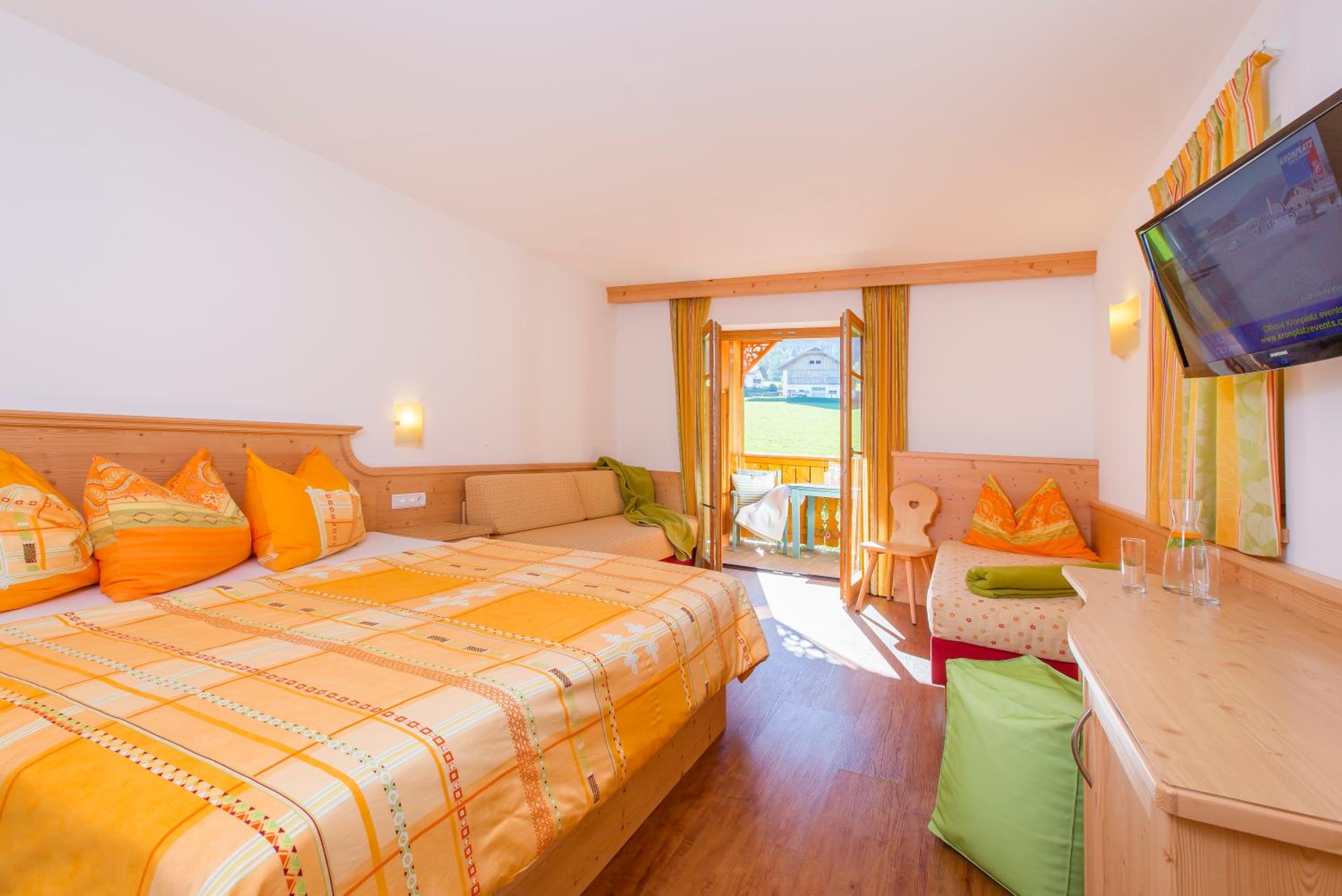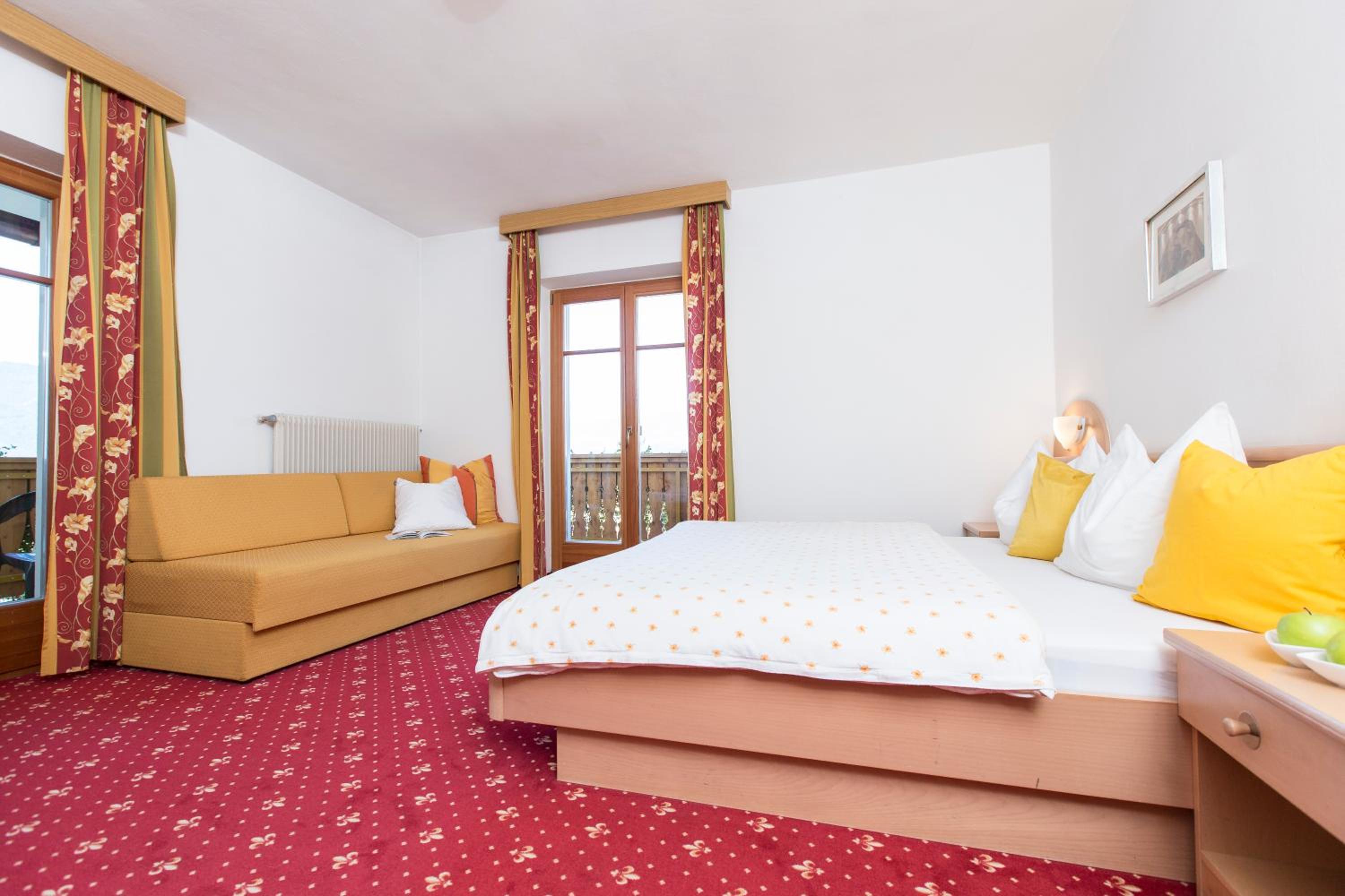 Experience breathtaking views of the mountains, forest, or town from your own furnished balcony at Hotel Lindnerhof. The traditional decor and warm colors create a cozy atmosphere for your stay.