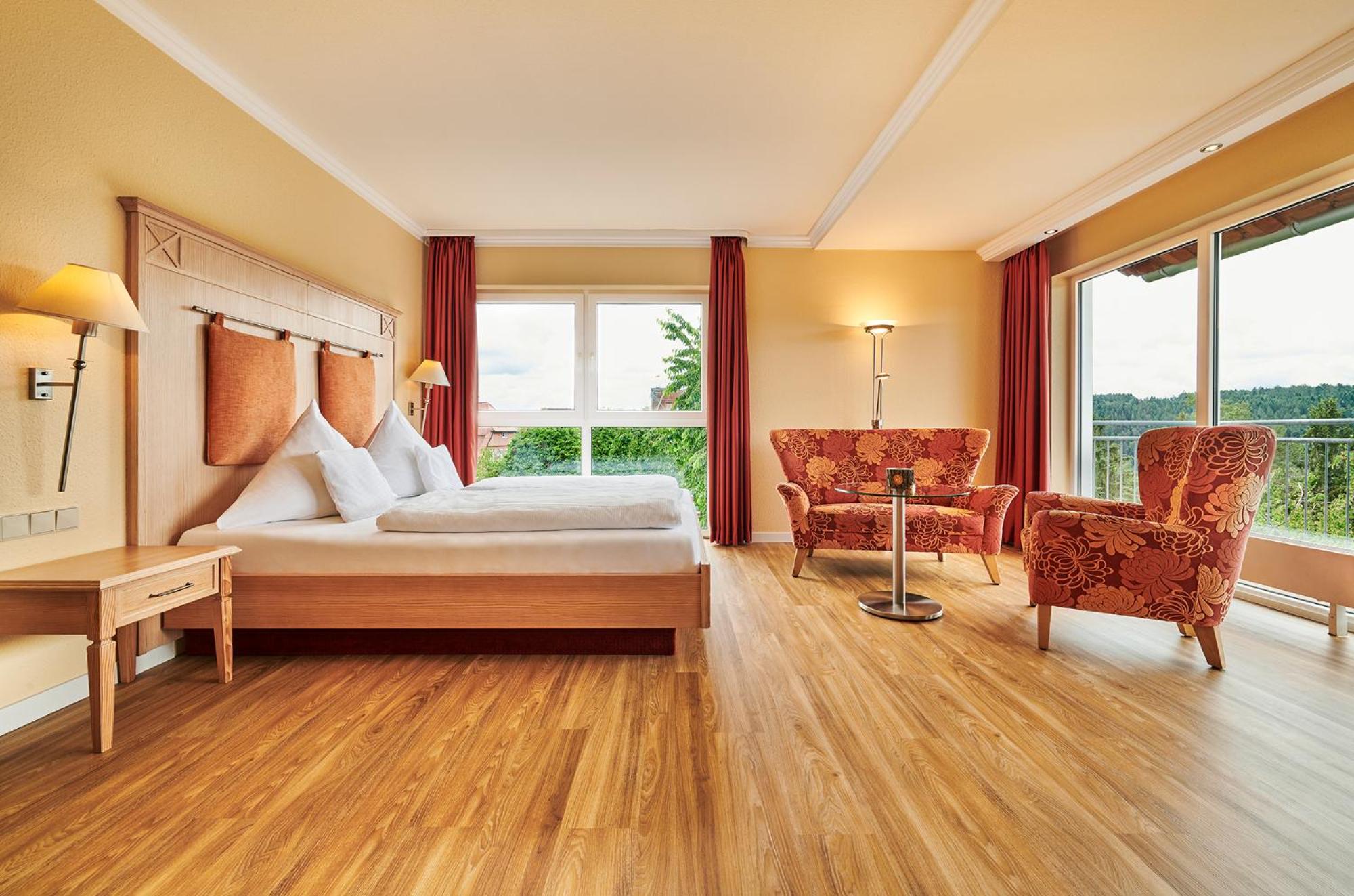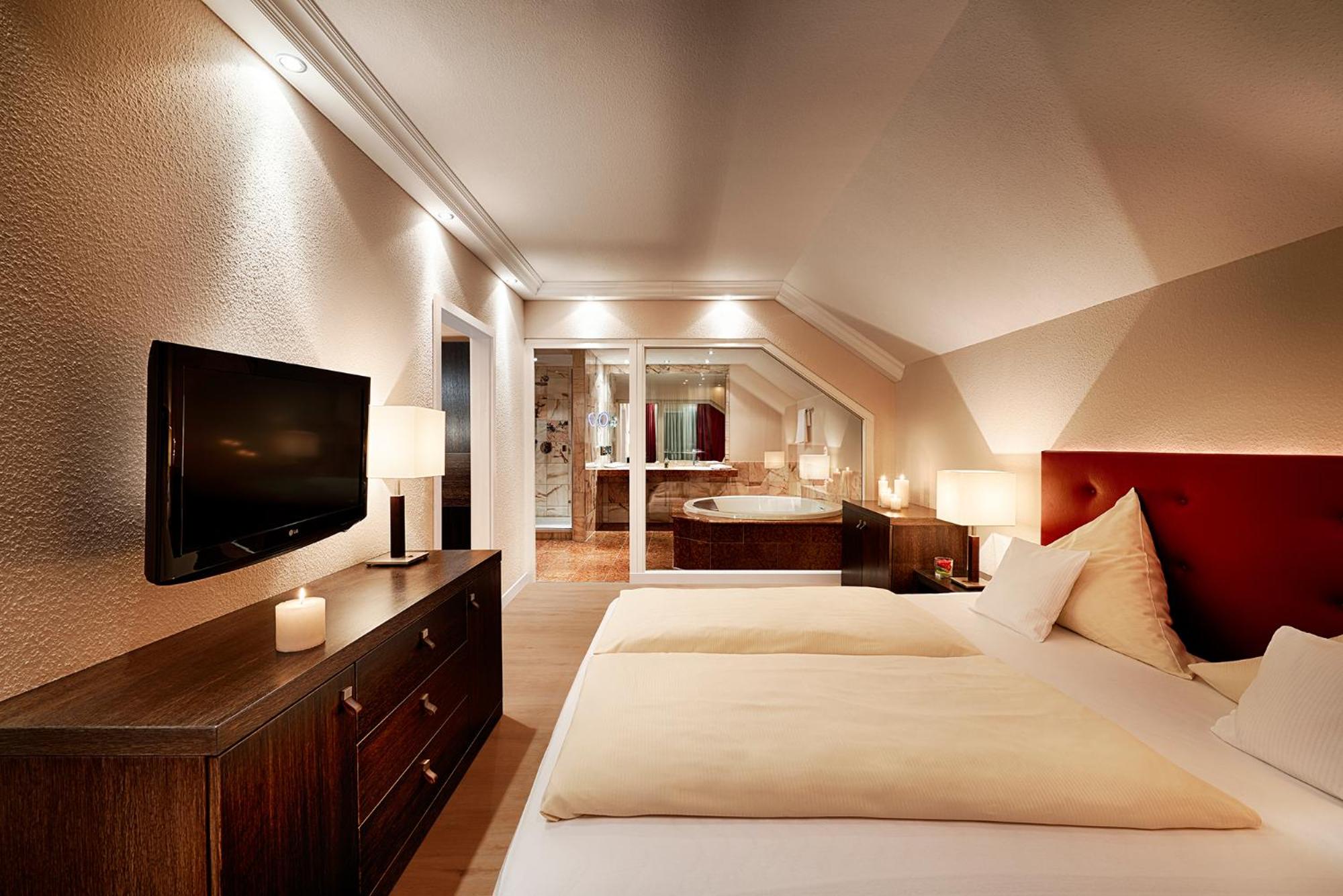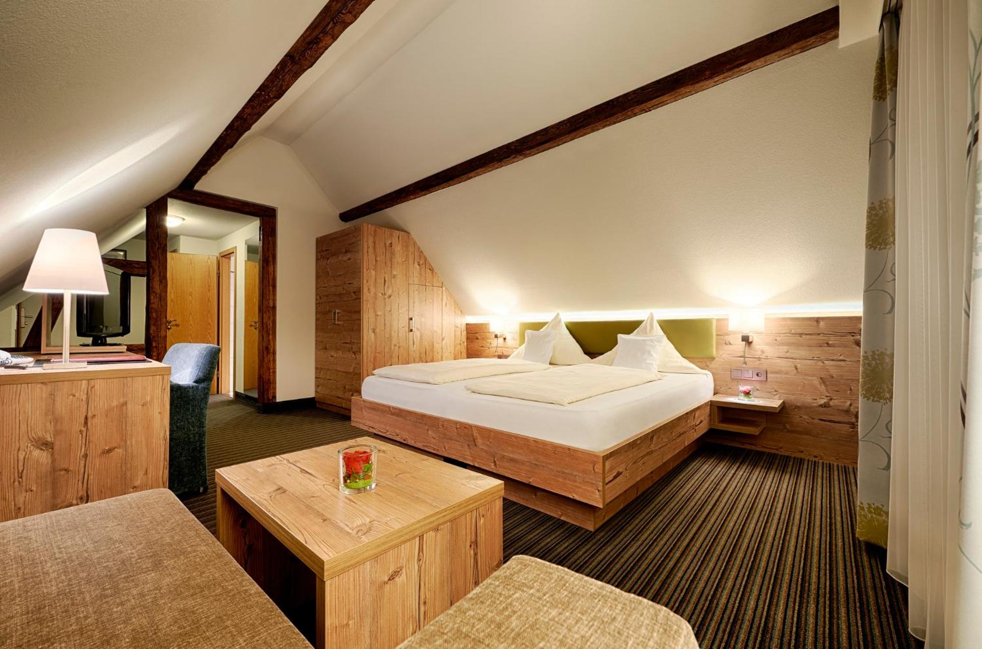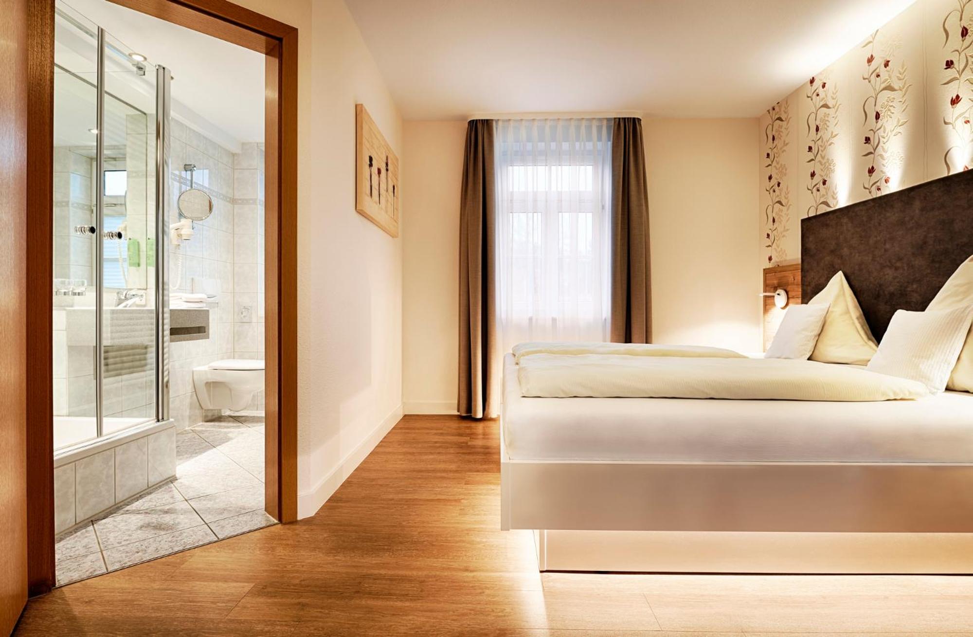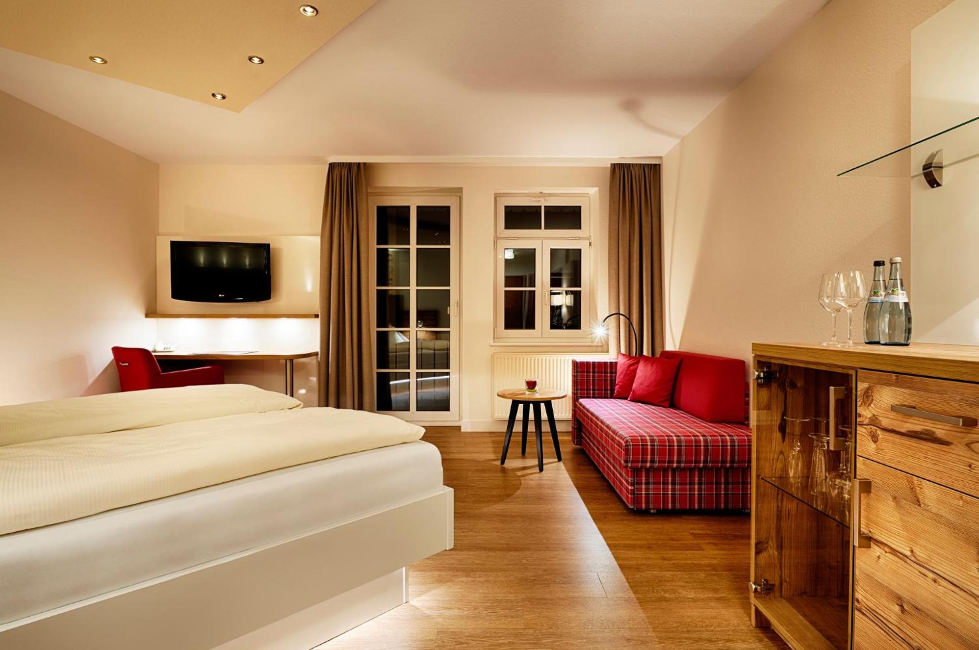 The twin 4-star hotels, Berlin's KroneLamm, offer a luxurious stay beside Stauferburg castle ruins. The non-smoking rooms feature modern furniture, WiFi, and complimentary bathrobes. Guests can enjoy three restaurants, including the Michelin-starred gourmet restaurant Berlins Krone, and a daily snack buffet.