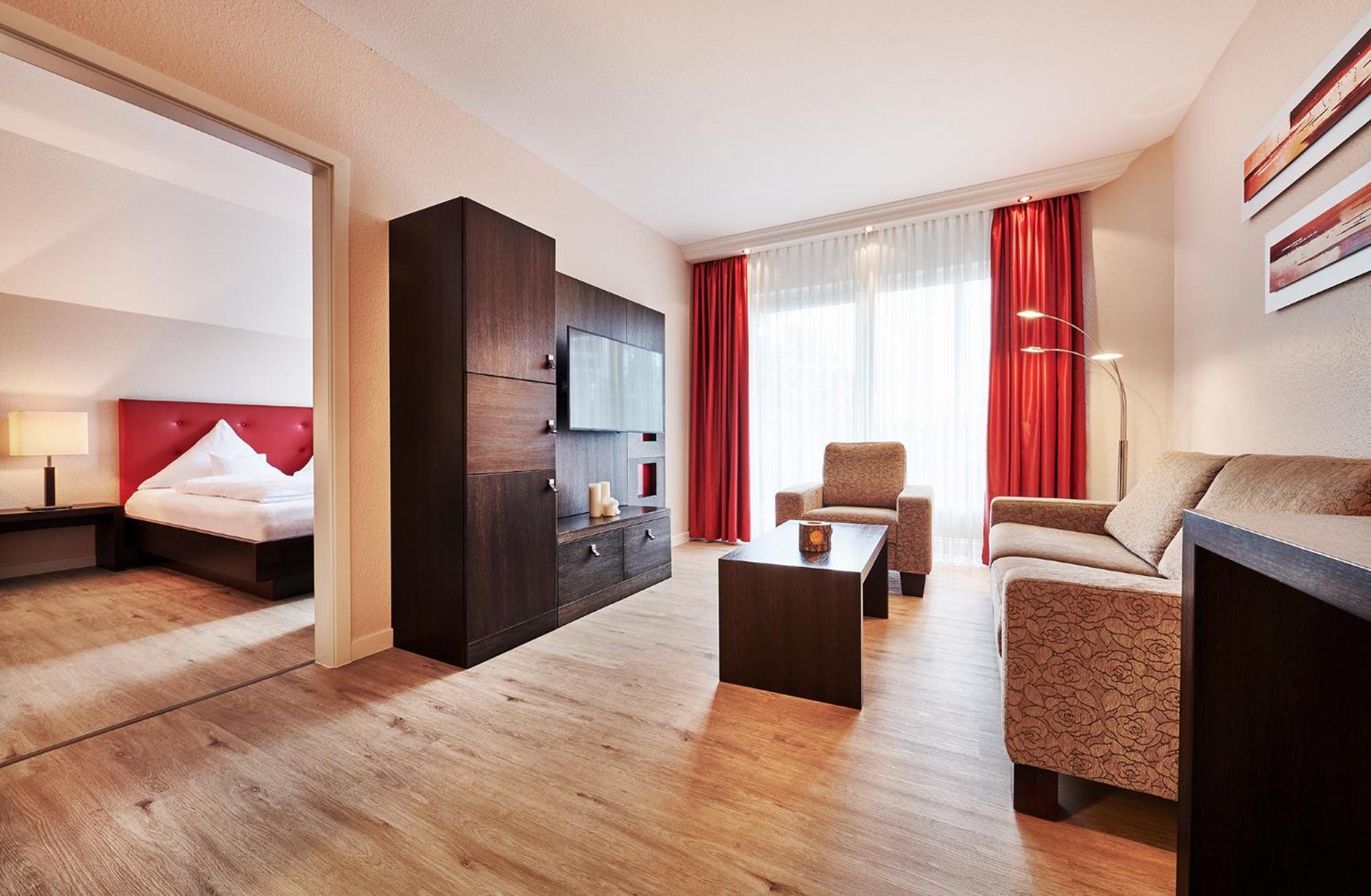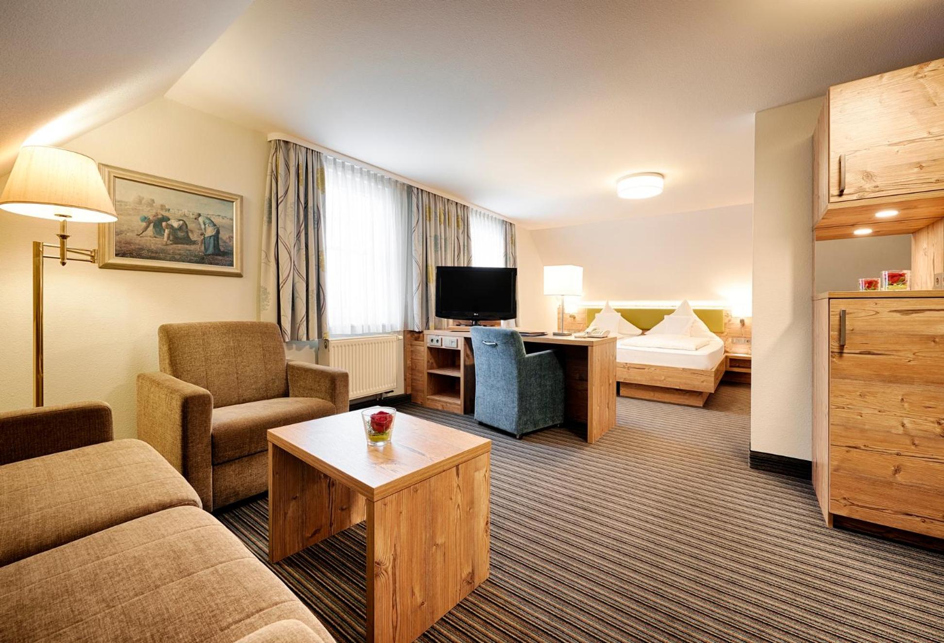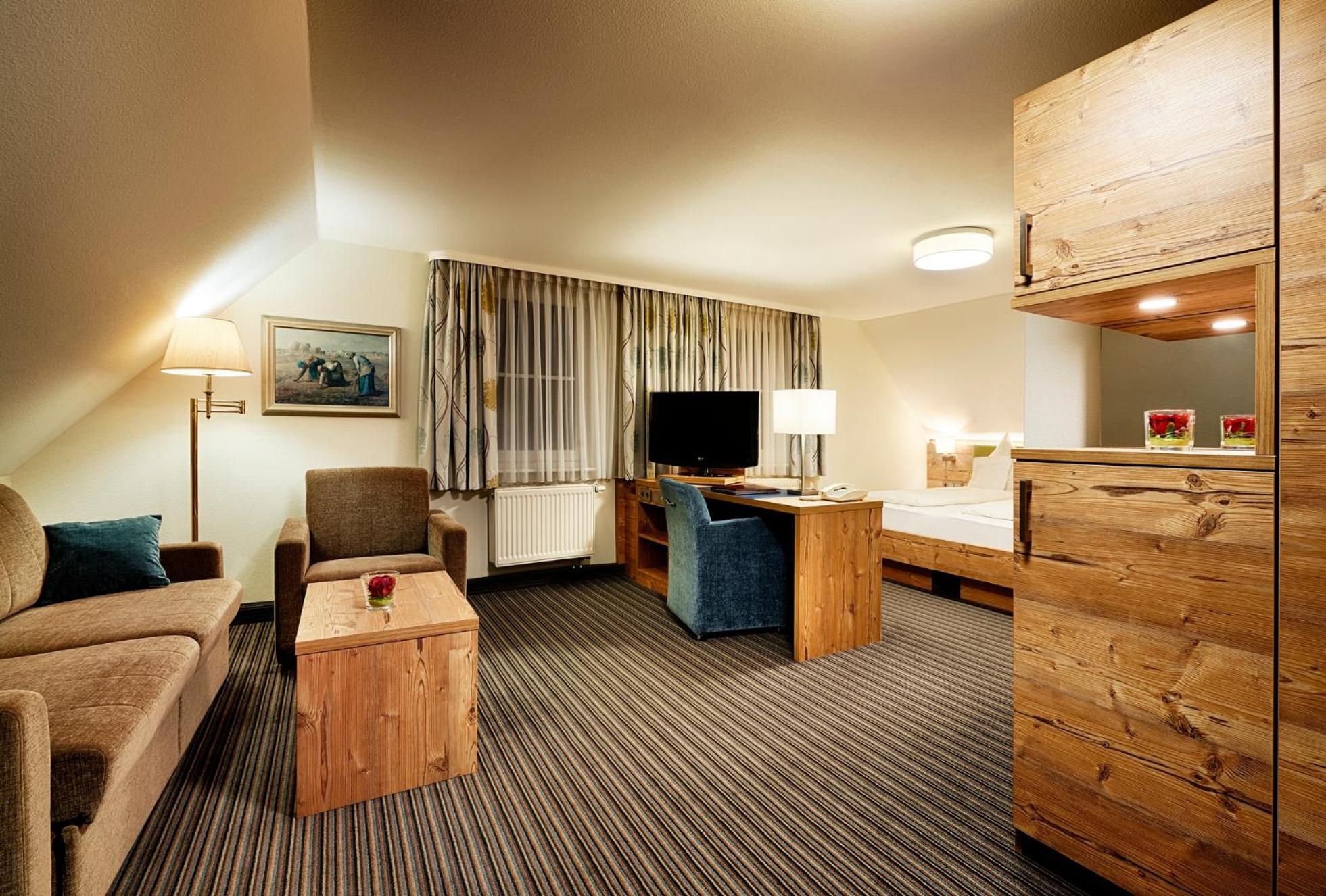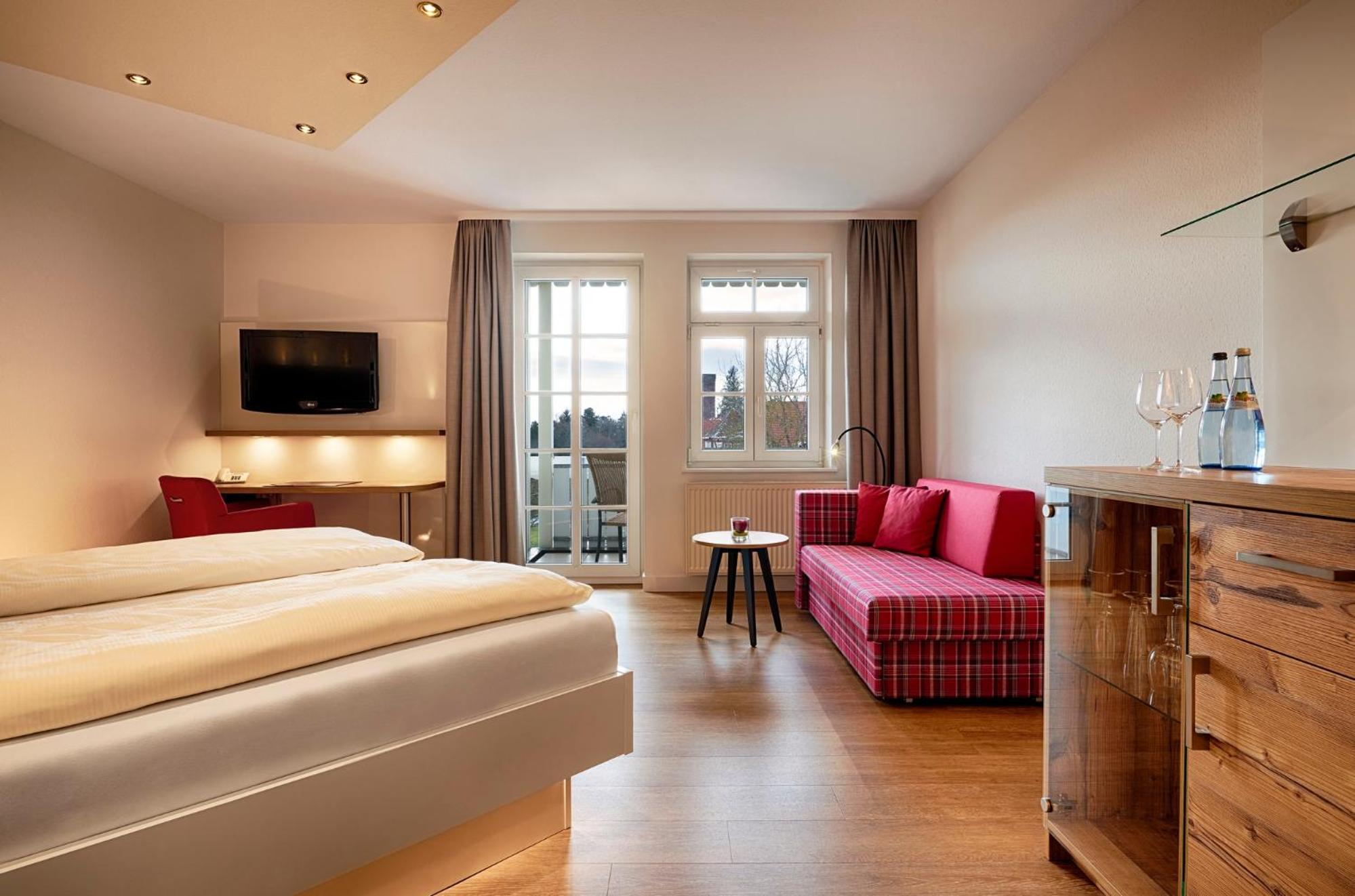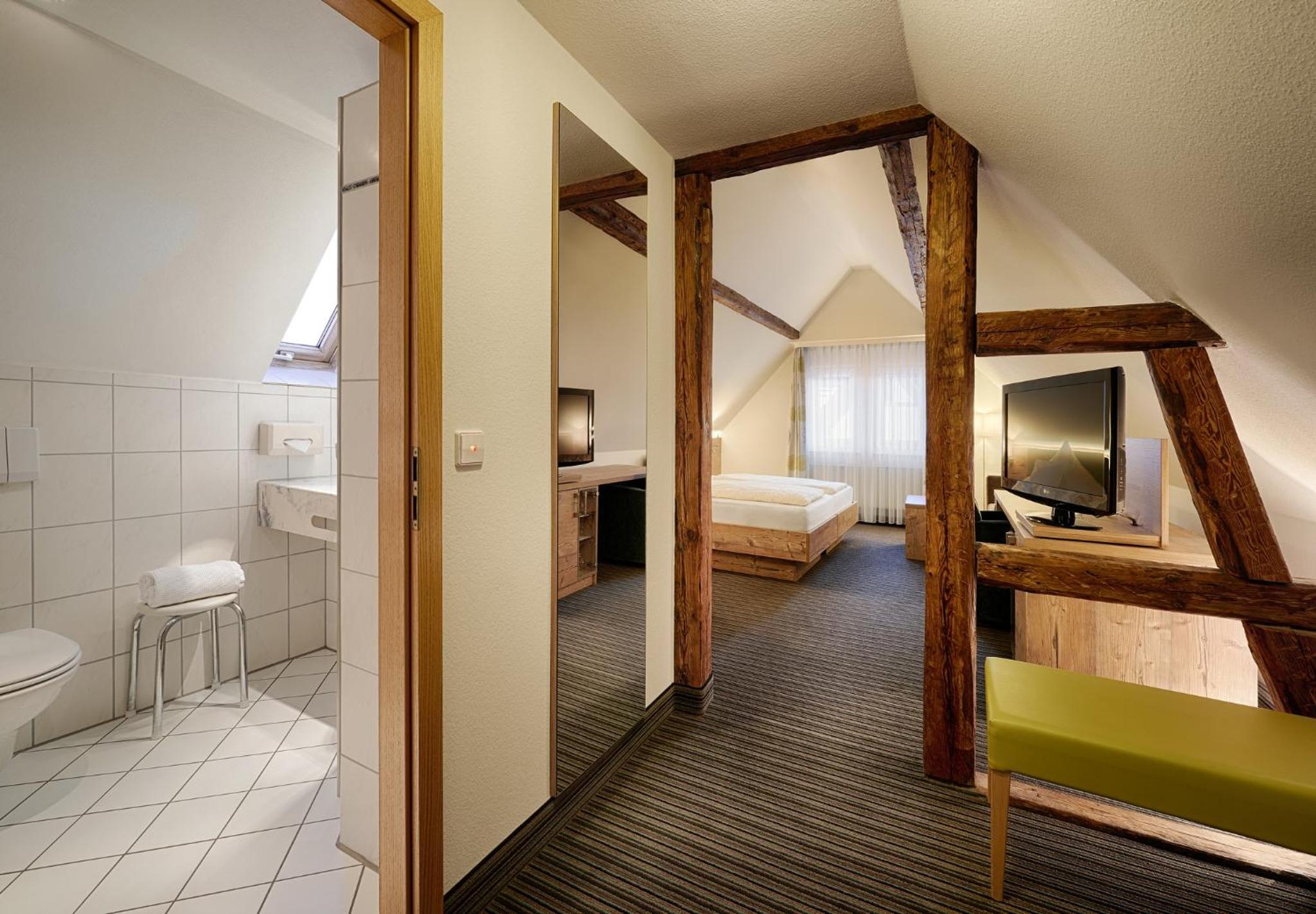 The twin 4-star hotels, Berlin's KroneLamm, offer a luxurious stay beside Stauferburg castle ruins. The non-smoking rooms feature modern furniture, WiFi, and complimentary bathrobes. Guests can enjoy three restaurants, including the Michelin-starred gourmet restaurant Berlins Krone, and a daily snack buffet.