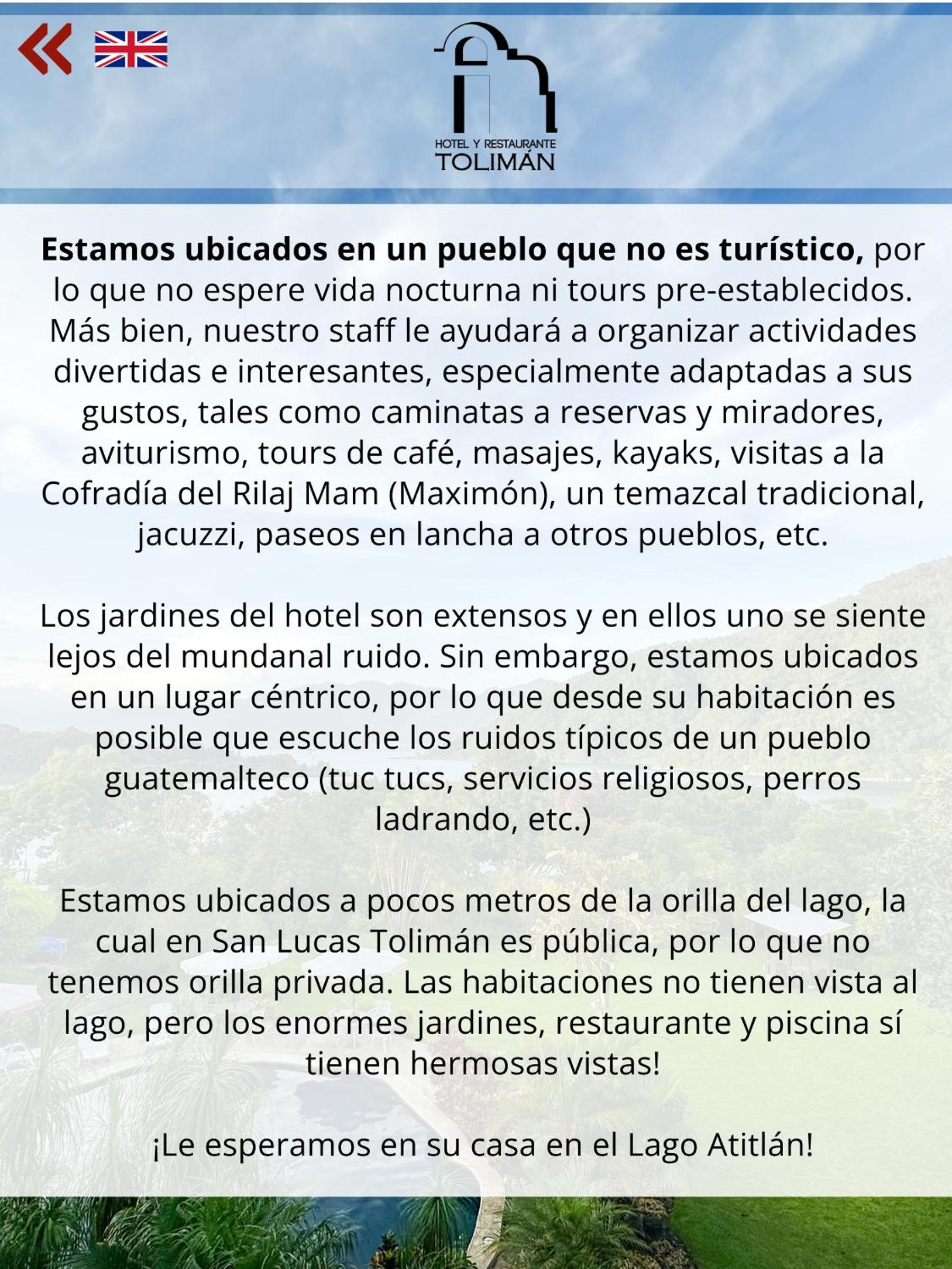 Ready to experience the beauty of Lake Atitlán? Book your stay at Hotel Toliman now for an unforgettable getaway.