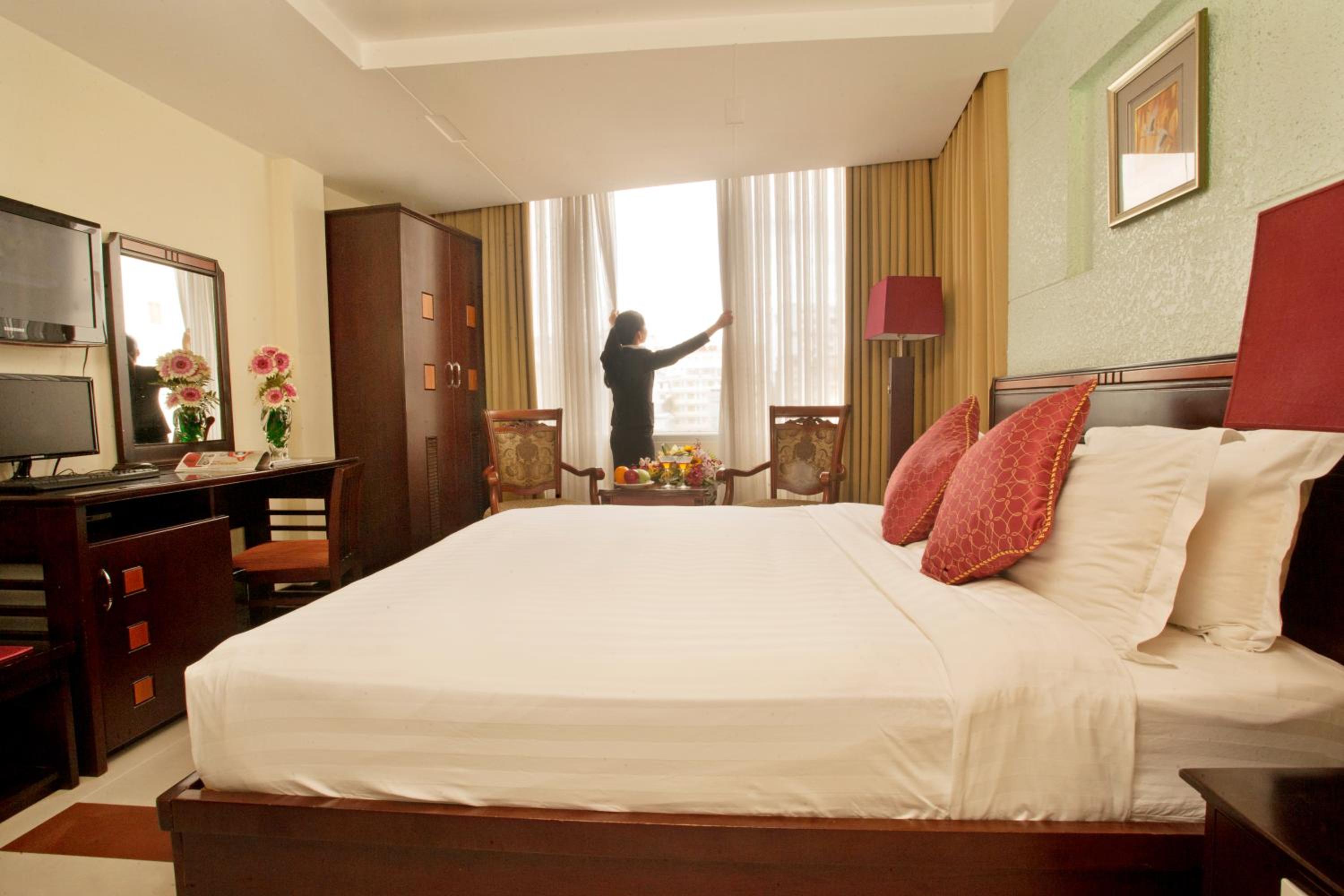 Rooms feature classic Vietnamese décor, minibar, TV with satellite channels, and spacious en suite bathrooms with premium toiletries.