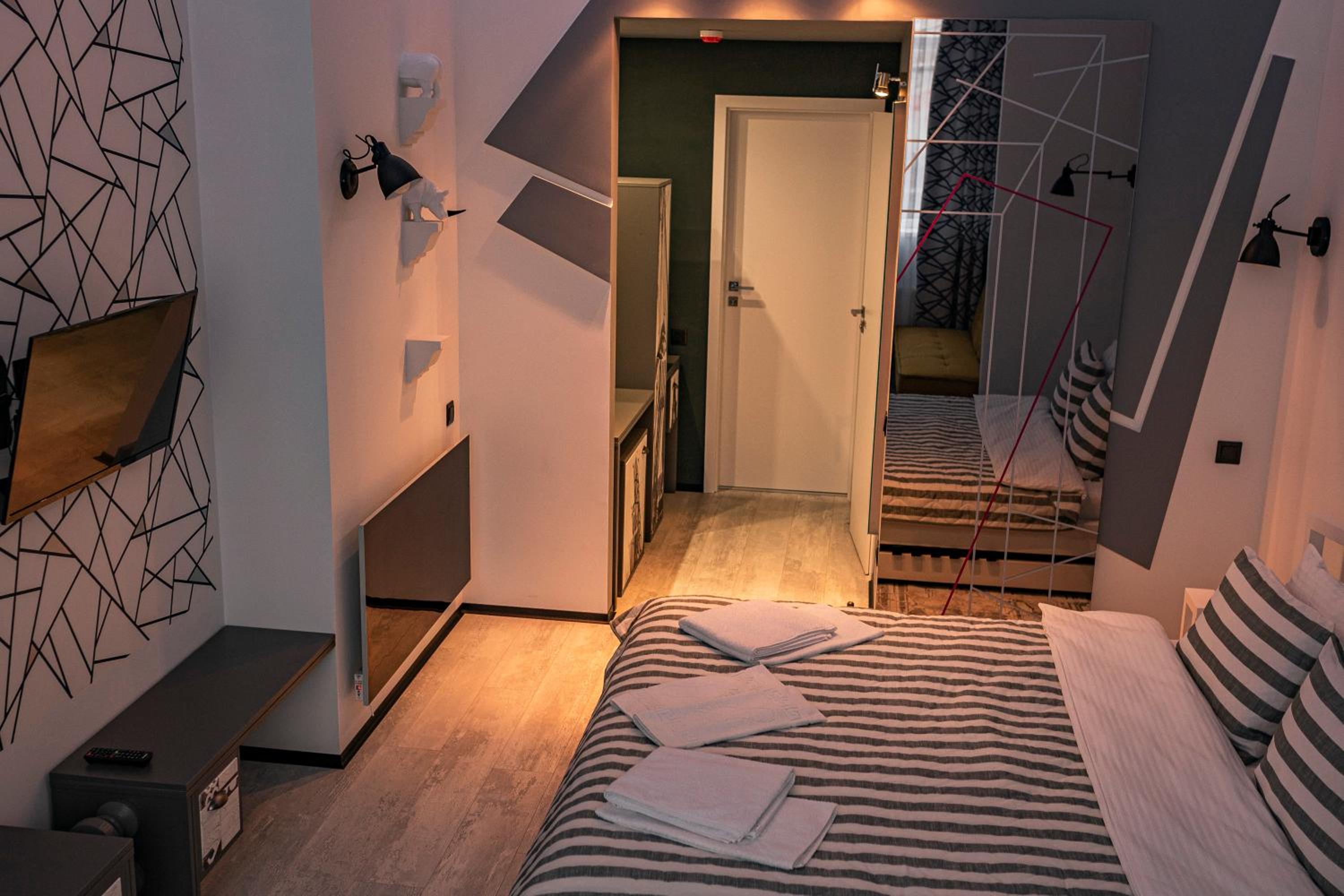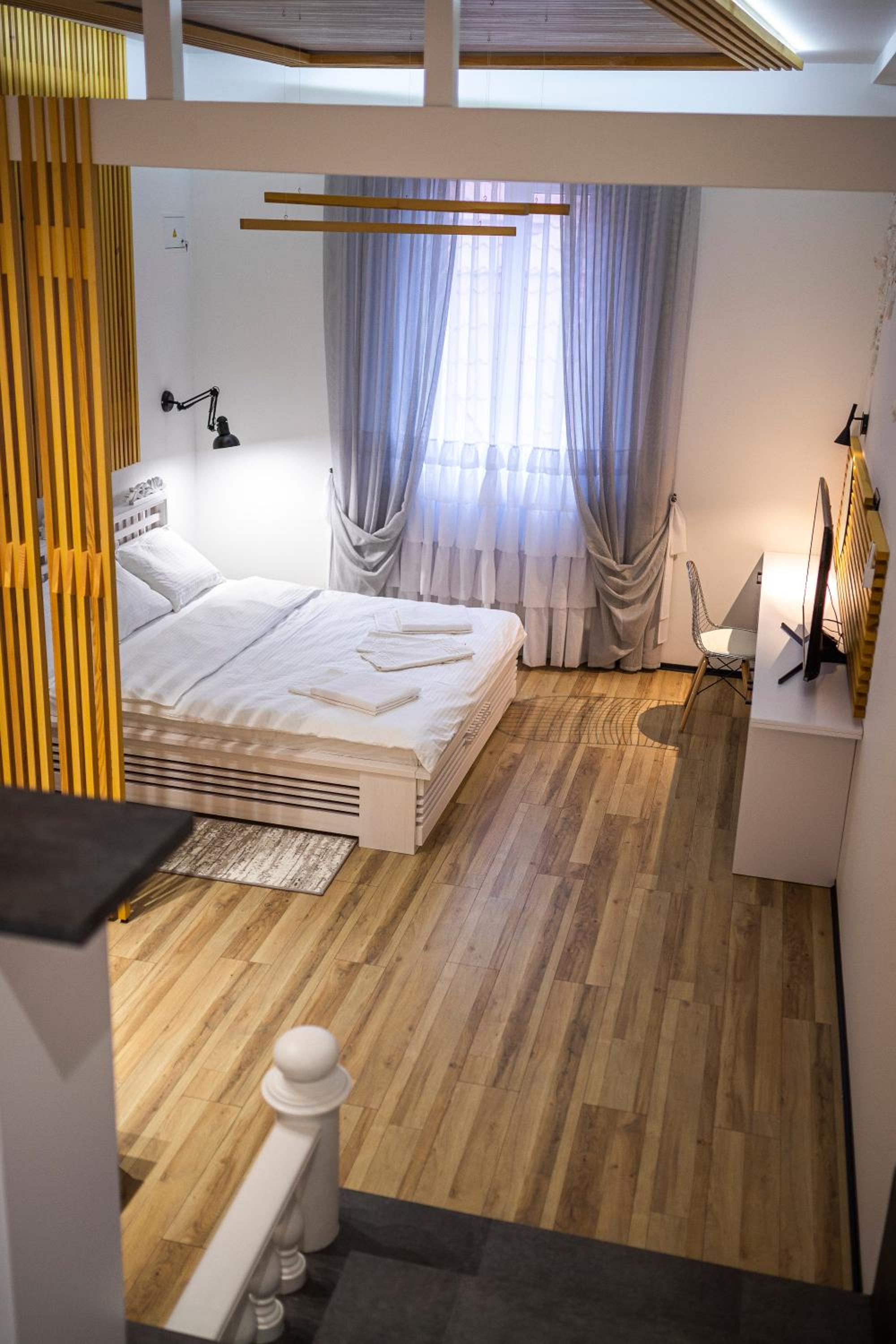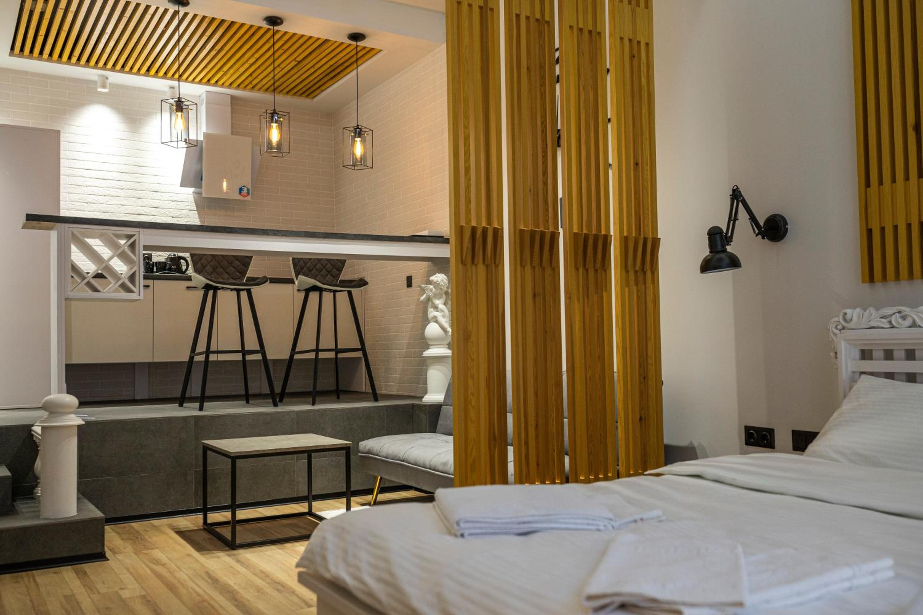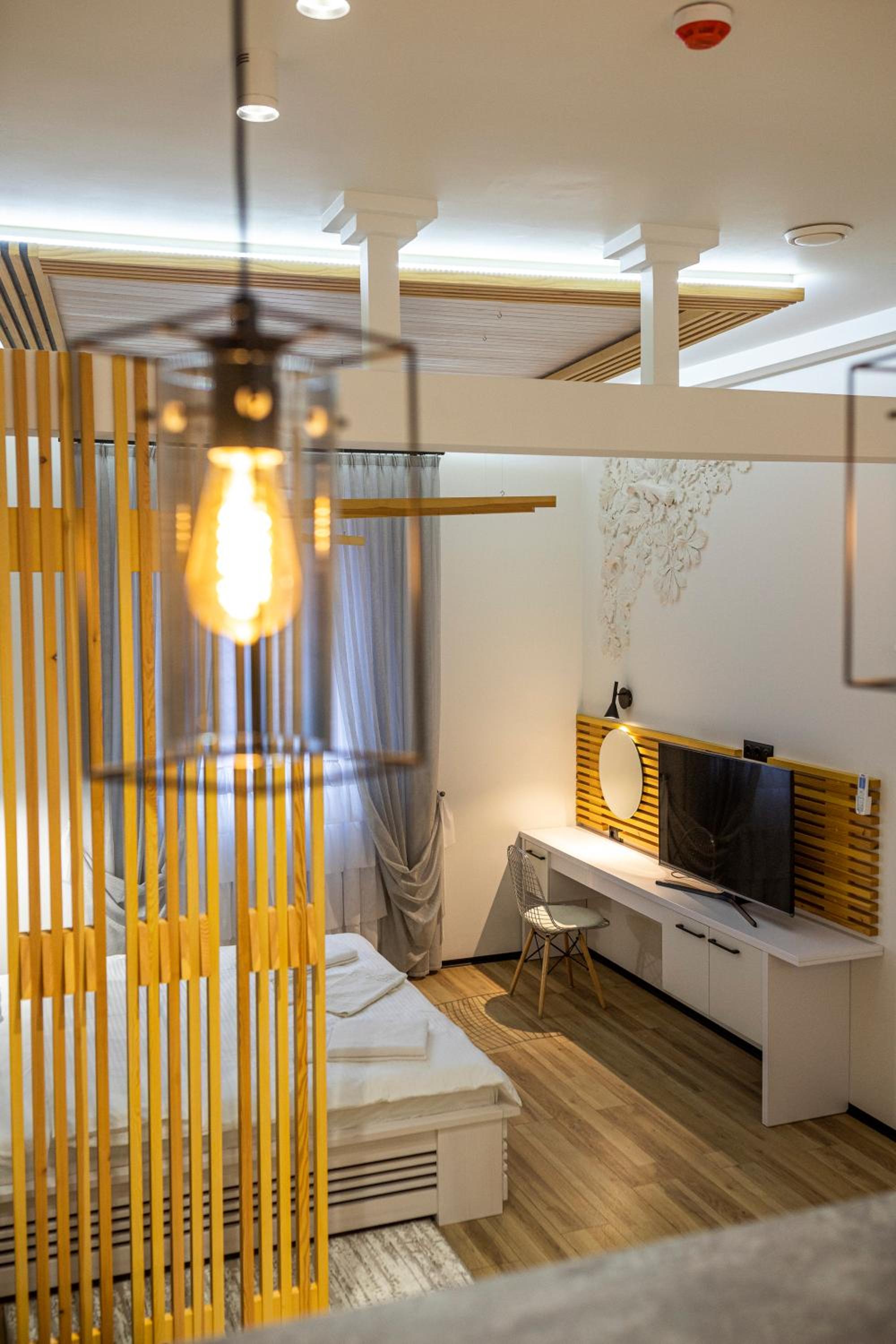 Le Каприз offers elegantly designed rooms with modern amenities, including flat-screen TVs and cozy bedding for a comfortable stay. Some rooms even feature convenient kitchenettes for added convenience during your visit.