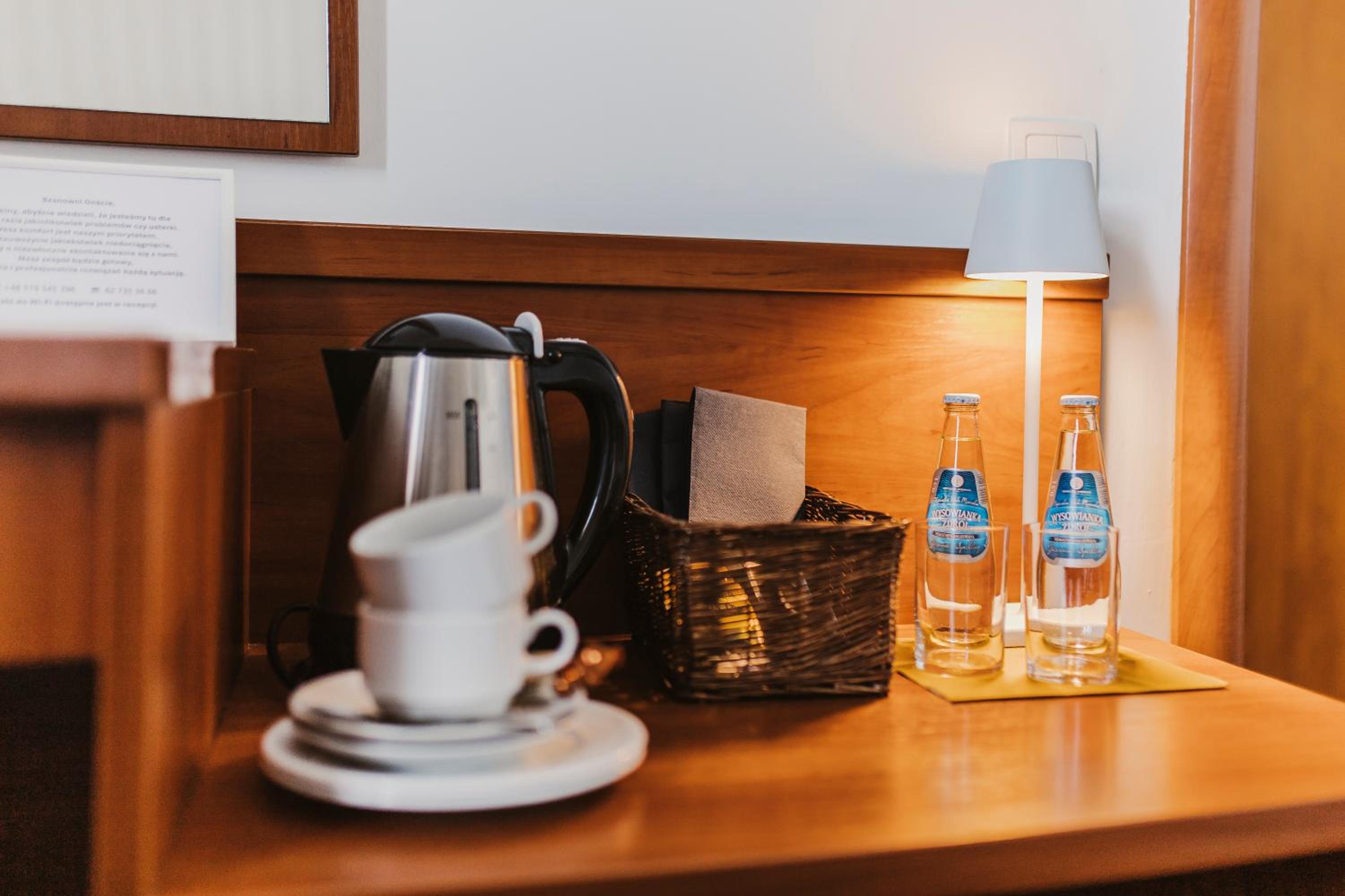 Wygodne materace na łózkach, zestaw do parzenia kawy i herbaty