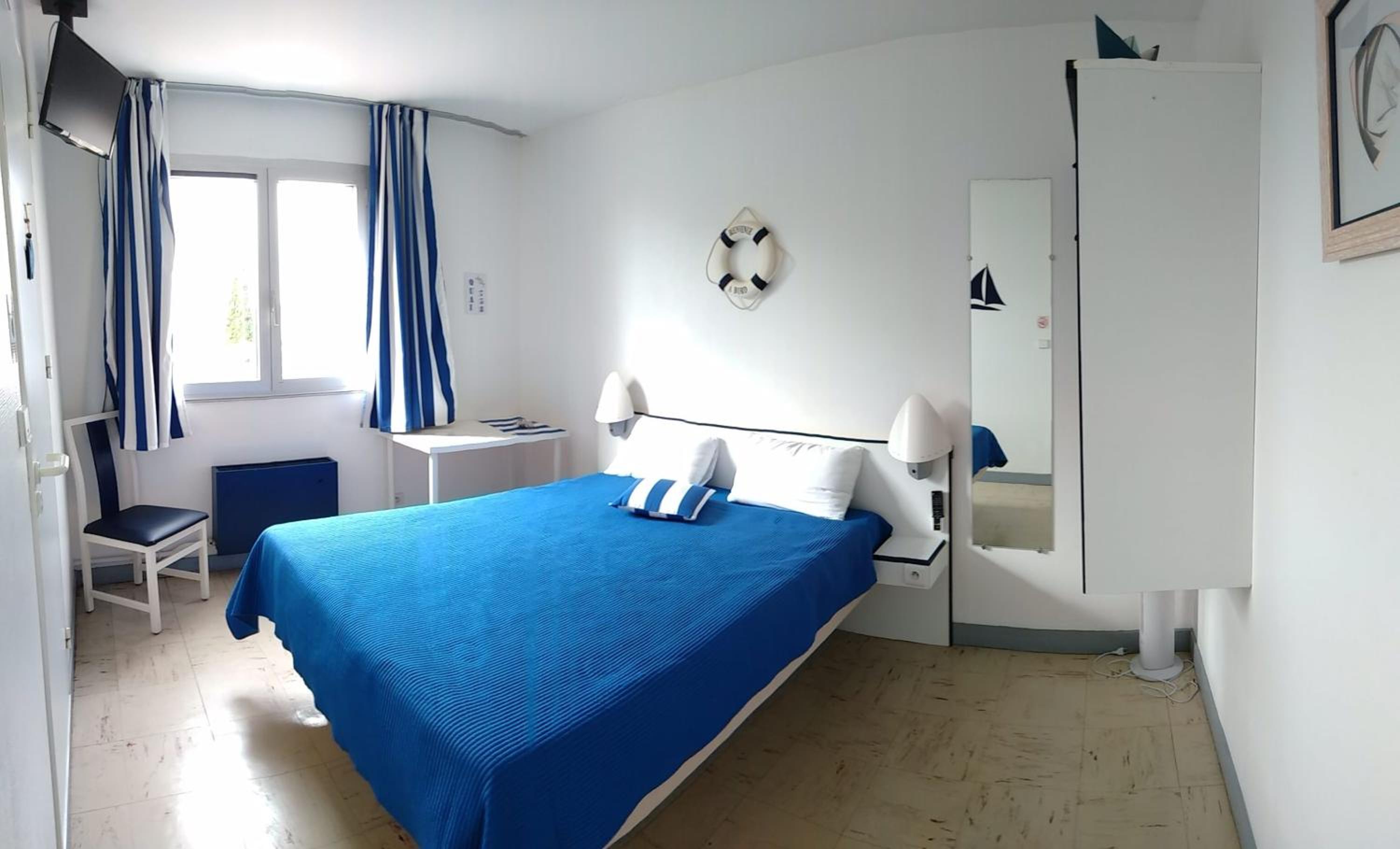 The guest rooms boast a simple yet inviting decor, each equipped with a flat-screen TV and offering views of the lush garden or the quaint village.