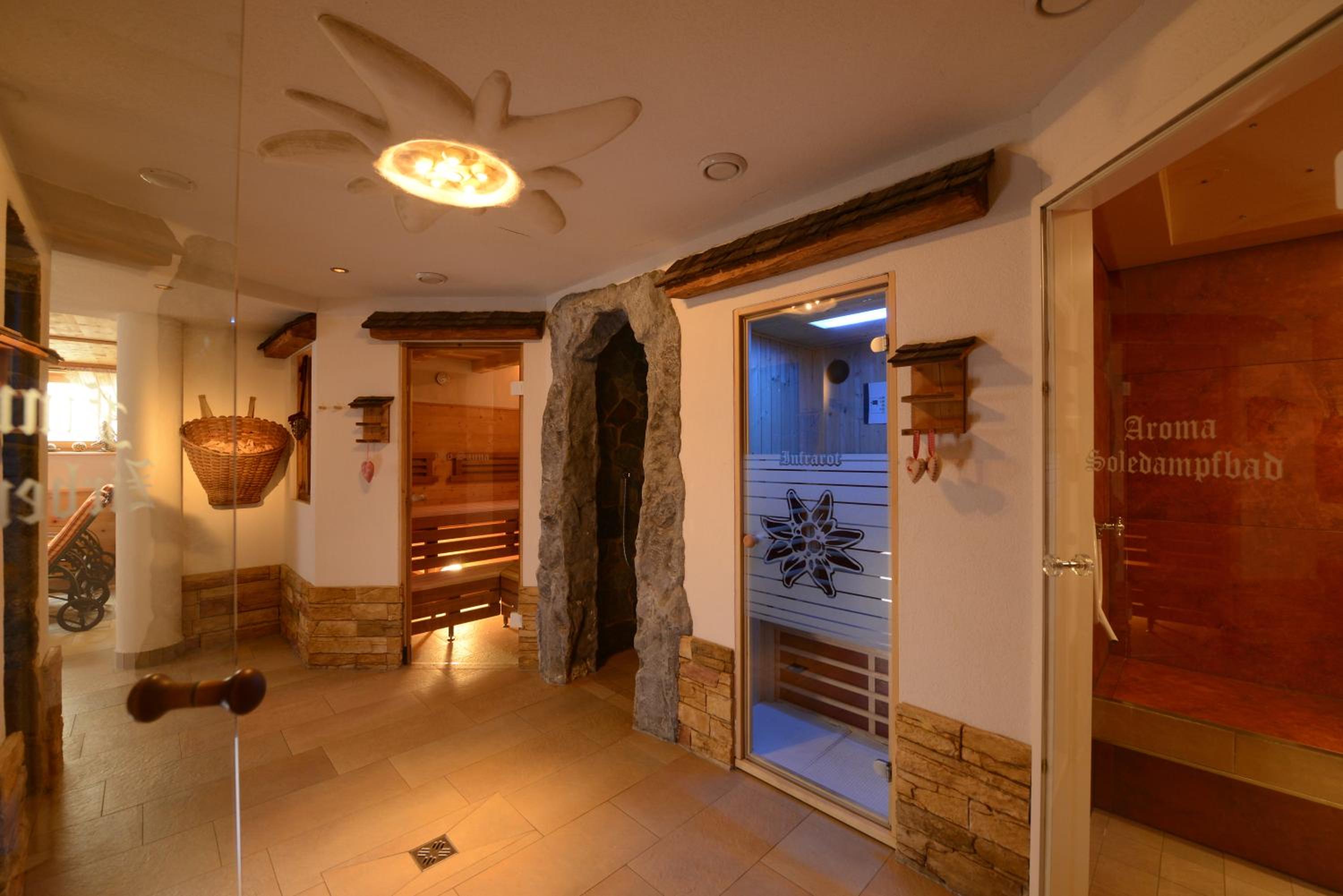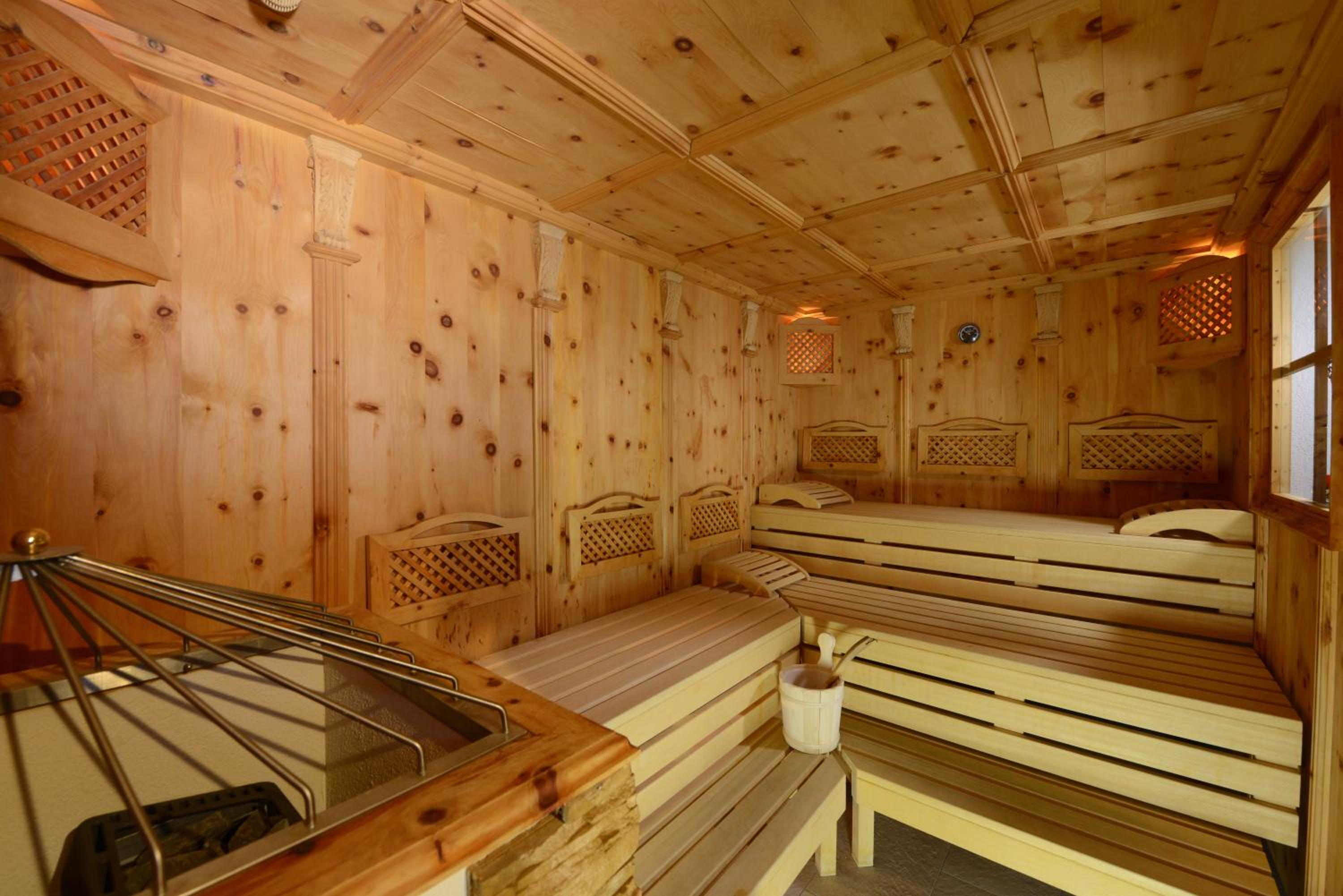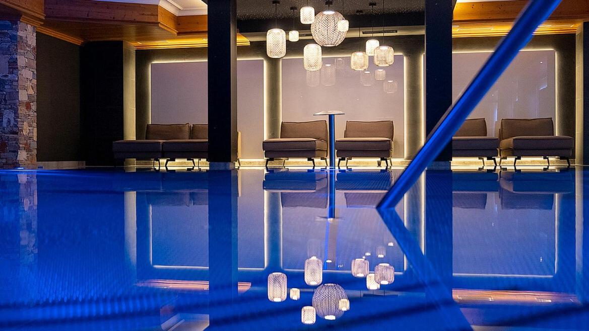 Indulge in relaxation with an infinity indoor pool and a wellness area offering various saunas, sun bed, infrared cabin, and steam bath.