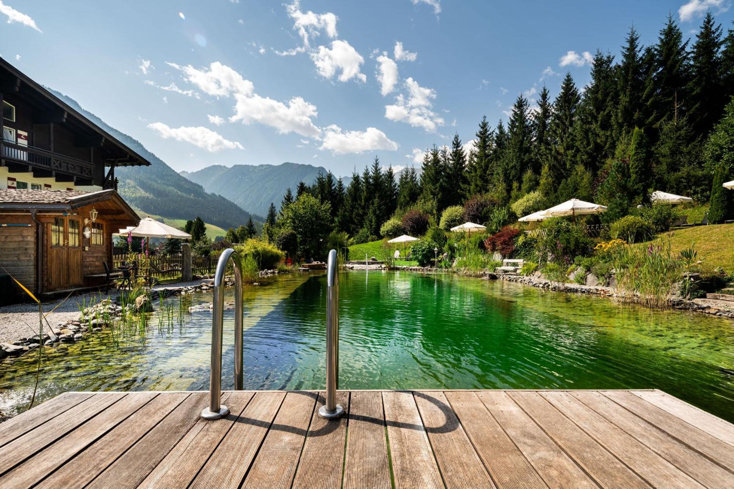 Hotel Hubertus, nestled on the edge of a forest and a stone's throw away from the Wildkogelbahn Cable Car, offers a serene escape with solid wooden furniture rooms, a private bathing pond, and a rejuvenating spa area.