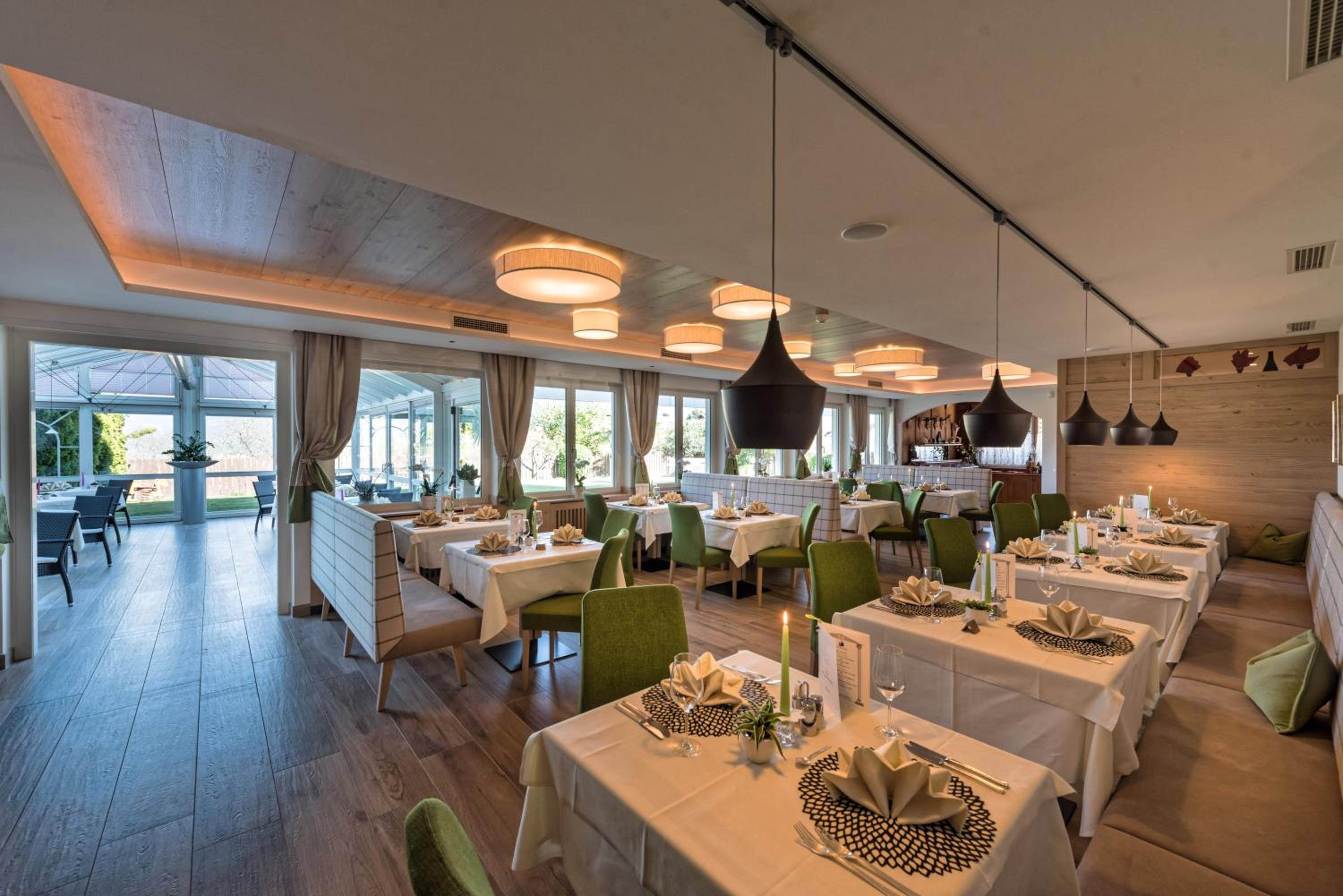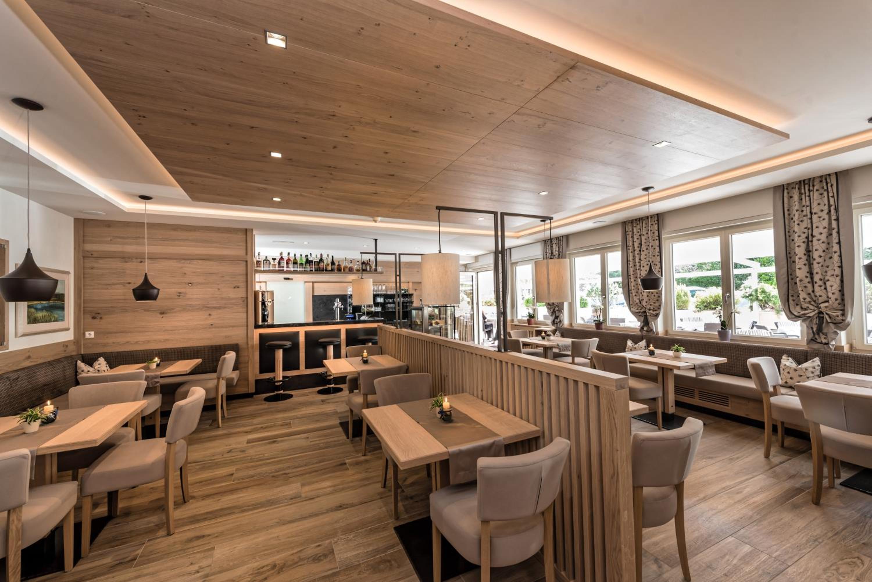 Al piano terra si trovano la sala ristorante e la sala Bar; entrambi gli ambienti sono spaziosi, curati nell'arredo sobrio ma dai toni caldi del Legno, e questo rende la cena e la colazione due momenti piacevoli, dove poter gustare la cucina locale con i tempi giusti, sempre coccolati dalle attenzioni della Sig.ra Heidi, padrona di casa, e dal suo staff di sala.