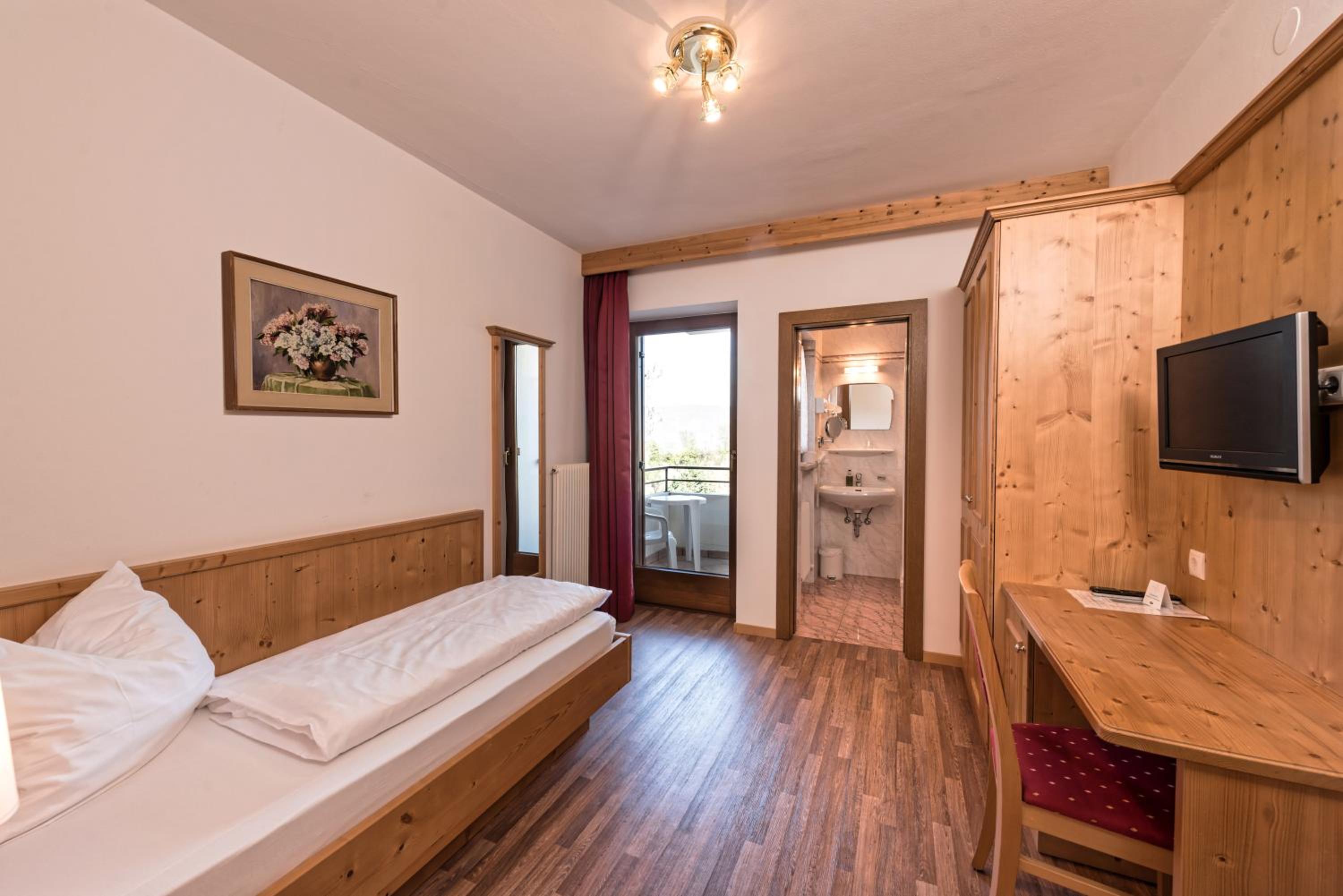 La camera era di dimensioni adeguate, letto matrimoniale comodo, bagno abbastanza grande e uno stupendo balcone fiorito, nel nostro caso con vista sui vigneti lato montagna , con sfondo la chiesa di St.Justina, appunto.. La cura nel dettaglio, nel riordino e la pulizia della stanza, sono degni di nota.