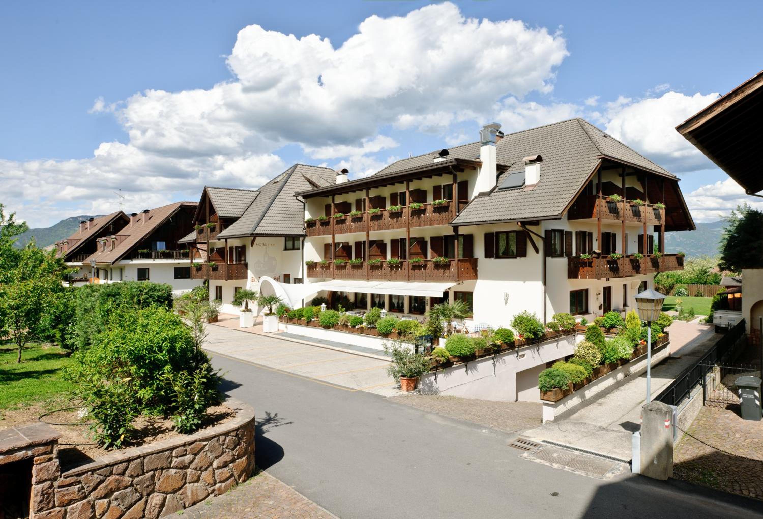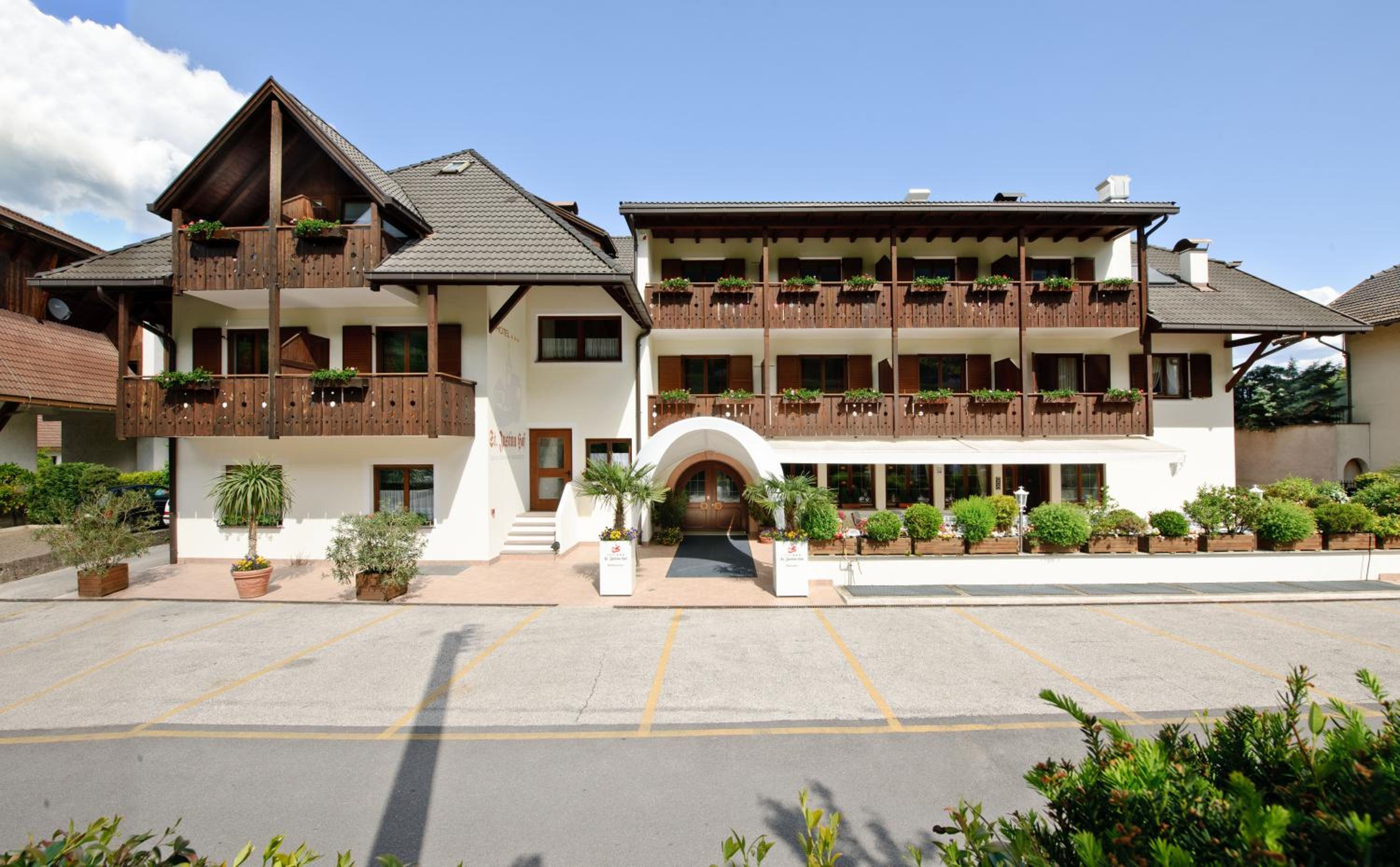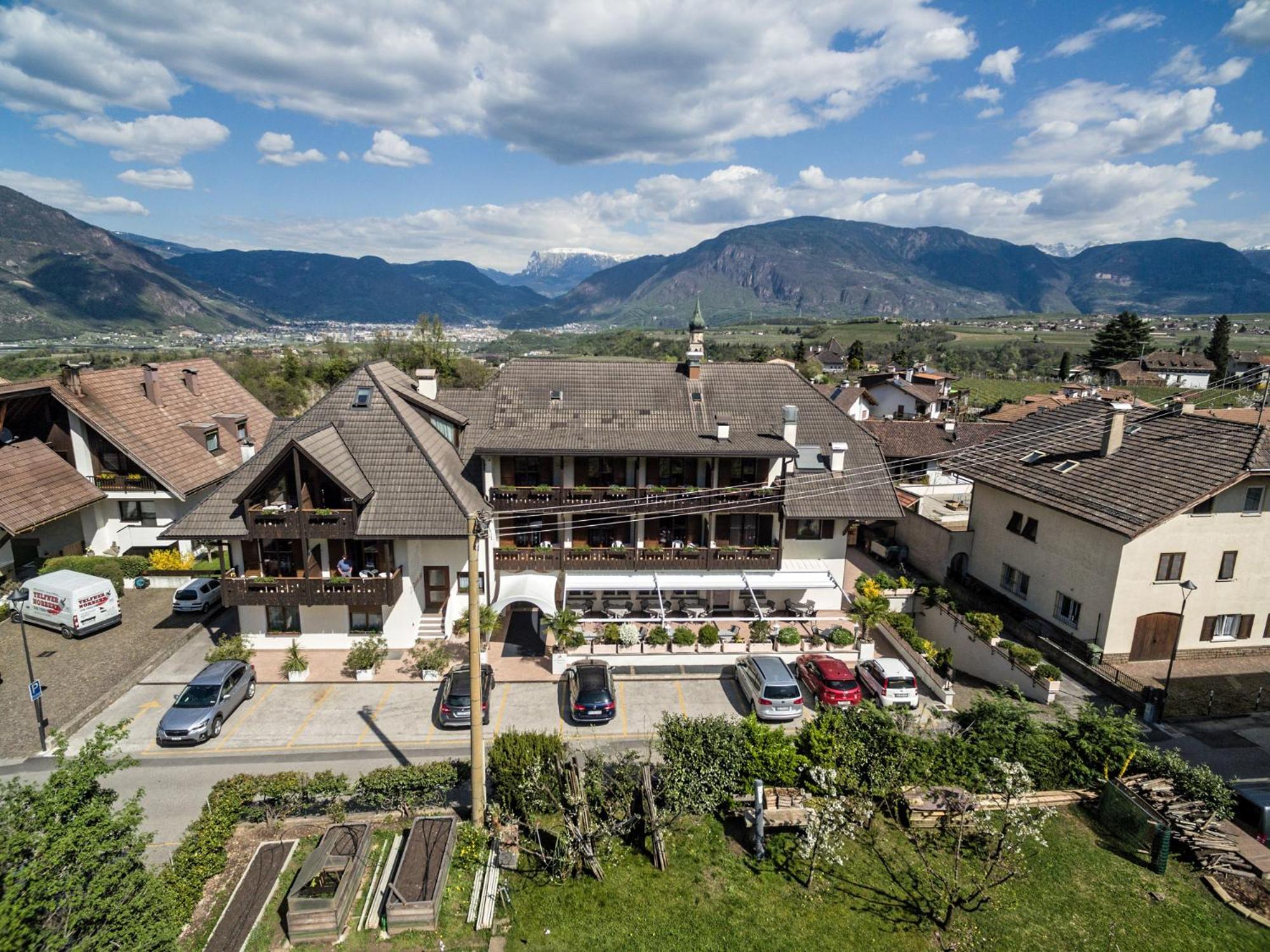 Hotel St. Justina Hof, nestled at 480 metres altitude, offers breathtaking vistas of the mountains and Bolzano. The 600 m² garden provides a serene retreat with sun loungers and a children's playground.