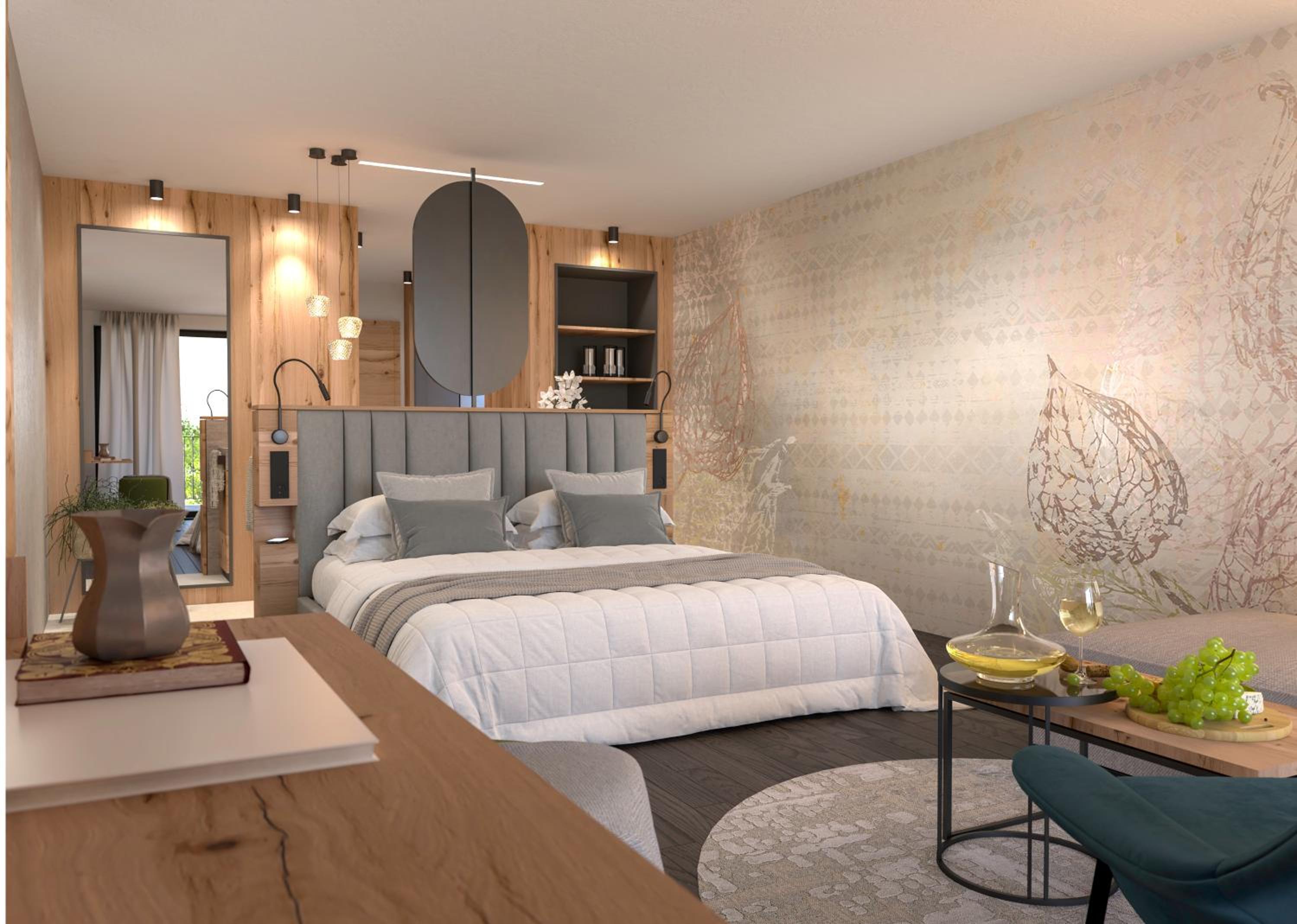 Cozy Alpine-Style Rooms: Experience the charm of Alpine living in rooms featuring exposed-beam ceilings, wood-panelled walls, and mountain-view balconies.