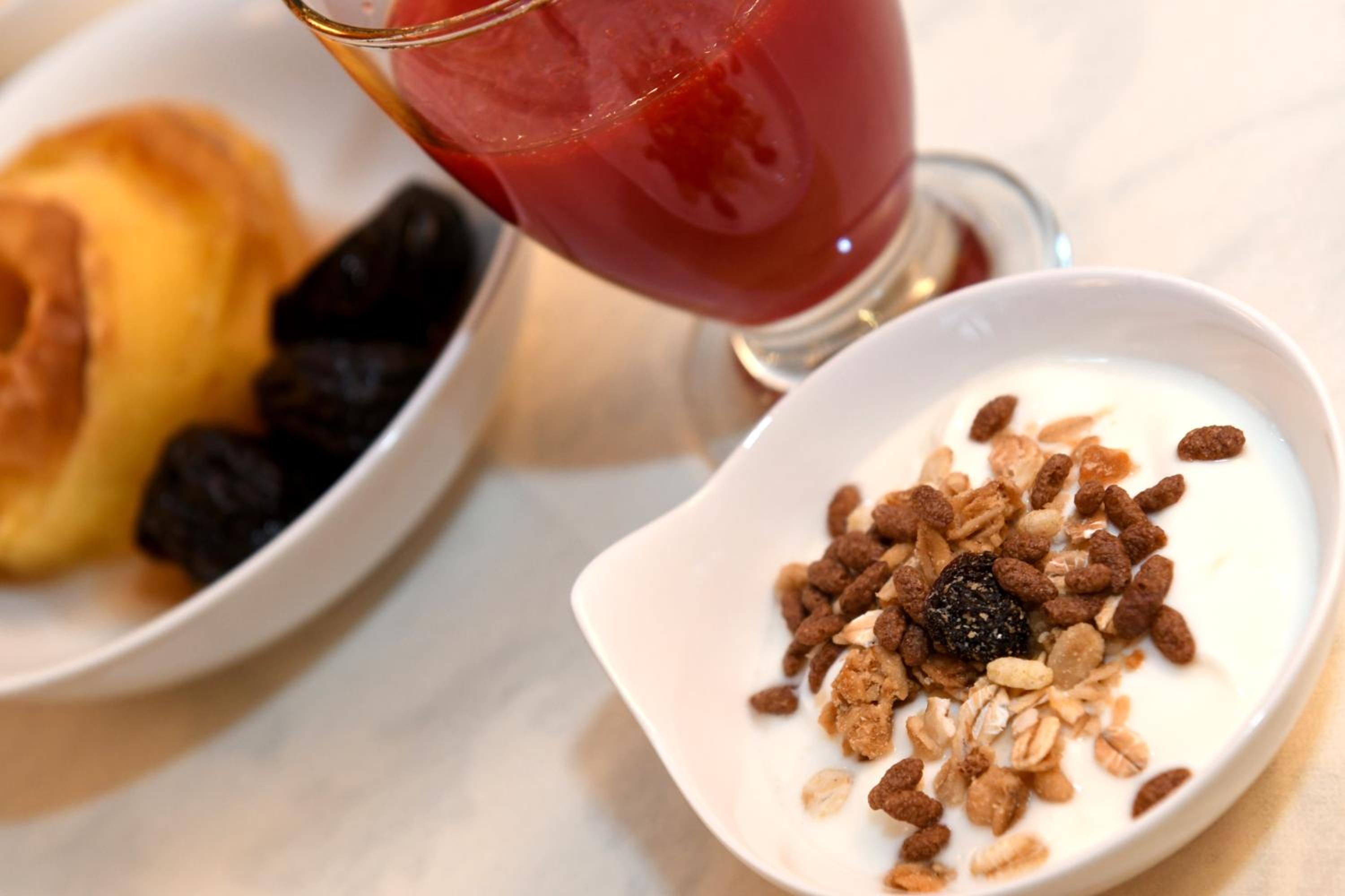 Migliorerei l'offerta della colazione: ad esempio più frutta e prodotti senza lattosio (intendo anche ad esempio latte di soja); ripenserei a come posizionare il bancone con i vari prodotti, com'è ora tende a creare un po' di concentrazione di persone in un unico punto.