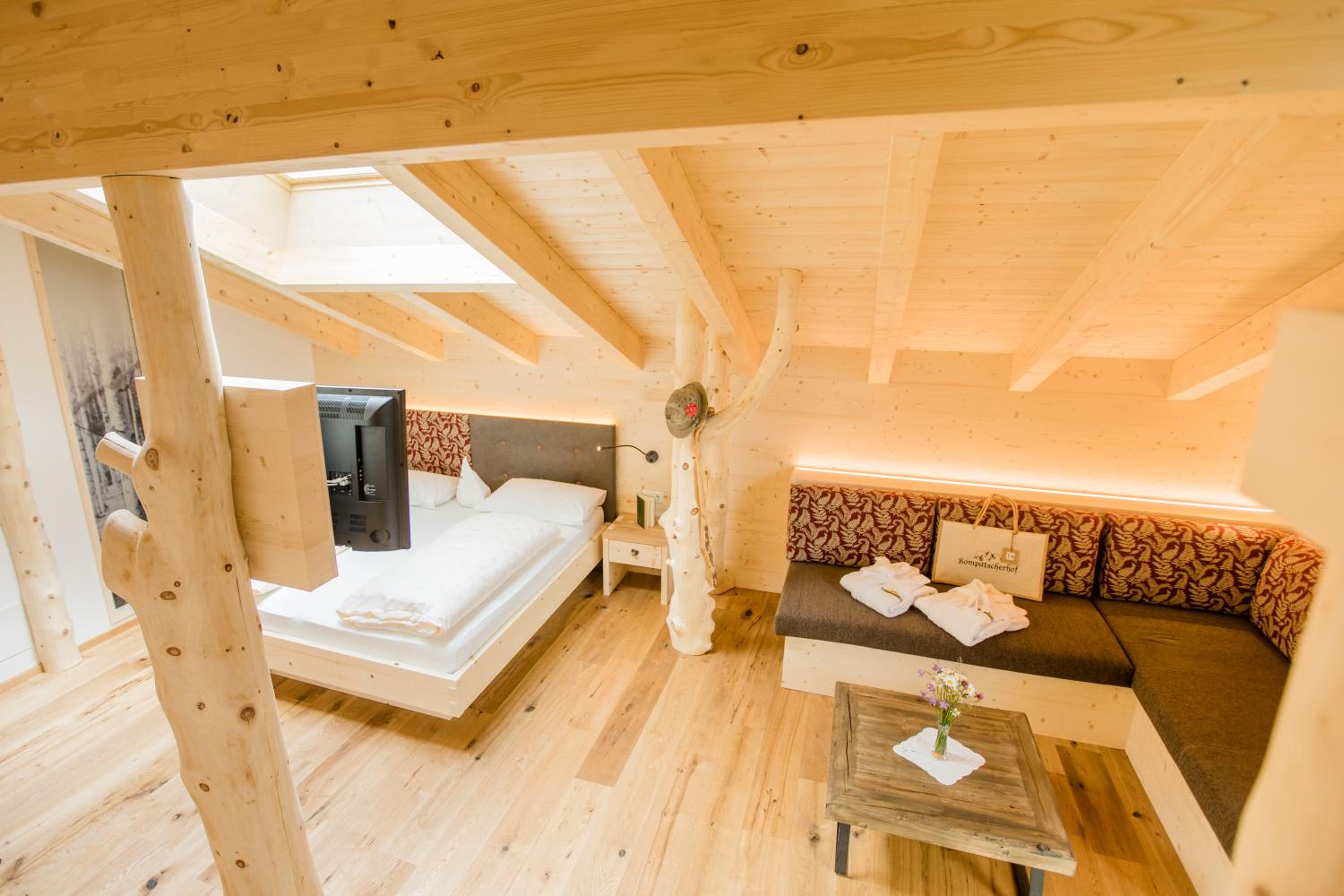 Hotel Kompatscherhof offers rooms and apartments with stunning mountain views and complimentary access to a relaxing sauna. The cozy rooms feature parquet floors and LCD TVs, while the apartments, adorned with natural materials, provide a unique stay just 200 meters from the main building.