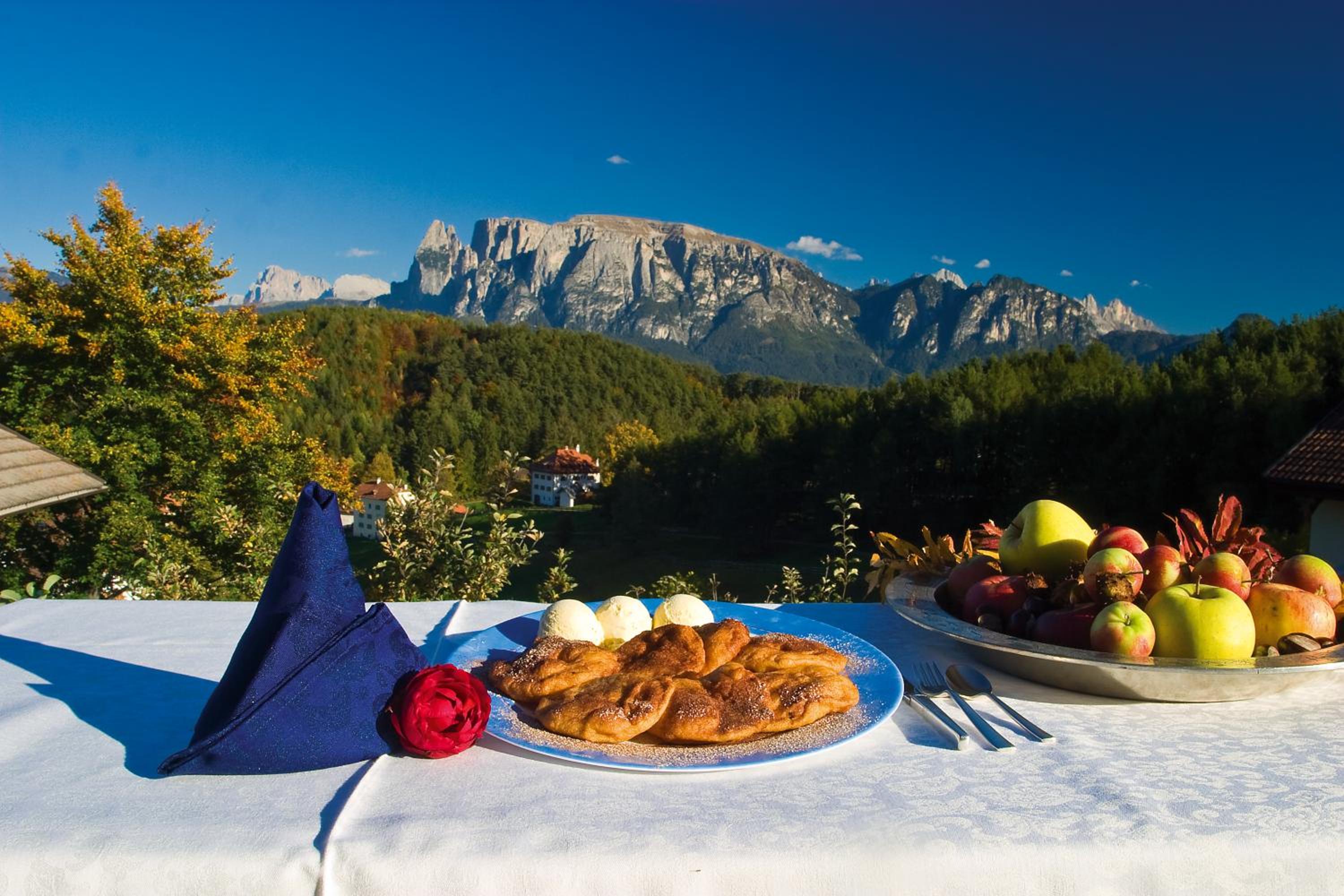 Indulge in a delicious buffet breakfast with eggs, local cheeses, and homemade cakes, served outdoors for a refreshing start to the day. For dinner, guests can enjoy South Tyrol specialities and Mediterranean cuisine in the exclusive restaurant reserved for hotel guests.