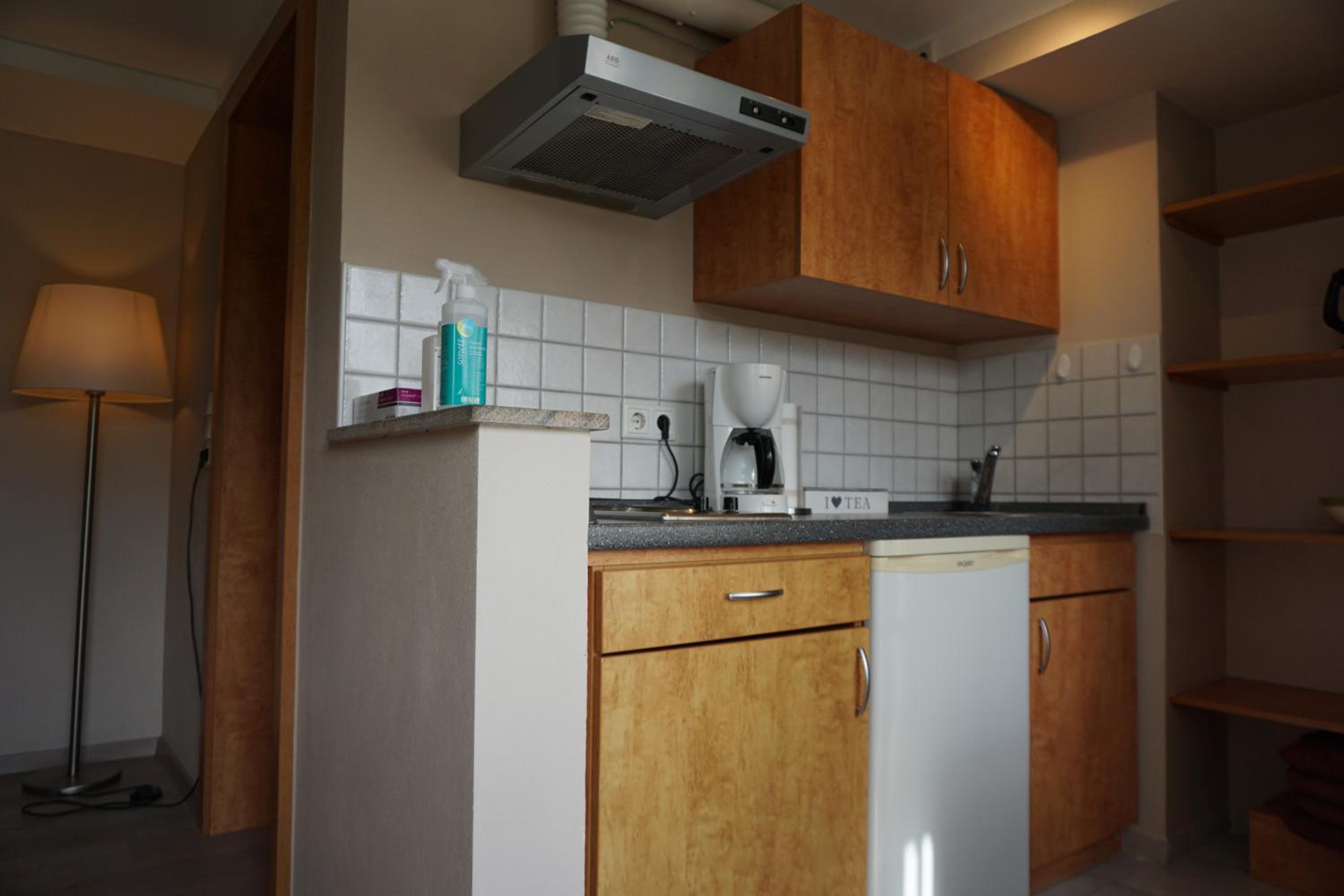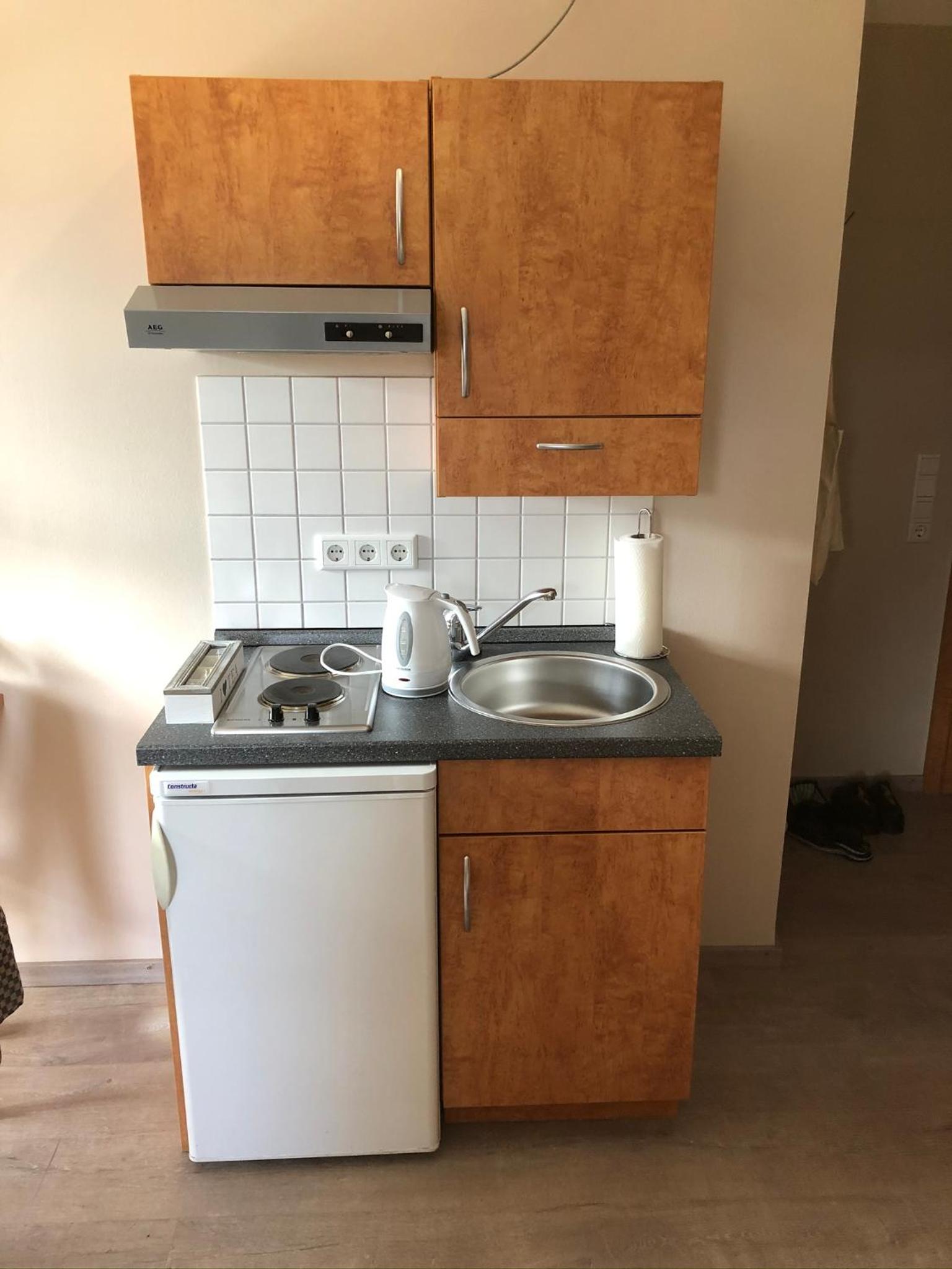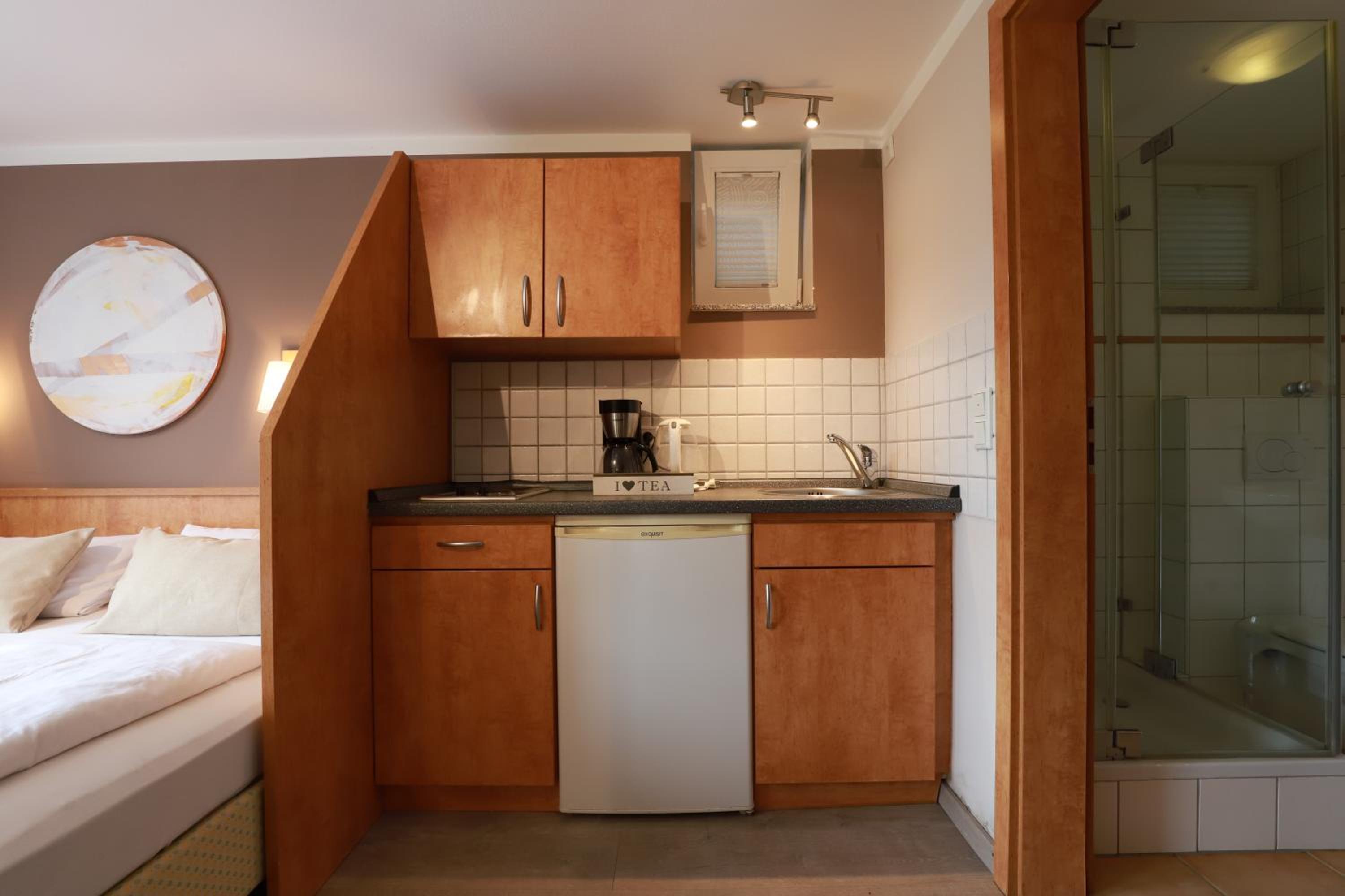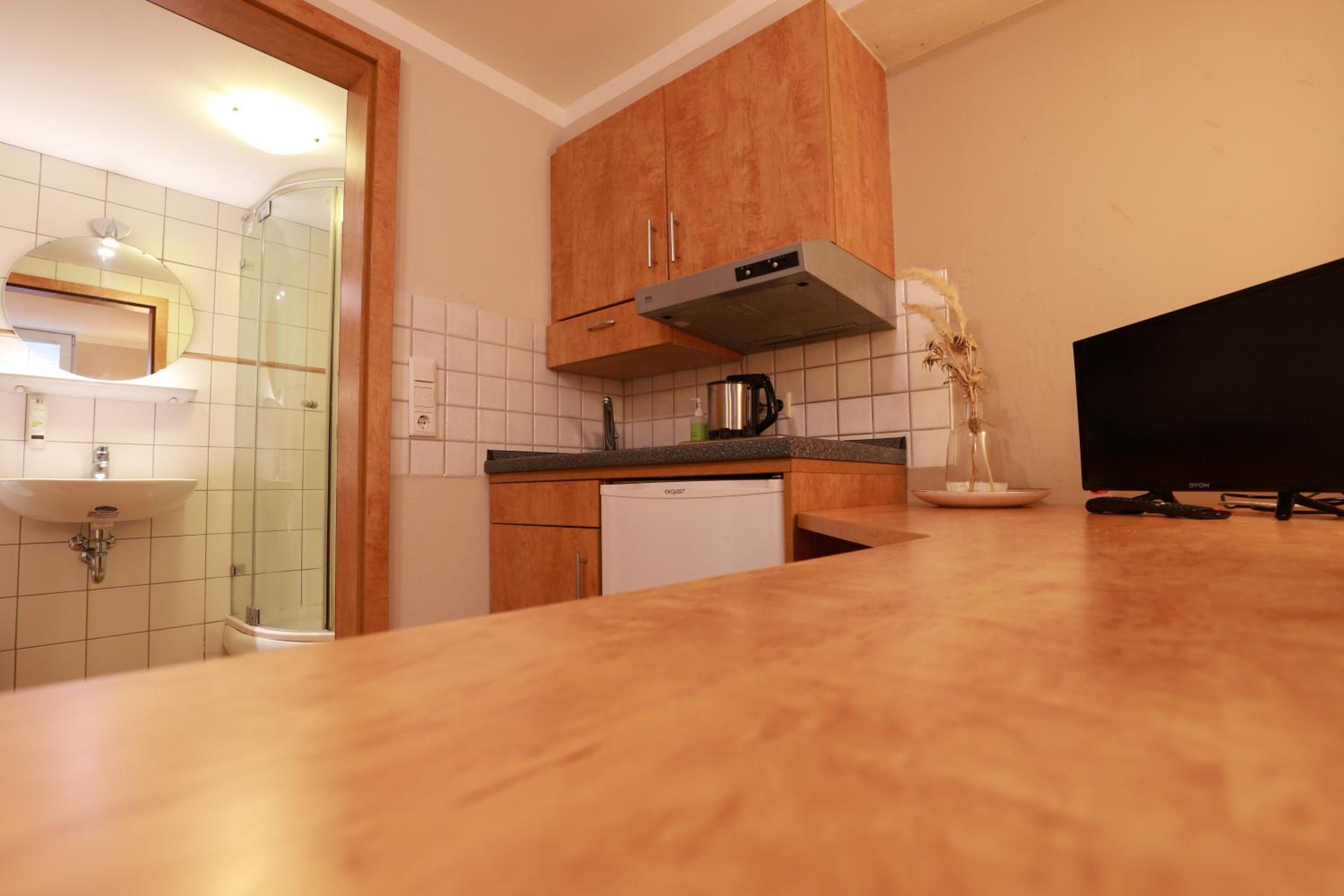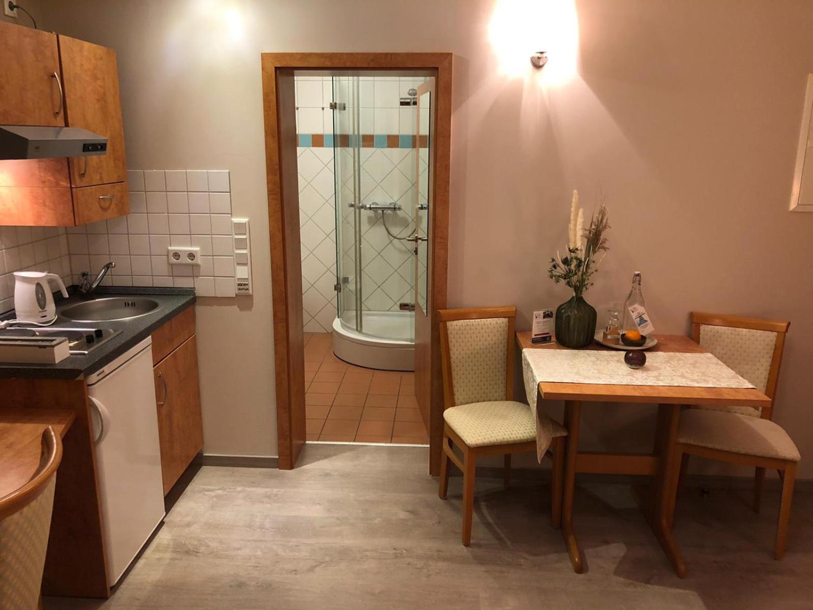 Frühstück kein Buffet aber erst klassig! Kleine Küchenzeile, gut ausgestattet. Daunenkissen im Bett! Einkaufsmöglichkeiten in der Nähe.
