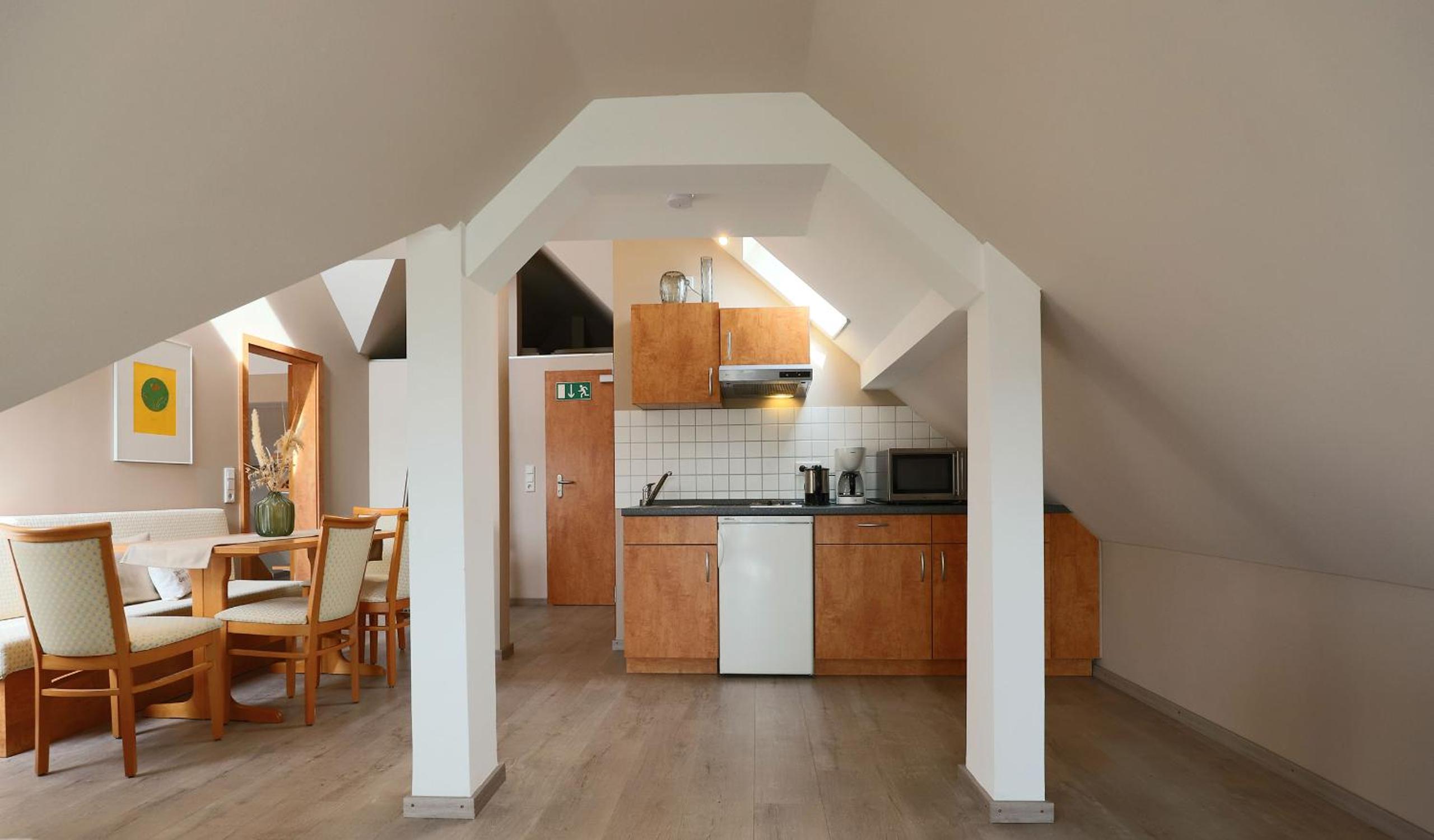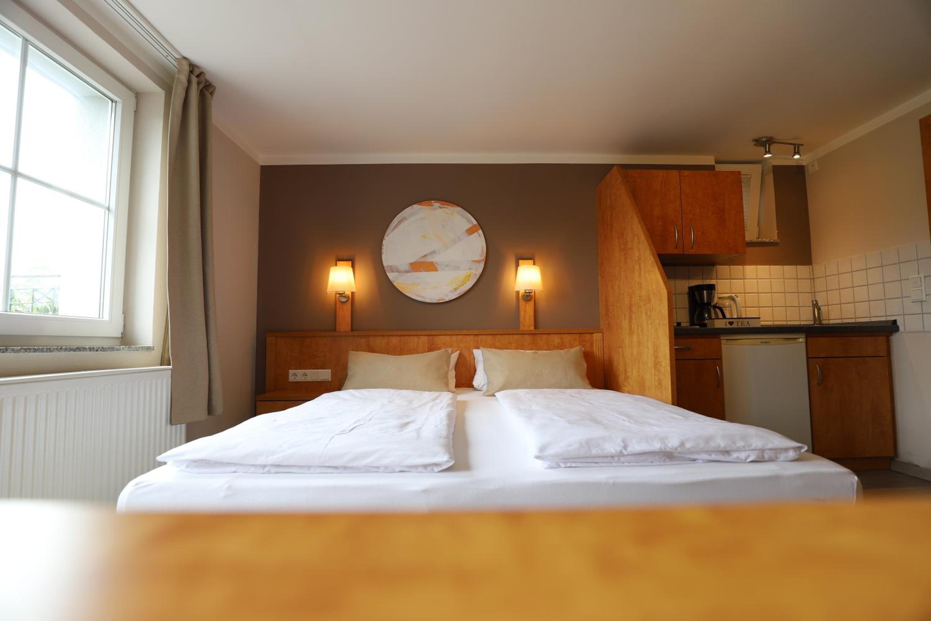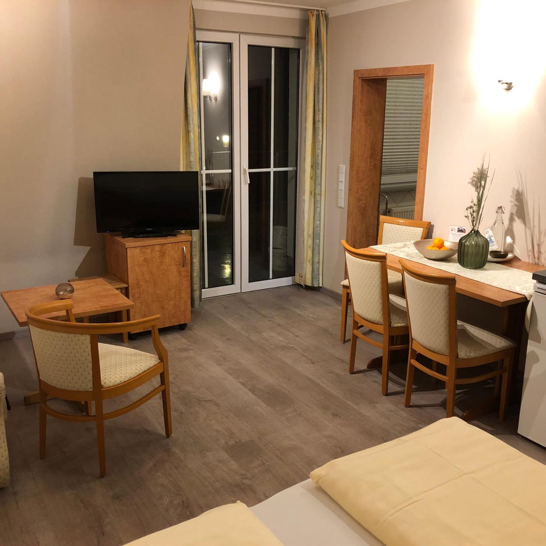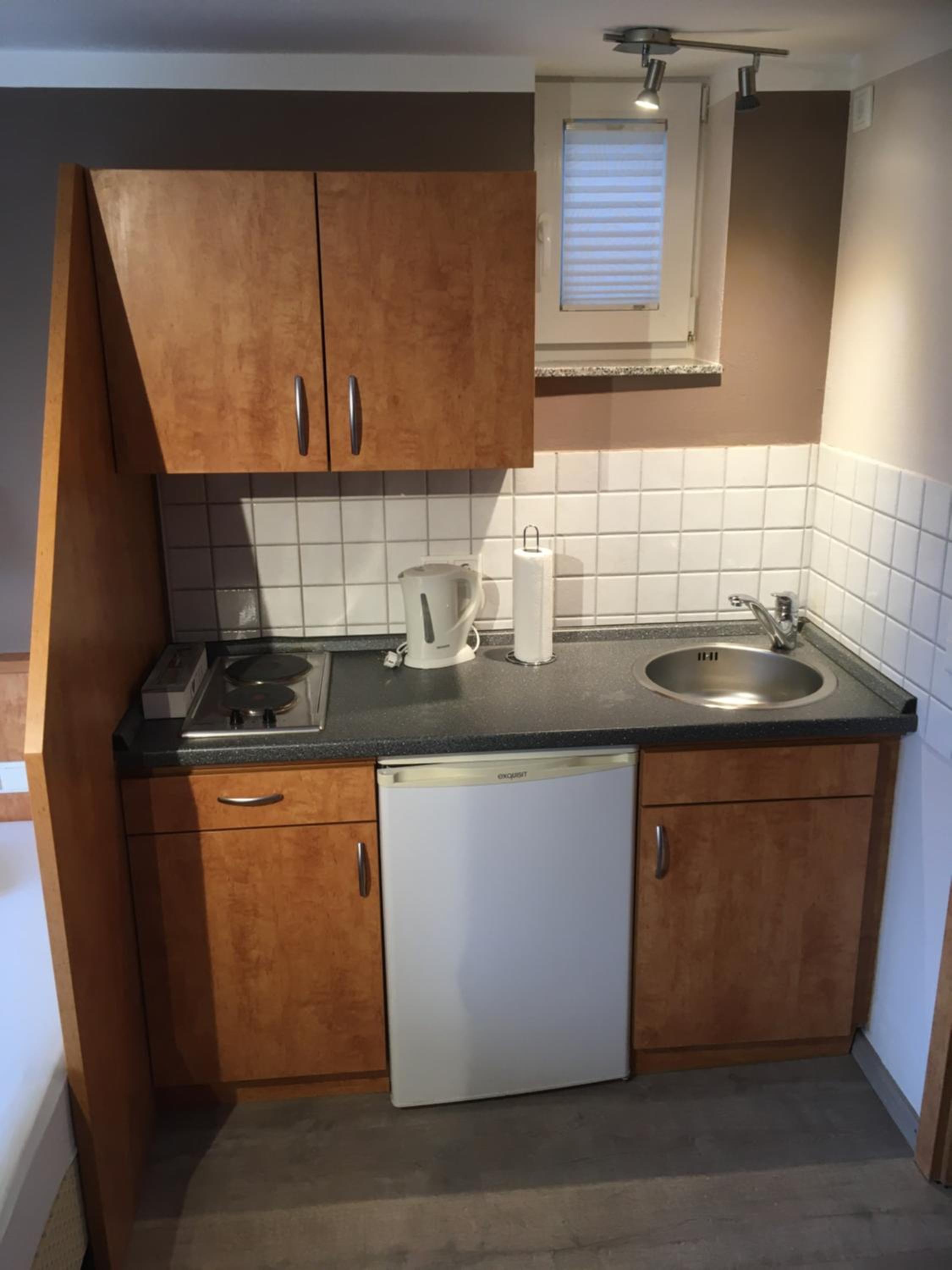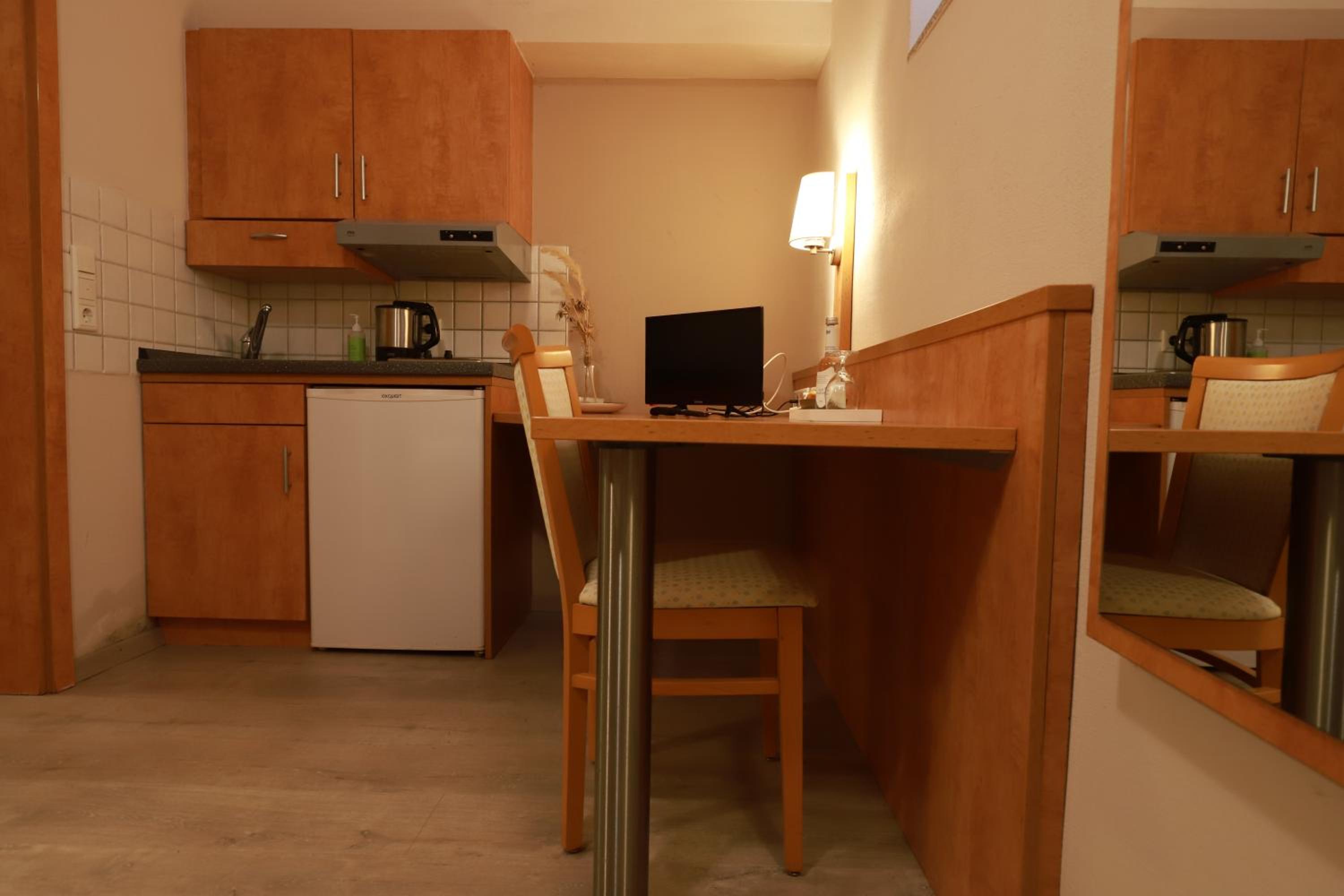Frühstück kein Buffet aber erst klassig! Kleine Küchenzeile, gut ausgestattet. Daunenkissen im Bett! Einkaufsmöglichkeiten in der Nähe.