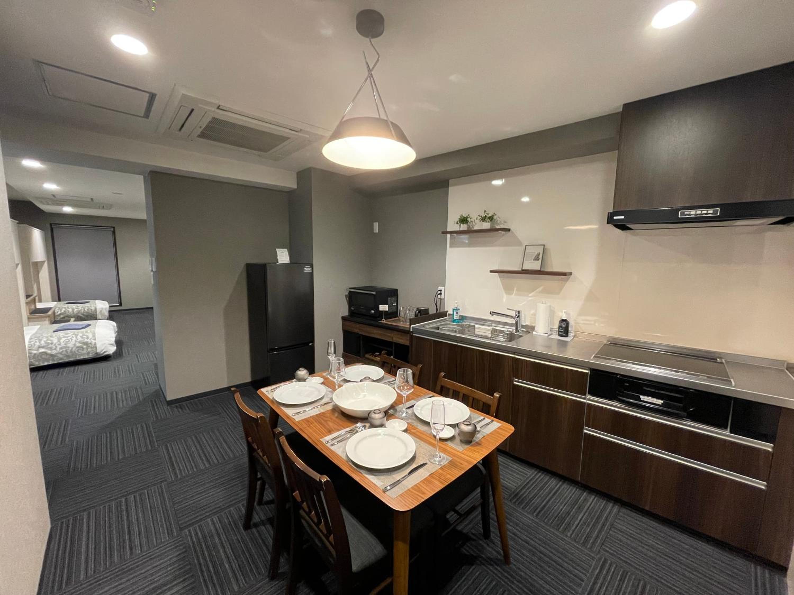 Stayed with 2 adults and 3 kids (pre-teens, teen), Great location, 5 minute walk to Sensoji and markets, right next to metro line with easy access throughout Tokyo, 711 right next door for easy snacks, Asakusa line with direct train to Haneda is 10 minute walk, great room, very comfy, laundry a big plus, they had a private hot tub you can rent (we used it for no charge) which mimics a traditional onsen, quiet location despite being so close to Sensoji, would highly recommend this spot