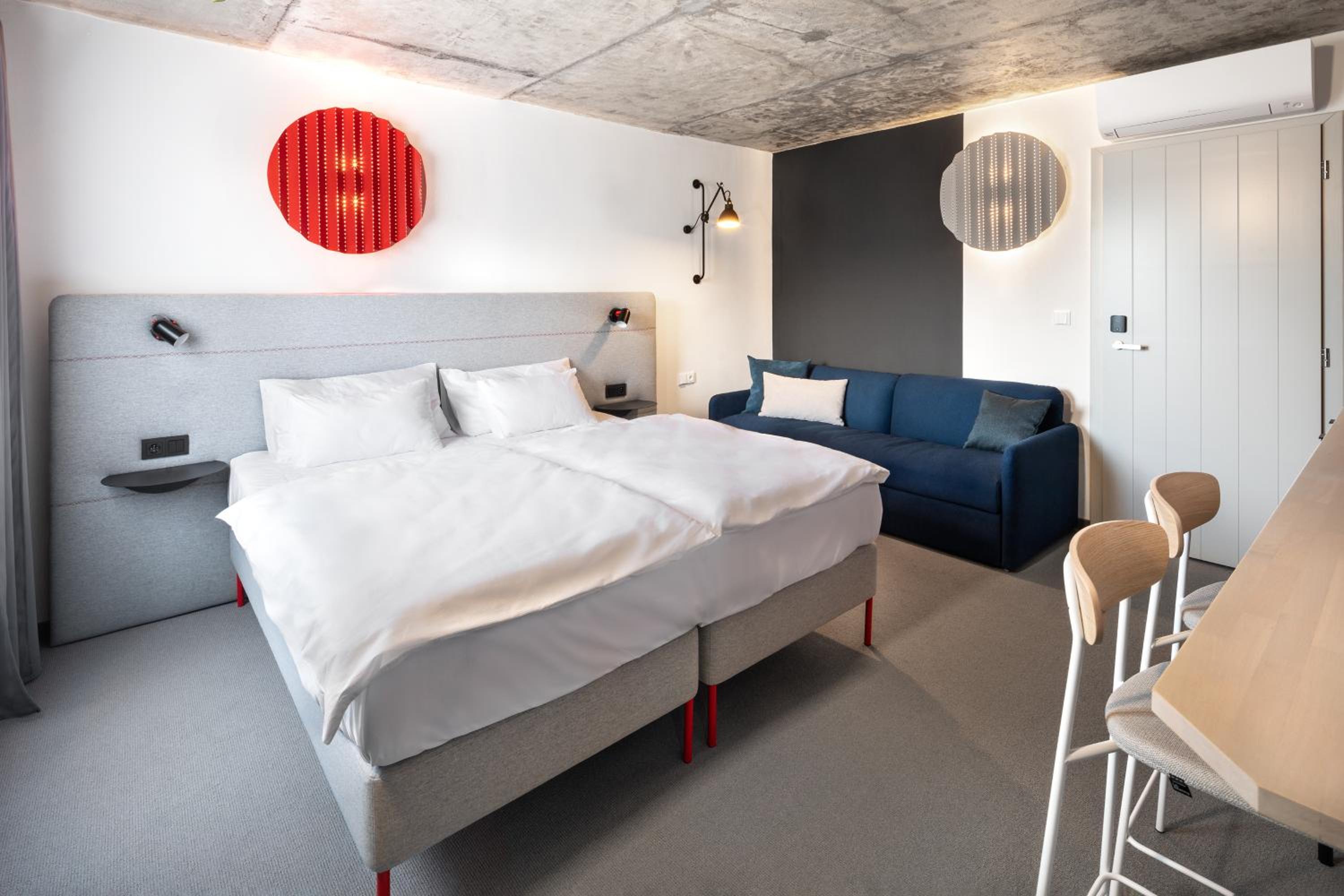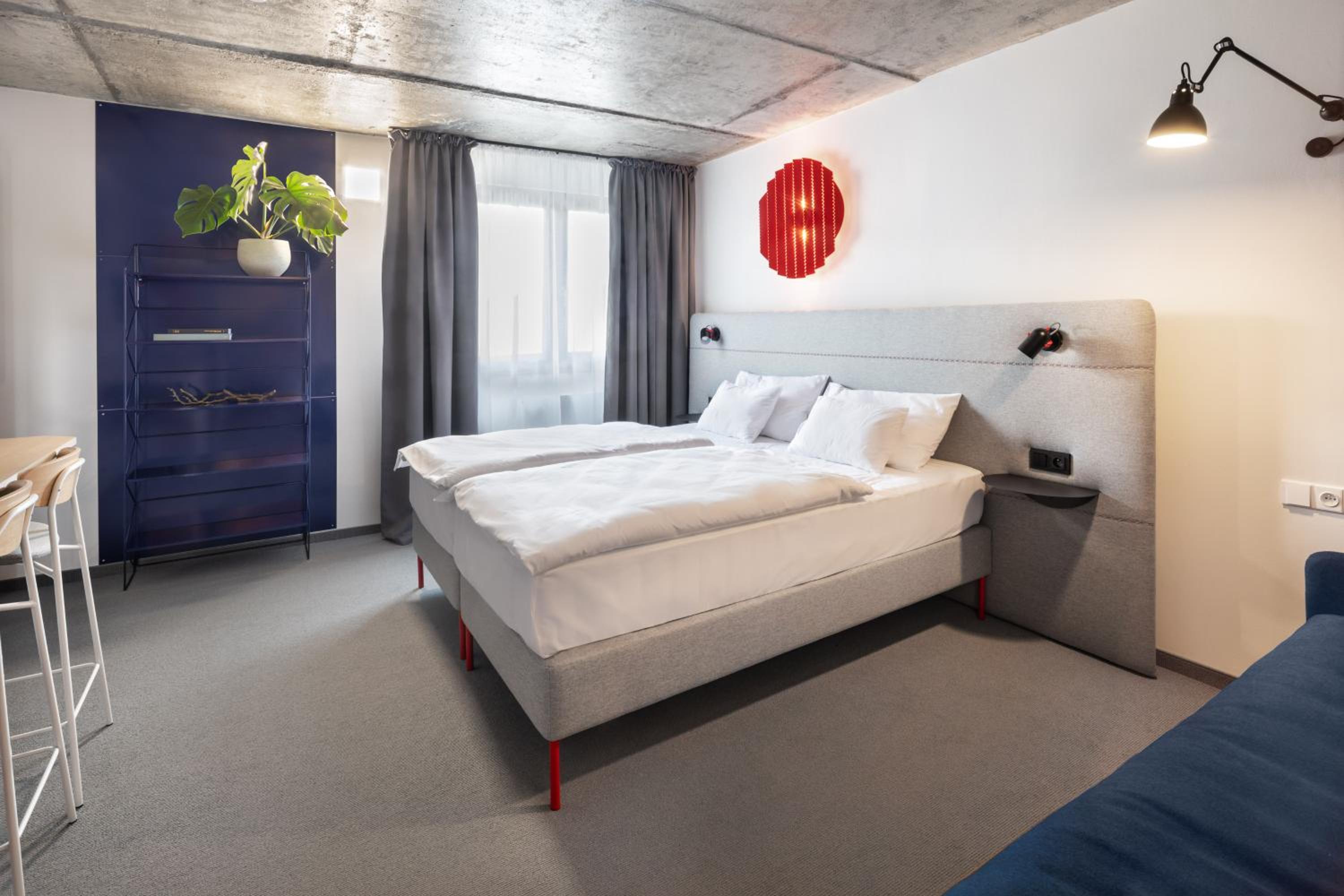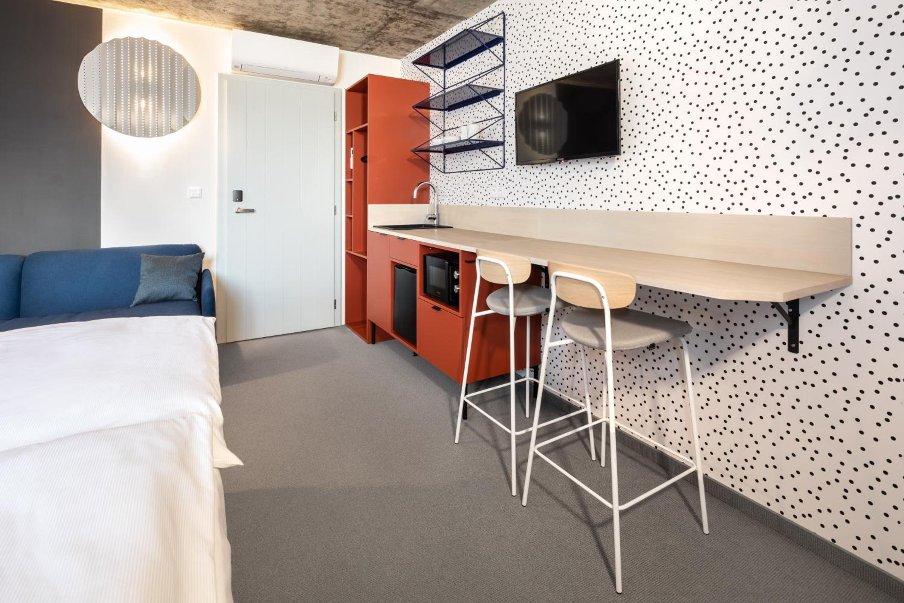 V pokoji vše prakticky a funkčně do detailu vyřešeno, nikde nechybí možnost na uložení potřeb nebo zavěšení čehokoliv. Zároveň v provedení sladěném s celým designem pokoje/hotelu. Pokoj útulný, pohodlný, klidná lokalita. Snídaně výborná, bohatá, podávaná s úsměvem.