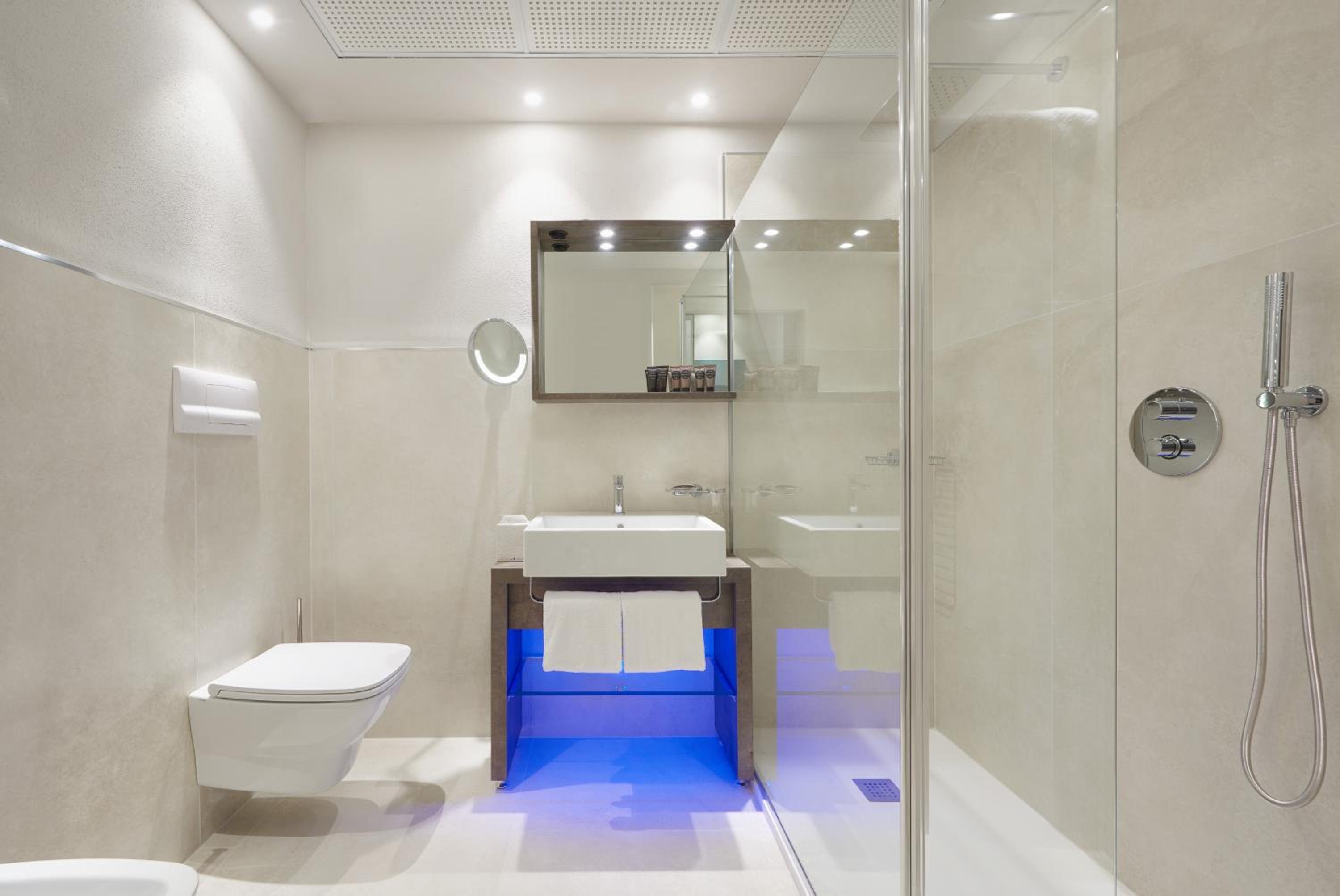 Badezimmer mit grosszügiger Dusche, aber beim Lavabo etwas wenig Ablagefläche.