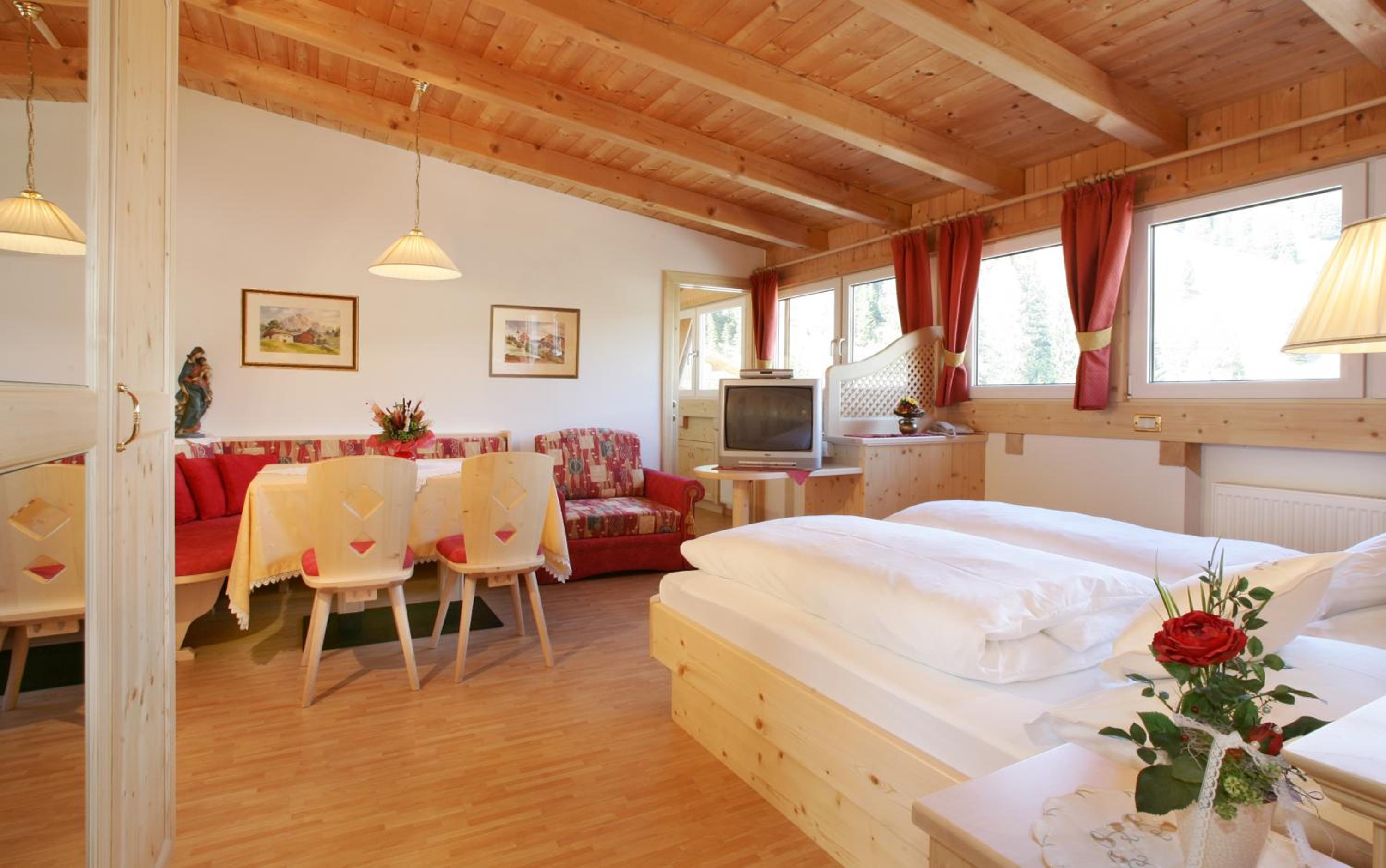 Experience the cozy Alpine-style rooms at Garni Schenk, featuring a balcony, satellite LCD TV, and picturesque Dolomite or garden views. The exposed-beam ceilings and carpeted floors add a touch of traditional charm to your stay.